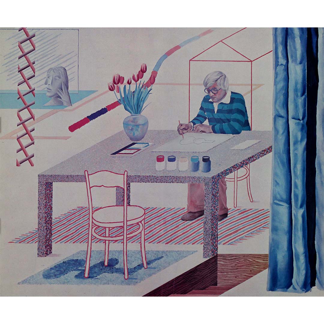 Réalisé avec l'audace et le dynamisme caractéristiques de Hockney, cet autoportrait dégage une impression d'assurance et d'introspection. Le regard confiant et la posture détendue de l'artiste traduisent une profonde sérénité et une contemplation subtile, invitant le spectateur à explorer les complexités de sa personnalité et de sa vision artistique.