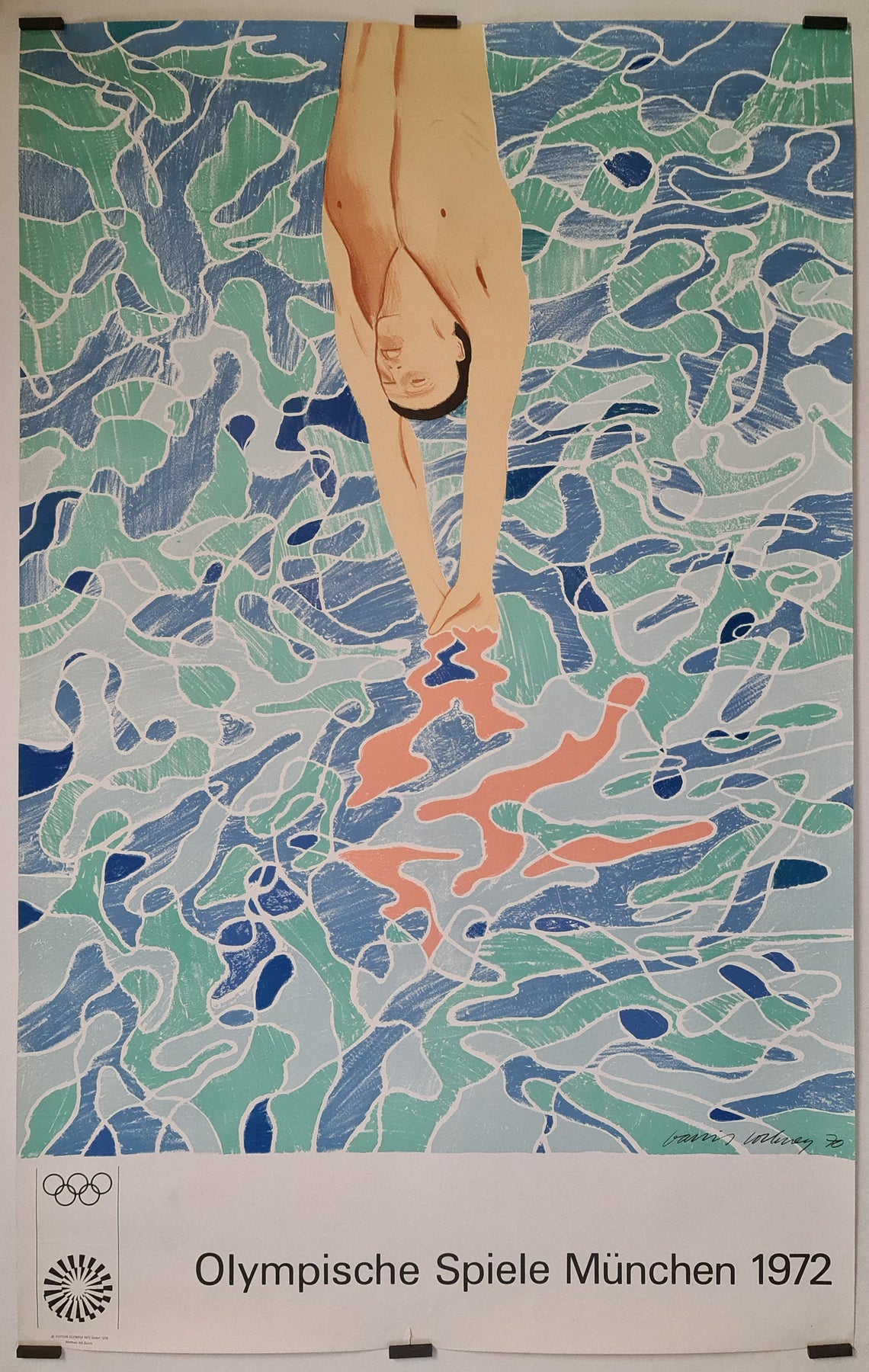 Cette affiche des Jeux olympiques de Munich, représentant un plongeur et signée par l'artiste David Hockney, fait partie d'une série d'affiches réalisées par divers artistes populaires de l'époque (Peter Phillips, Horst Antes, Otl Aicher, David Hockney, entre autres) chargés de concevoir les affiches des Jeux olympiques de 1972 en Allemagne pour leur campagne publicitaire, qui visait à « représenter l'entrelacement du sport et de l'art dans le monde entier ».