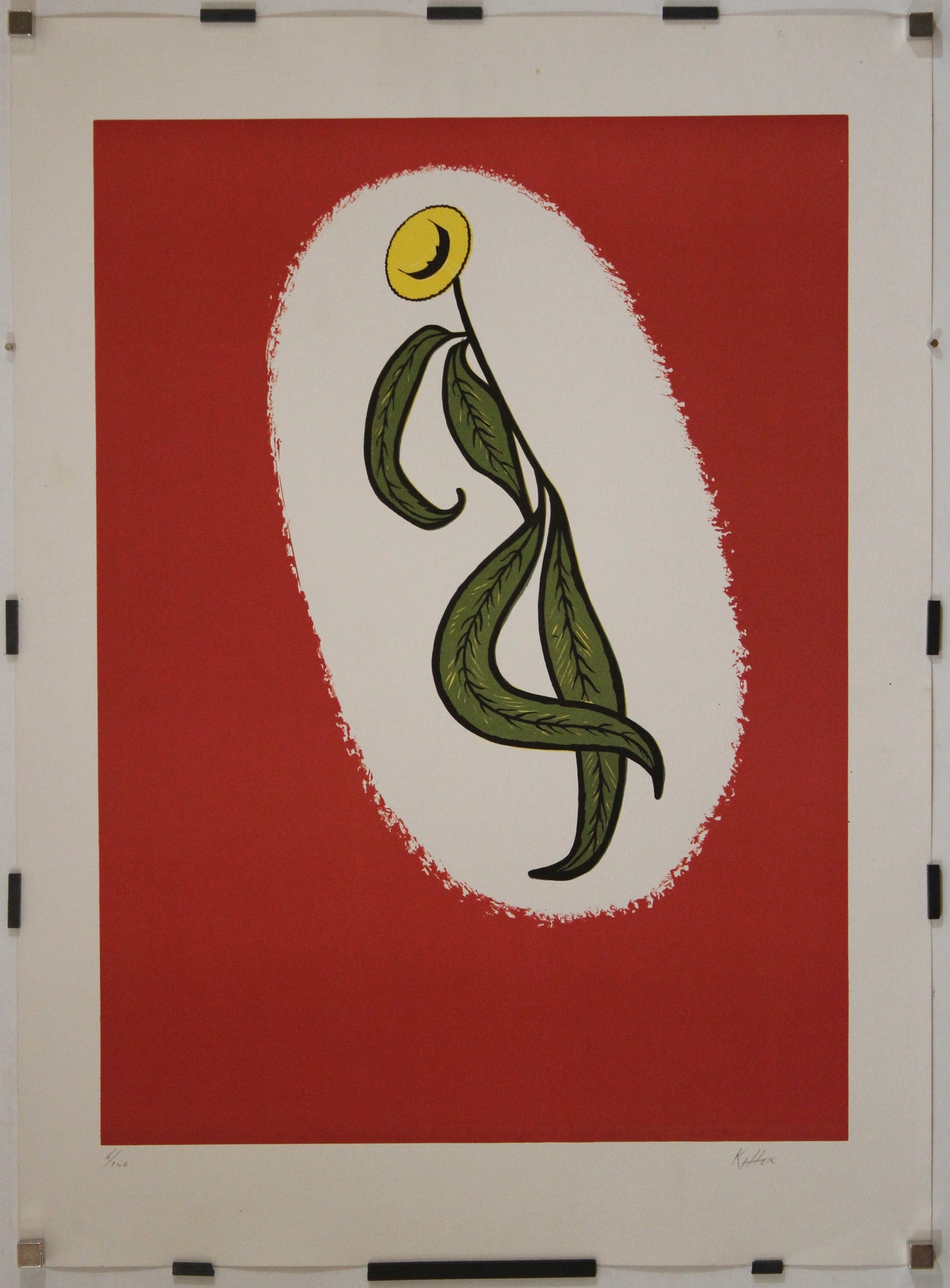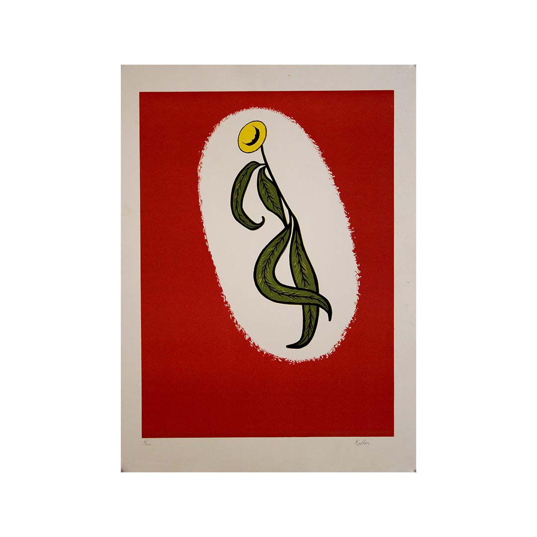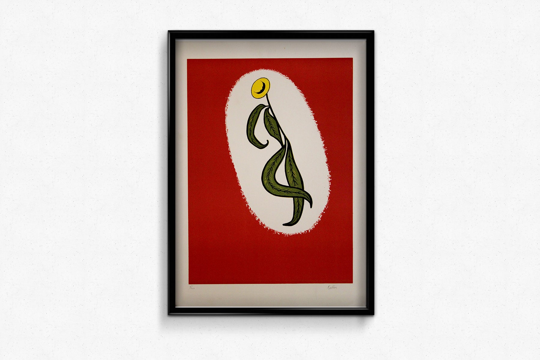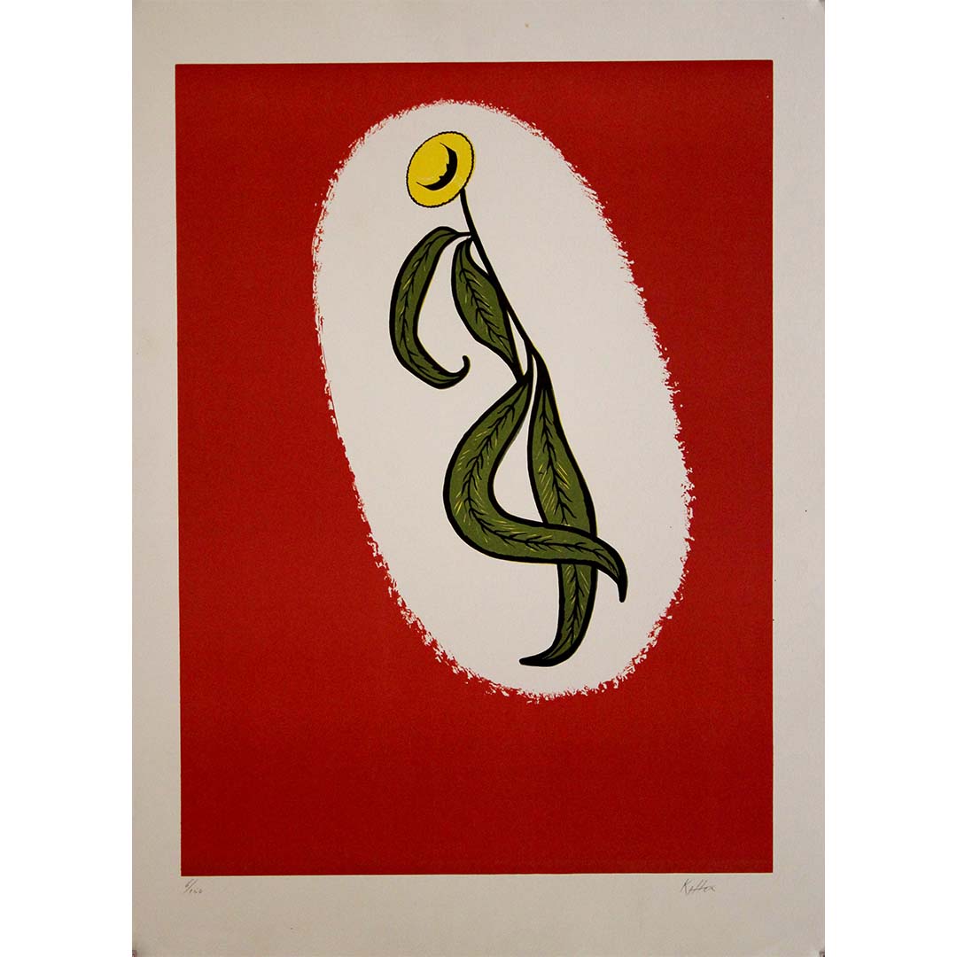 Kiffer, célèbre pour ses affiches et ses œuvres célébrant les arts de la scène, délaisse le portrait pour explorer une interprétation imaginative de Maurice Chevalier. La lithographie représente une plante verte gracieuse, stylisée de courbes fluides et presque musicales, s'élevant vers une fleur jaune éclatante. La forme organique de la plante suggère vitalité, croissance et résilience – qualités profondément associées à la brillante carrière de Chevalier. L'éclosion joyeuse de la fleur évoque peut-être le canotier emblématique de Chevalier et l'optimisme solaire qui caractérisait ses performances.