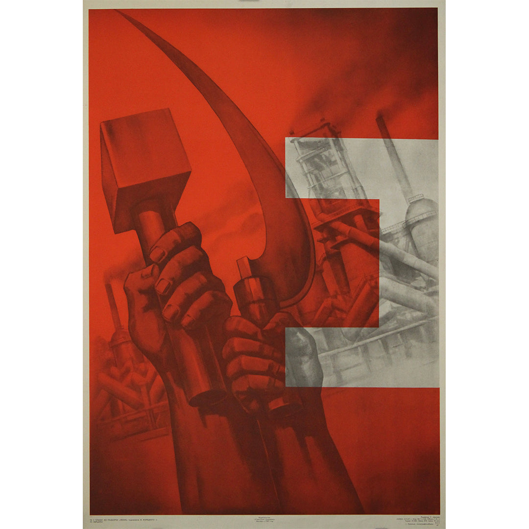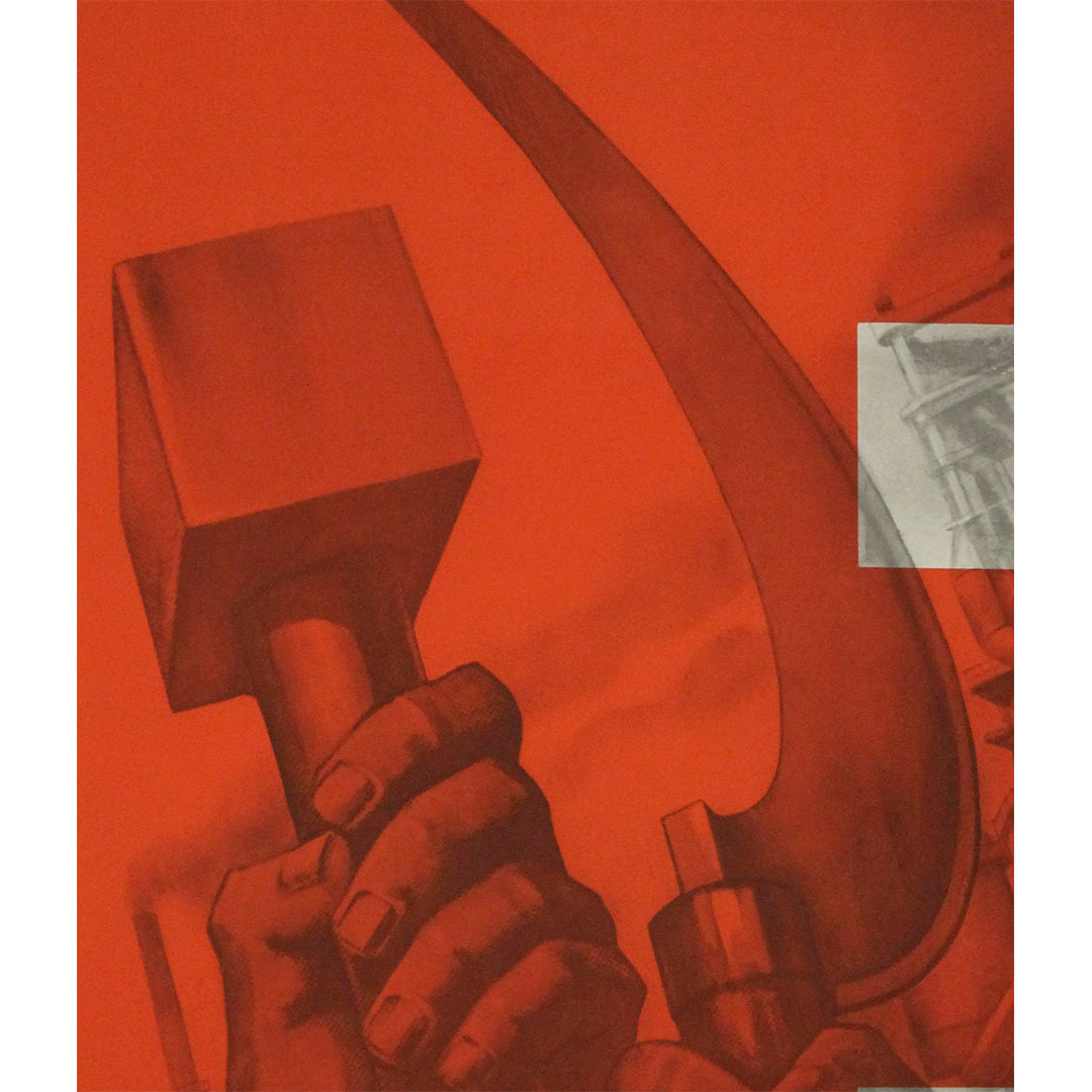 Au centre : deux mains colossales empoignant la faucille et le marteau, symboles du travail et de l'unité. Koretsky les représente avec un réalisme quasi sculptural : musclées, résolues, forgées dans le creuset du progrès. Derrière elles, une aciérie partiellement désaturée se profile au loin, comme submergée par le flot pourpre de l'idéologie. Le rouge n'est pas qu'une couleur : il est mouvement, élan, mission.