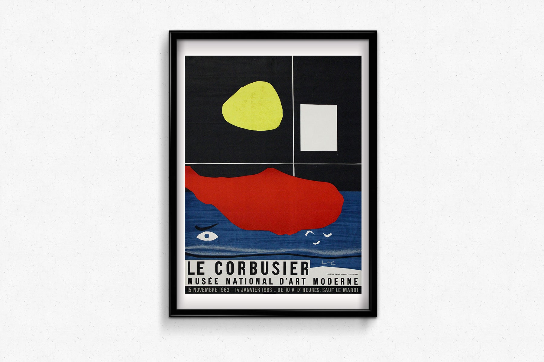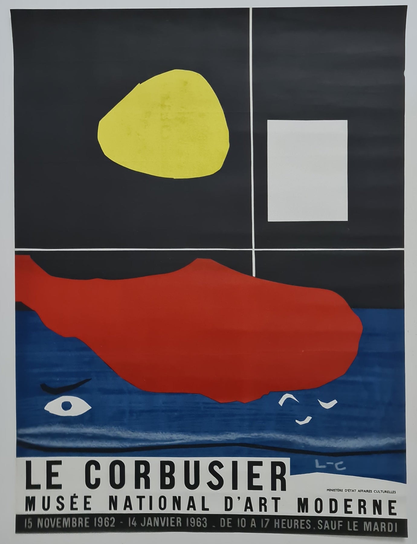 Cette affiche originale saisissante a été conçue par Le Corbusier lui-même pour promouvoir son exposition de 1962-1963 au Musée national d'Art moderne de Paris. Bien plus qu'un simple architecte, Le Corbusier était aussi peintre, sculpteur et designer, et cette affiche témoigne avec audace de son langage visuel moderniste.