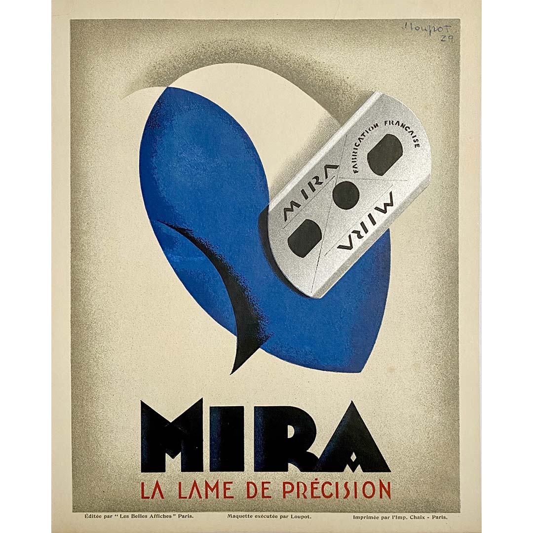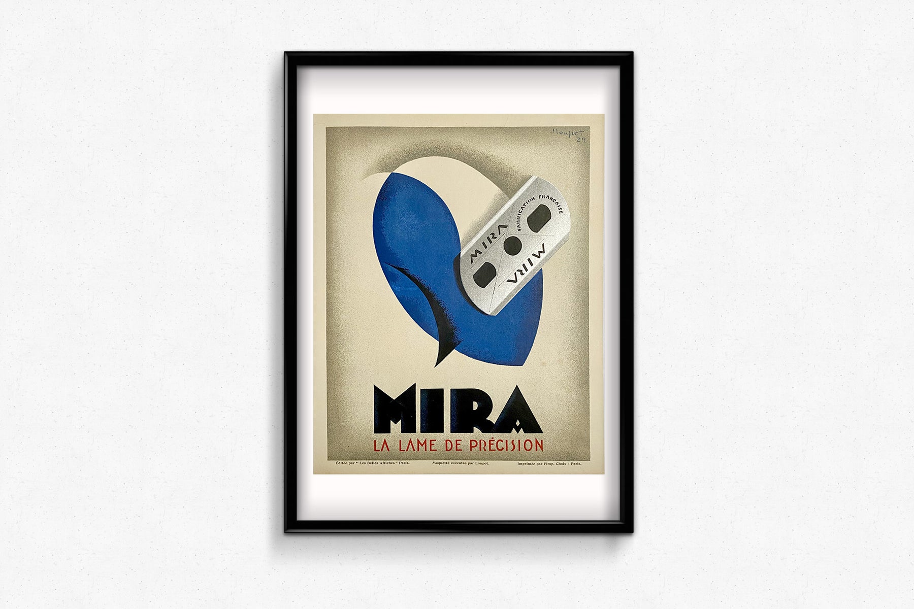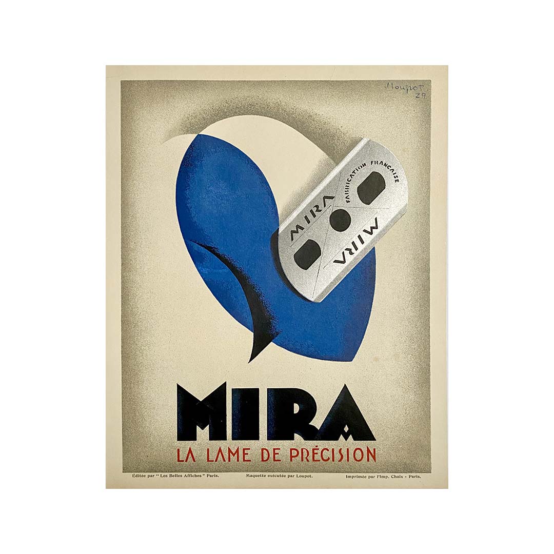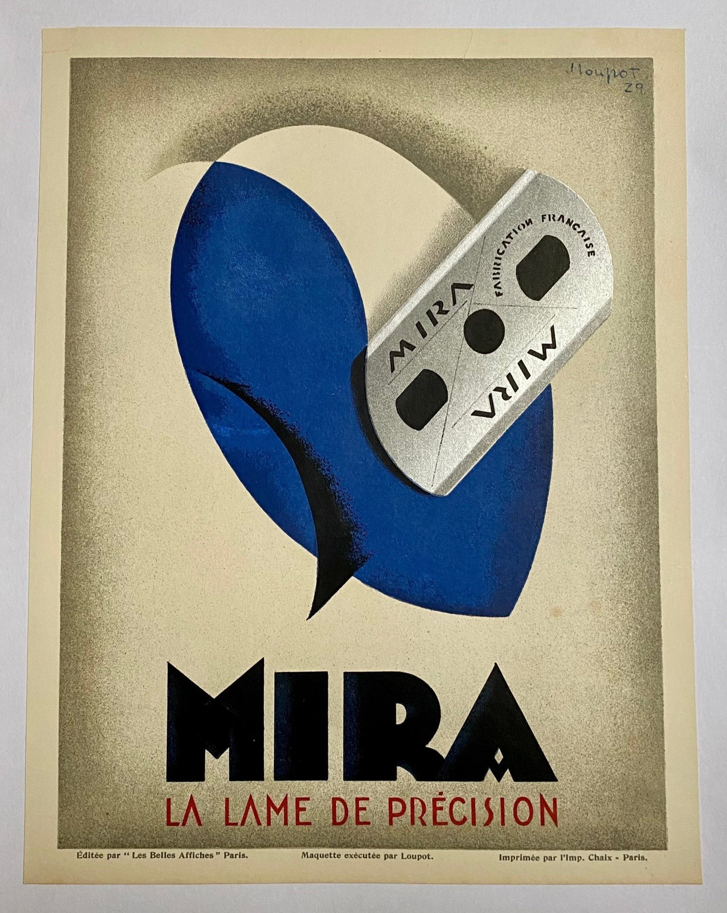L'affiche publicitaire originale de 1929, conçue par Charles Loupot pour Mira : La Lame de Précision - Rasoir, constitue un exemple remarquable d'Art déco appliqué à la publicité. Charles Loupot, maître de l'affiche et figure majeure du graphisme du XXe siècle, a créé cette œuvre pour promouvoir la précision et la qualité des lames de rasoir Mira. Cette affiche incarne l'approche novatrice de Loupot, alliant sophistication artistique et message publicitaire clair et percutant.