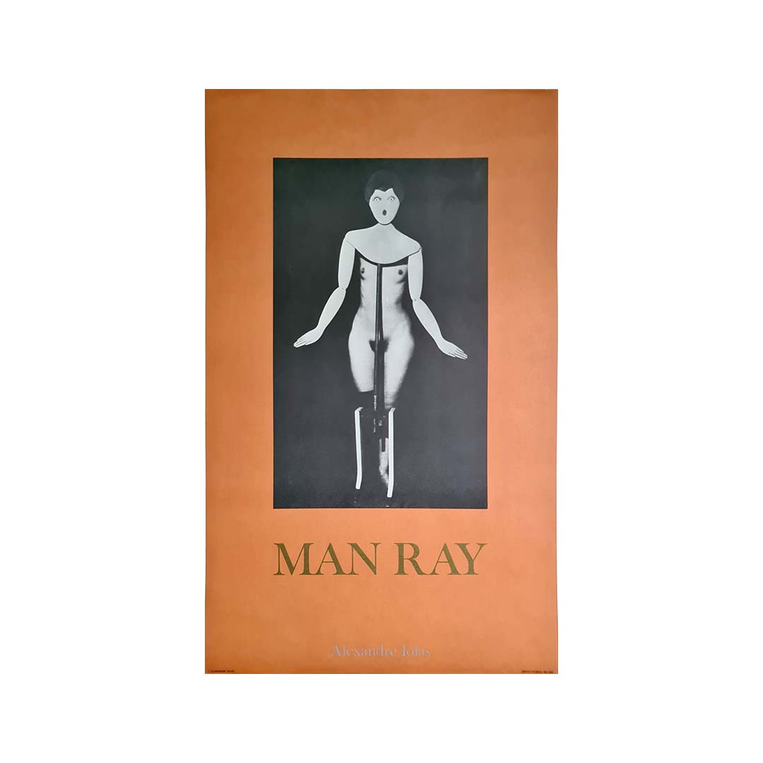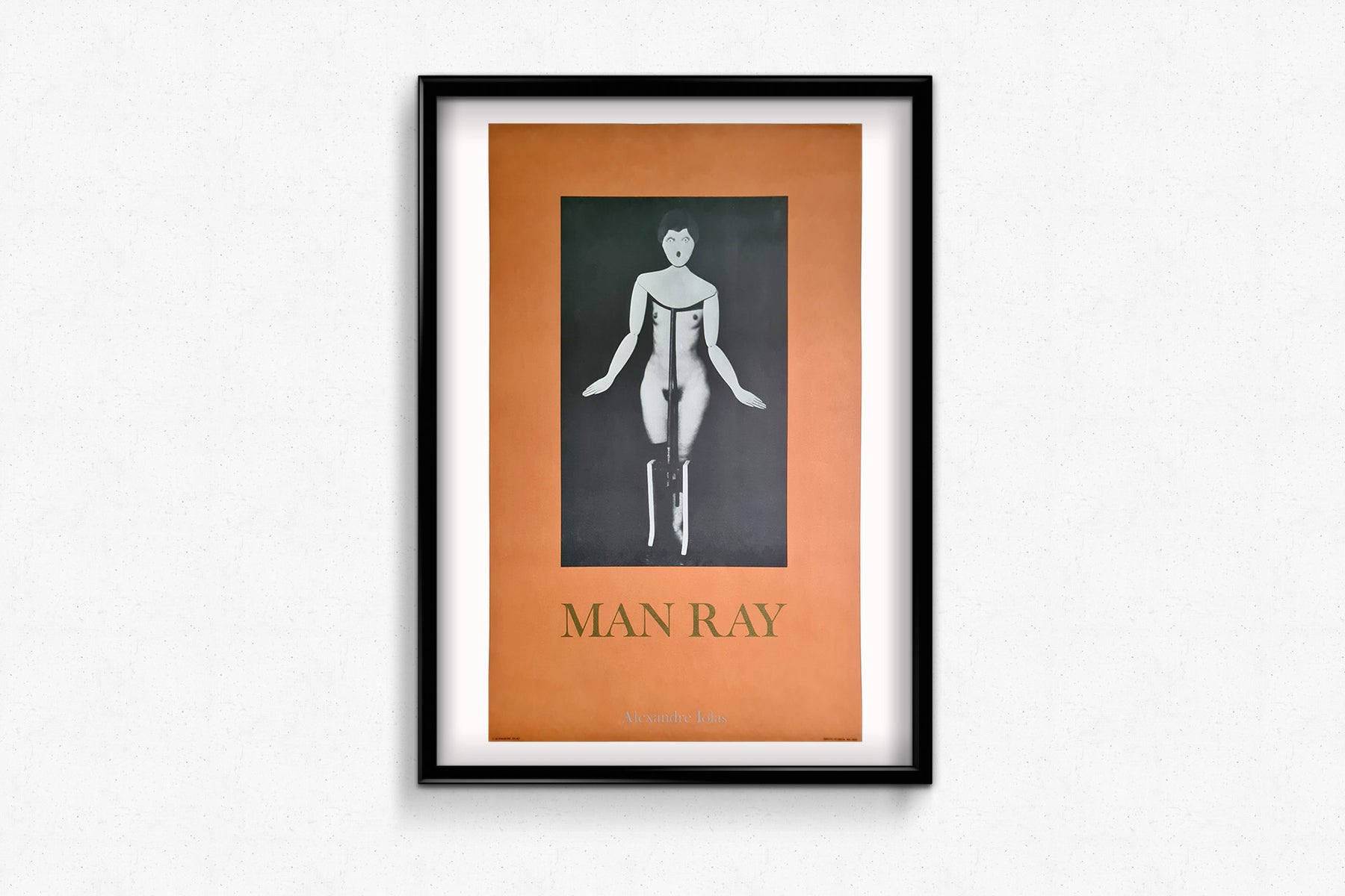 Au centre de l'affiche figure une photographie monochrome, l'une des compositions surréalistes emblématiques de Man Ray, qui juxtapose des éléments du corps humain à des formes mécaniques. La figure représentée est stylisée de façon marquée, avec des traits exagérés et un corps de poupée. Ce motif est typique de l'œuvre de Man Ray, qui mêle souvent réalité et abstraction, créant une image troublante et ambiguë. L'expression et la posture de la figure évoquent à la fois la vulnérabilité et la théâtralité, invitant le spectateur à une rencontre à la fois intime et déstabilisante. Cette approche témoigne de l'utilisation expérimentale de la photographie par Man Ray pour interroger la nature de l'identité humaine et les frontières entre animé et inanimé.