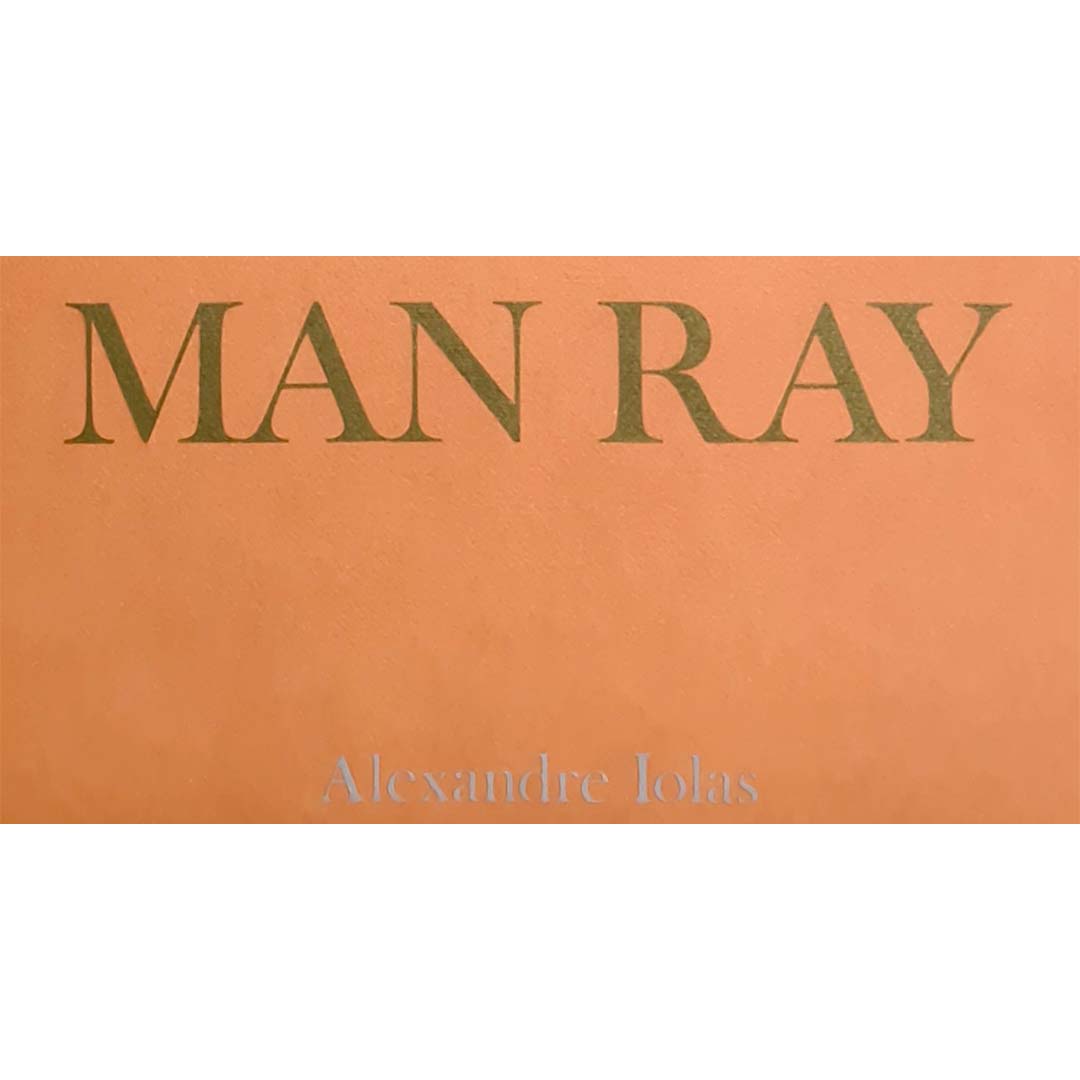 La composition est encadrée par un fond orange chaud et terreux, qui contraste fortement avec l'image en noir et blanc, faisant ainsi ressortir la photographie. Le texte « MAN RAY » apparaît en évidence sous l'image, en lettres dorées et grasses, offrant une reconnaissance simple mais percutante du nom de l'artiste. La typographie, épurée et moderne, souligne le caractère intemporel de son œuvre et laisse l'image occuper le devant de la scène sans fioritures inutiles. Sous le nom de l'artiste, le nom de la galerie, Alexandre Iolas, est discrètement inscrit, indiquant le lieu sans nuire à l'impact visuel de la composition.