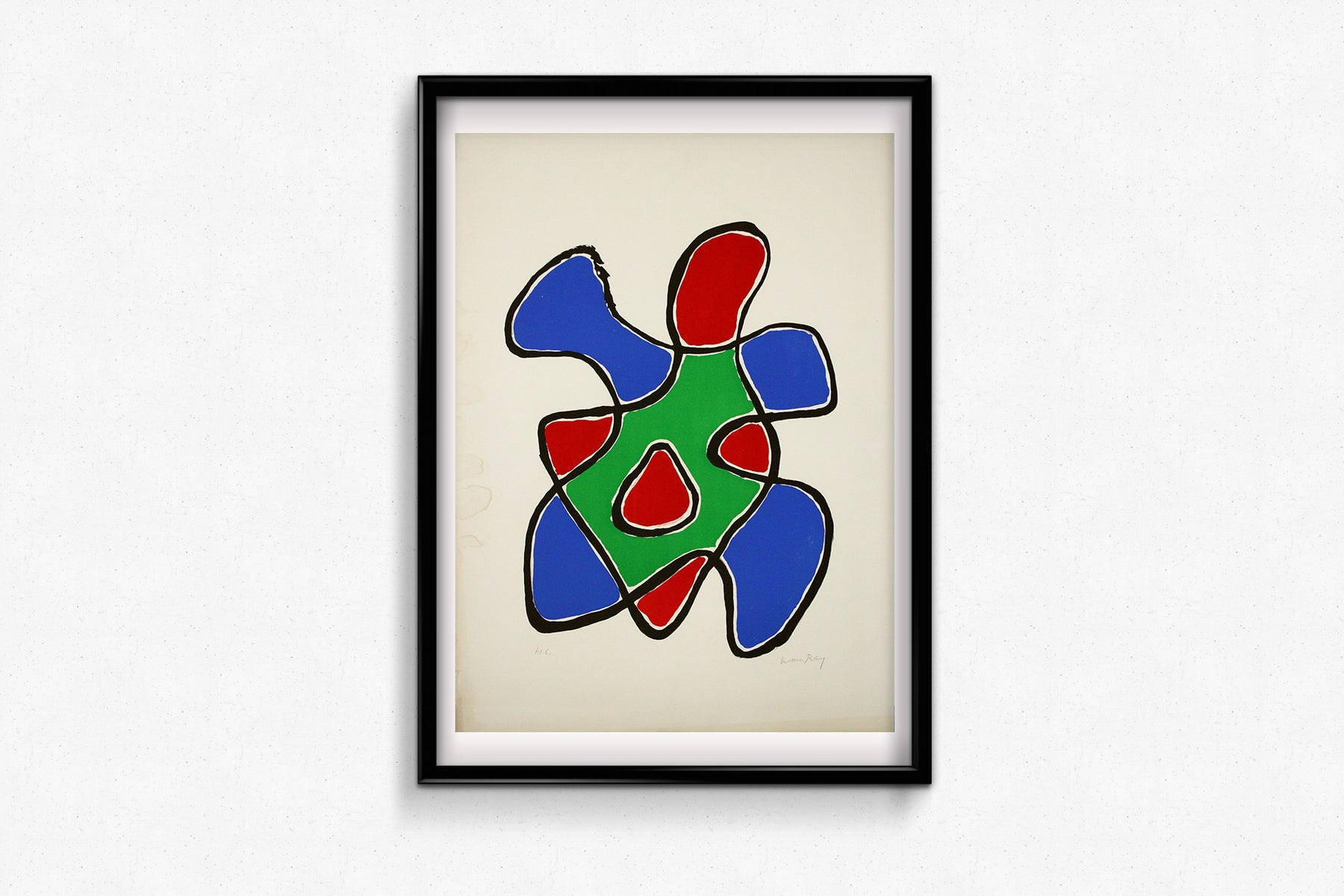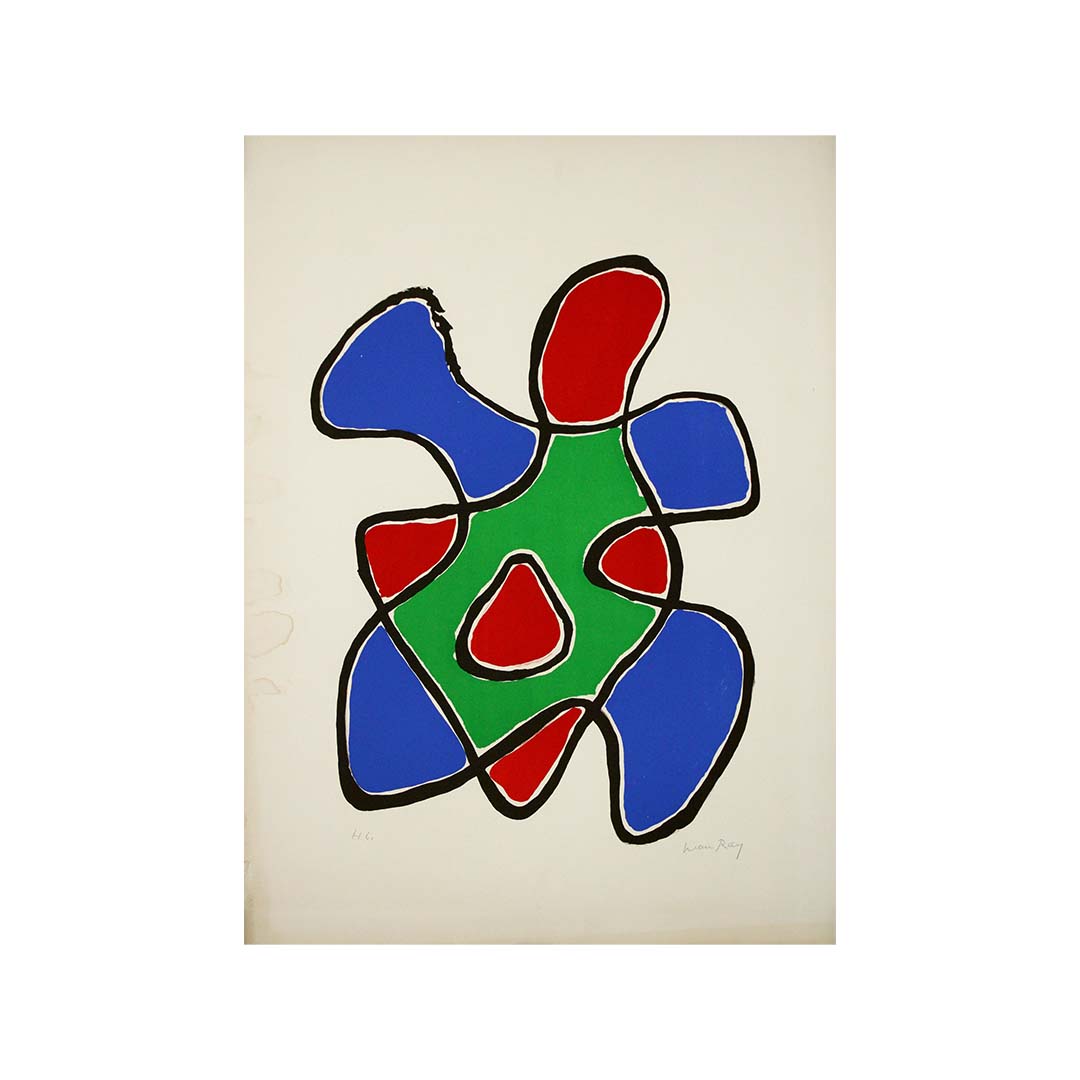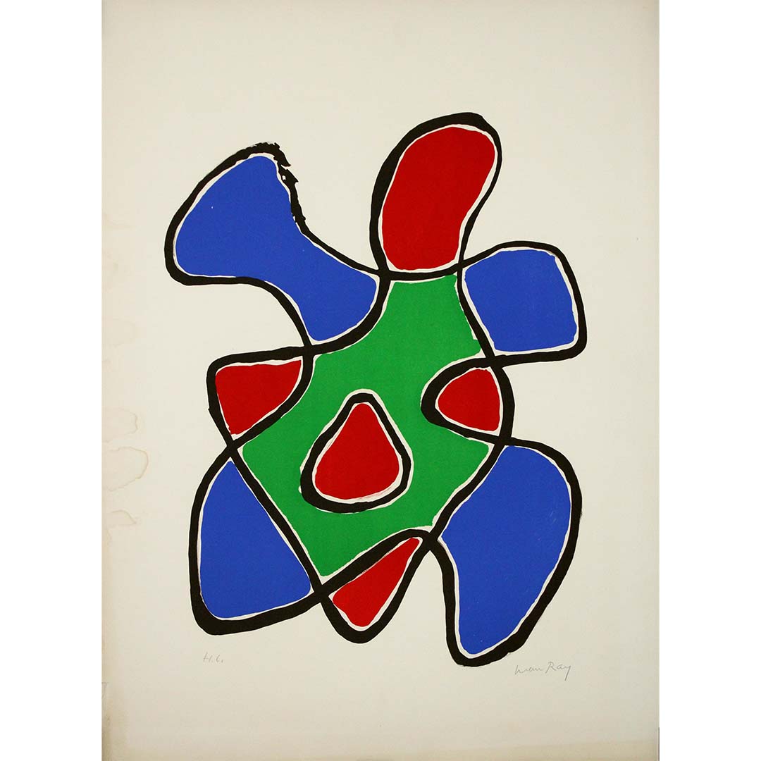 Aujourd'hui, Deux Figures témoigne avec force de la maîtrise de Man Ray en matière de lithographie couleur et de formes abstraites, ce qui en fait une pièce de collection importante pour les connaisseurs de l'héritage surréaliste, de l'abstraction du XXe siècle et des œuvres originales signées d'un artiste dont le vocabulaire visuel a transformé l'art moderne.
