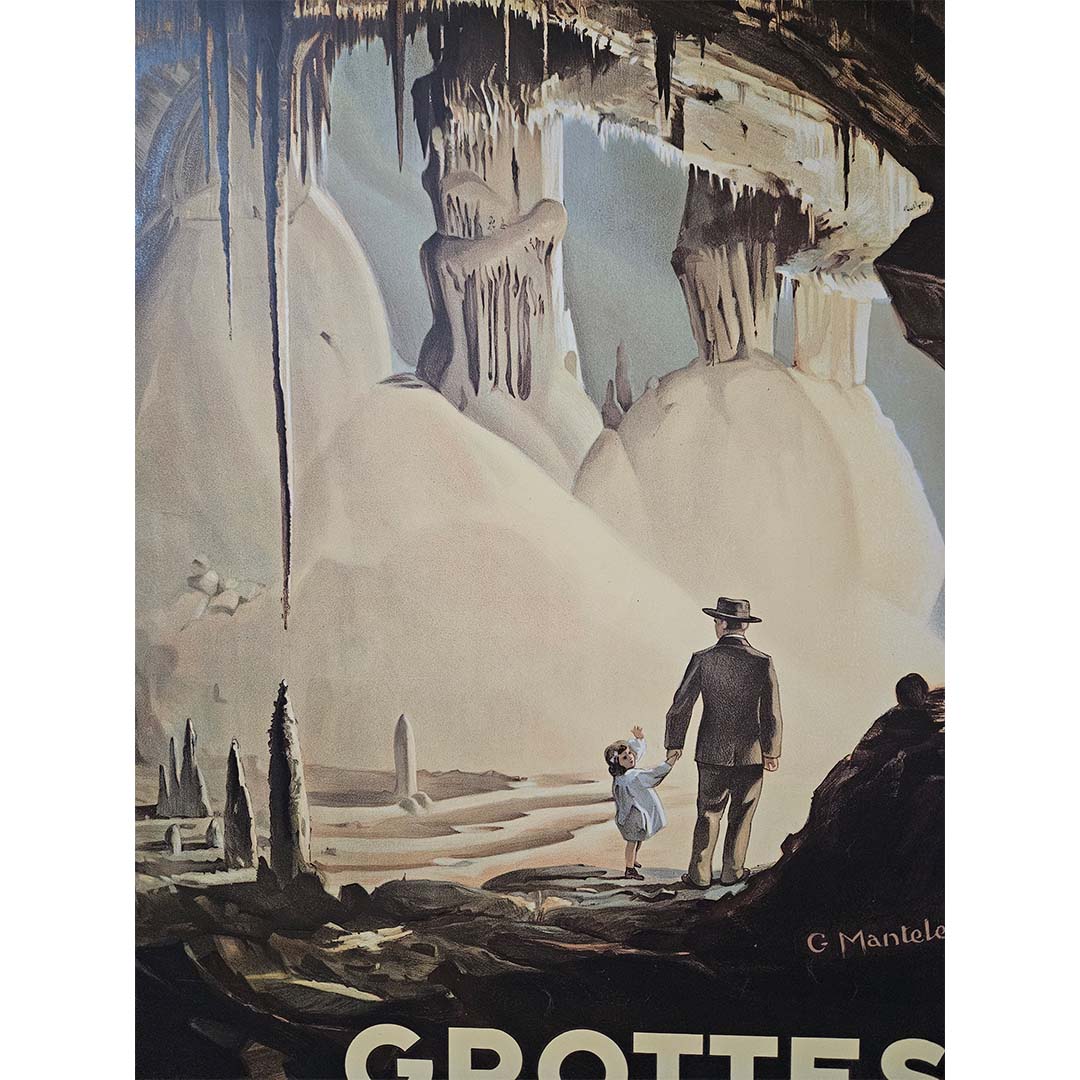 L'affiche de Mantelet est une merveille visuelle, mettant en scène le charme mystérieux des grottes de Lacave sur fond de gares de Souillac et de Rocamadour. La finesse des détails des formations souterraines, stalactites et stalagmites crée une atmosphère d'émerveillement et d'aventure. La composition dégage un charme surnaturel, invitant le spectateur à un voyage au cœur des profondeurs de la terre.