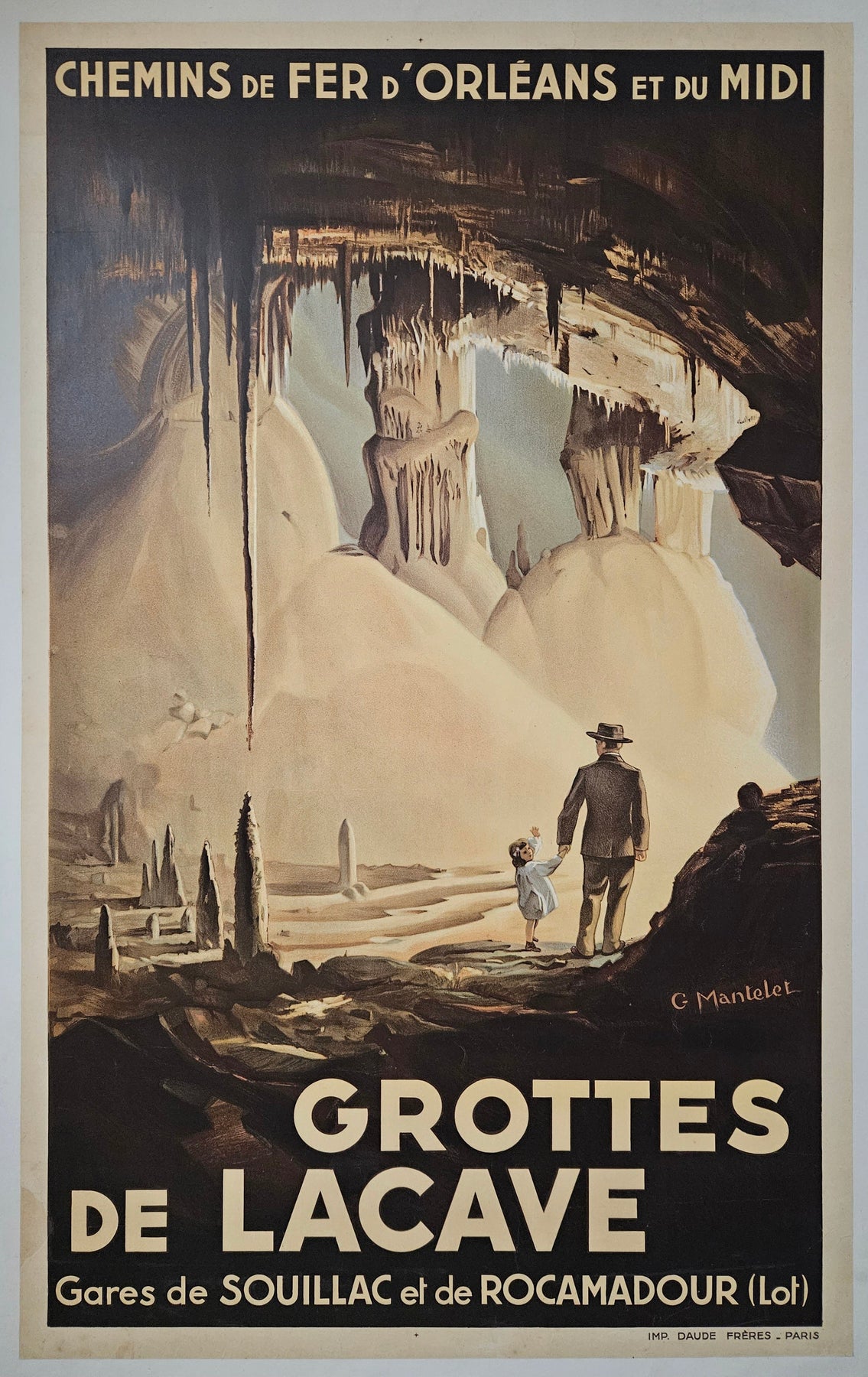 L'affiche de G. Mantelet, datant d'environ 1900 et destinée aux Chemins de fer d'Orléans et du Midi, intitulée « Les Grottes de Lacave - Gares de Souillac et de Rocamadour (Lot) », invite les spectateurs à un voyage souterrain à la découverte des enchanteresses grottes de Lacave. Cette affiche emblématique transcende la simple publicité ; elle témoigne avec art du charme du voyage en train et des merveilles souterraines du Lot.