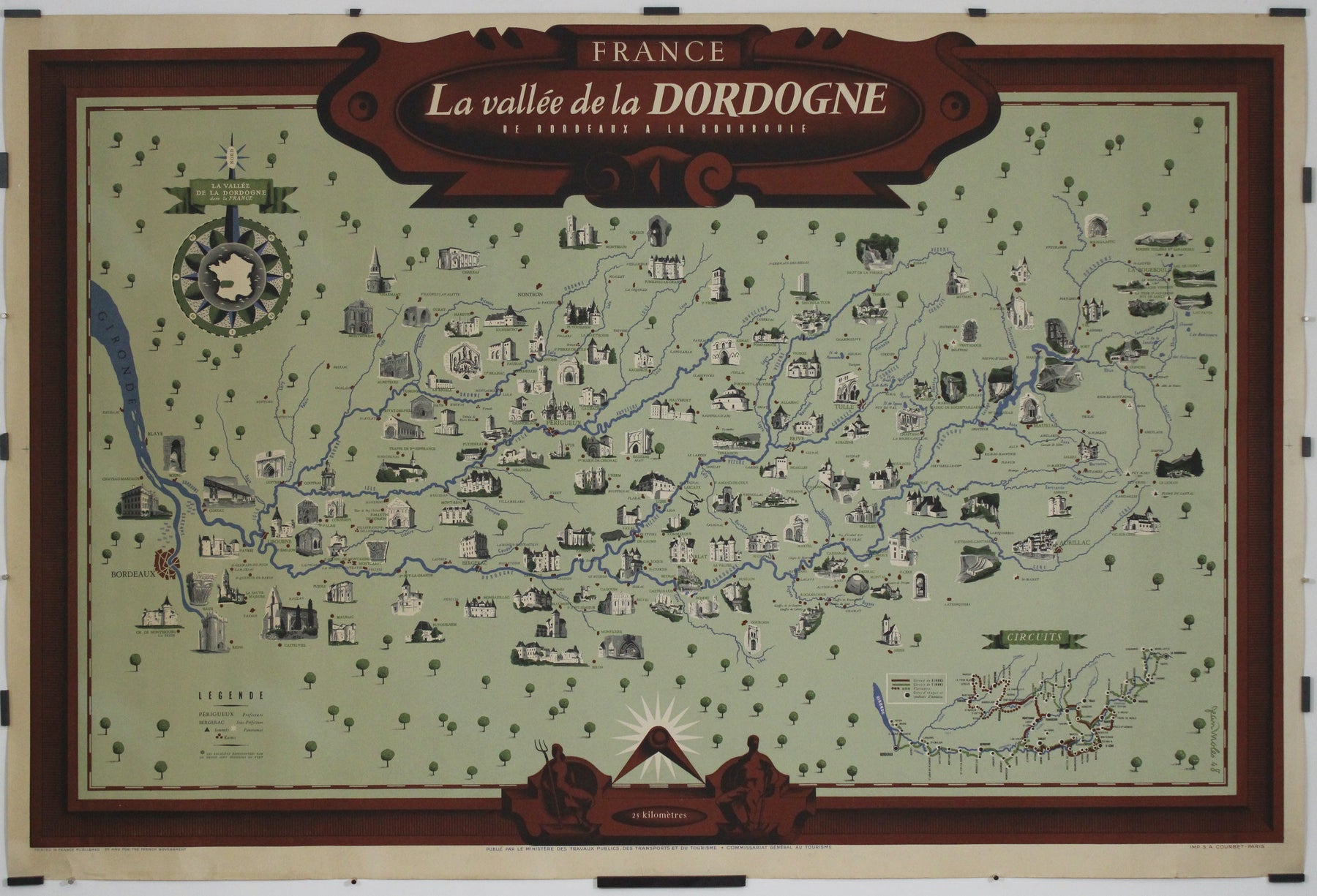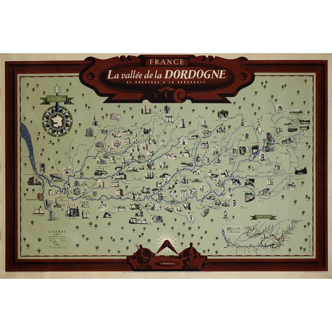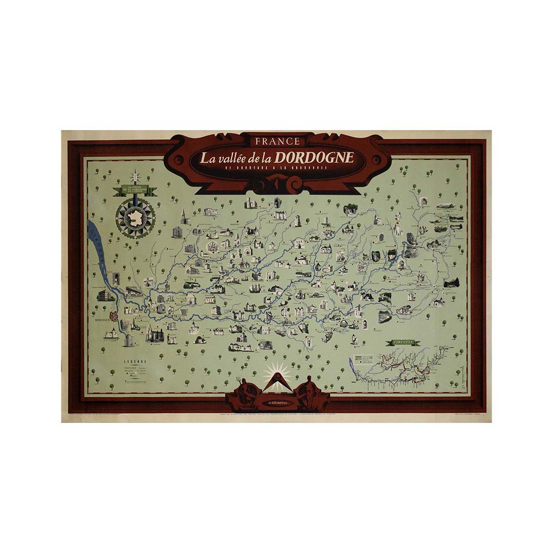 Prix régulier €600,00La carte originale de 1948, intitulée « La Vallée de la Dordogne de Bordeaux à la Bourboule », est l'œuvre de l'artiste et cartographe français Jean Moles. À la fois guide géographique et œuvre d'art, elle capture le charme et la richesse de l'une des régions les plus pittoresques de France : la vallée de la Dordogne.