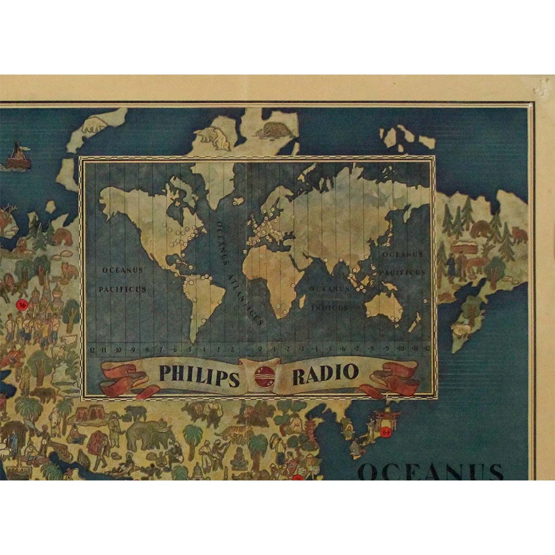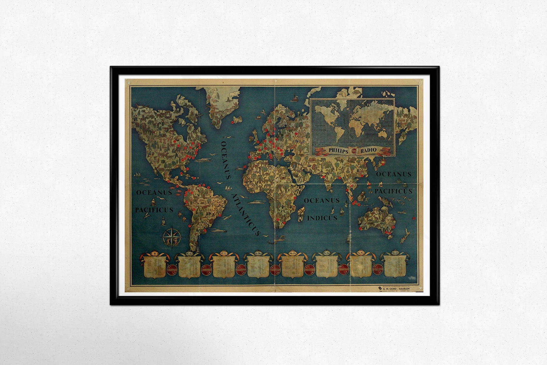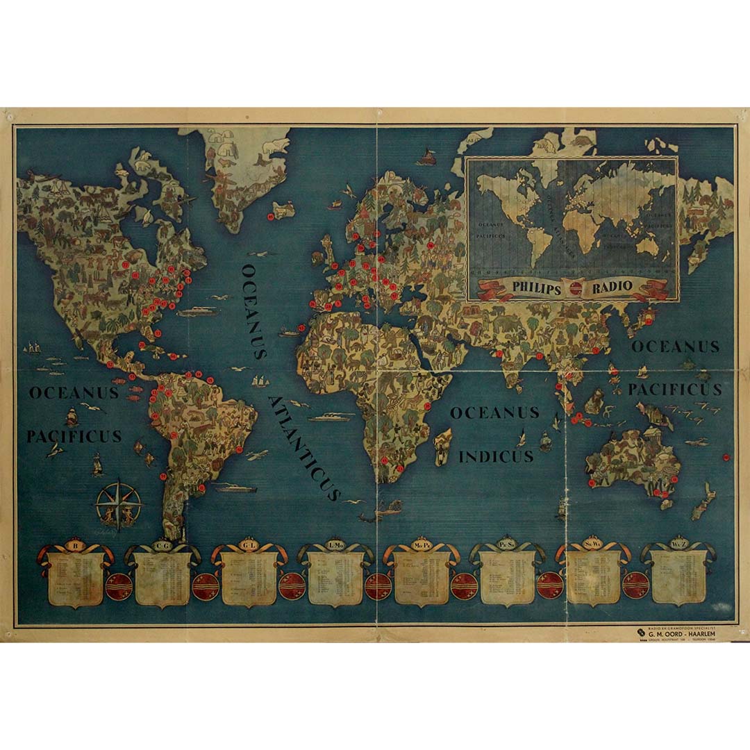 La carte impressionne d'emblée. Encadrée d'un bleu marine profond et annotée en latin — Oceanus Pacificus , Oceanus Atlanticus , Oceanus Indicus —, elle rappelle les grandes cartes de navigation de l'époque des Grandes Découvertes. Mais au lieu des routes des galions et des caravelles, les points rouges qui parsèment le globe indiquent les stations de transmission radio de Philips, un réseau moderne de connectivité s'étendant à travers les continents.