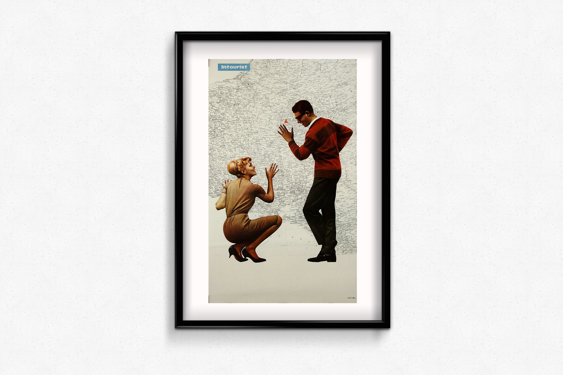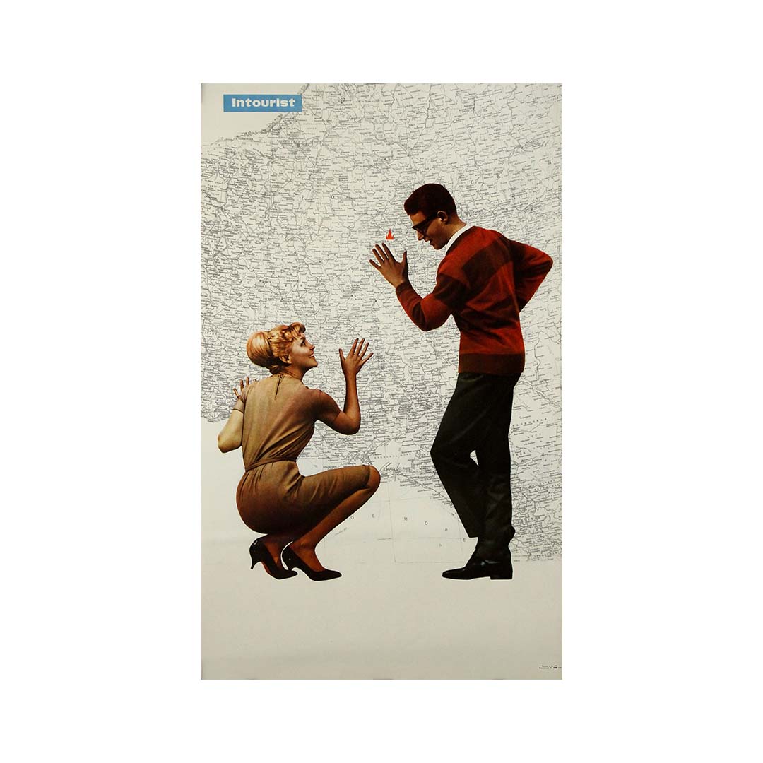 Cette superbe affiche de voyage soviétique originale des années 1970, produite par Intourist – l’agence de voyages officielle de l’URSS – capture un moment d’anticipation joyeuse et d’exploration curieuse. Au cœur de la composition se trouve une interaction ludique entre une jeune femme et un jeune homme, élégamment vêtus dans un style typique du milieu du siècle, qui manipulent avec enthousiasme une carte détaillée de l’Union soviétique.