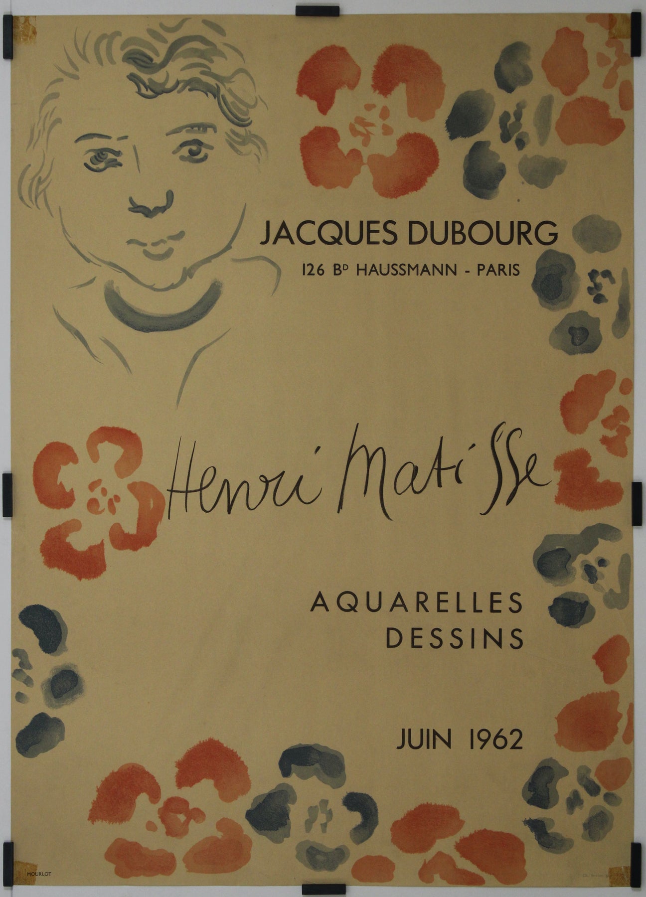 Cette élégante affiche d'exposition originale de 1962 a été conçue par le légendaire moderniste français Henri Matisse pour promouvoir une exposition d'aquarelles et de dessins à la galerie Jacques Dubourg, située au 126 boulevard Haussmann à Paris.