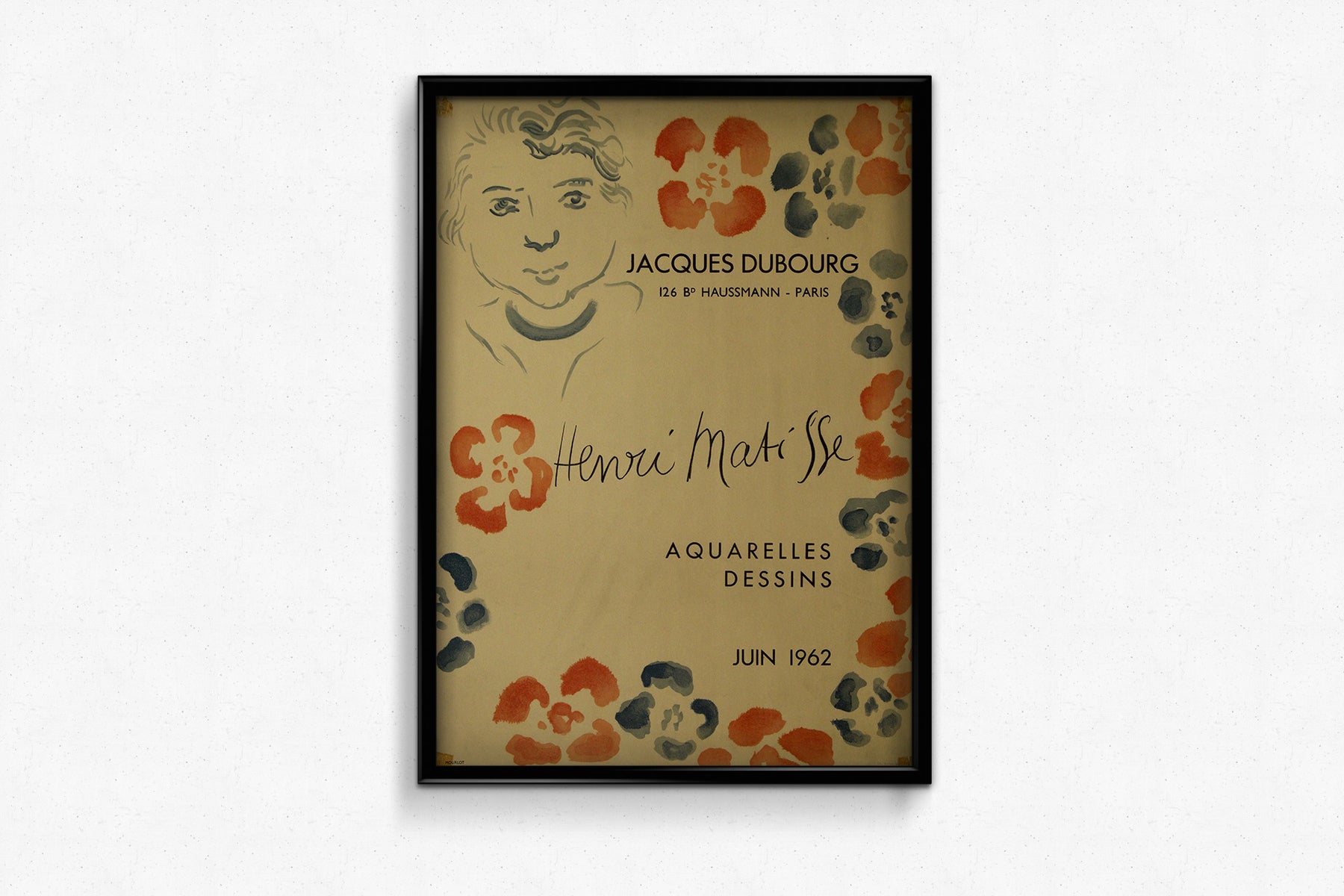 Publiée à titre posthume quelques années après la mort de Matisse en 1954, cette affiche saisit la spontanéité raffinée et le lyrisme du trait qui caractérisent l'œuvre tardive de l'artiste. L'image centrale présente un portrait délicatement esquissé – simple et expressif à la fois – entouré de motifs floraux épanouis dans des tons de rouge corail et de bleu encre. Ces fleurs à l'aquarelle rayonnent de chaleur et d'intimité, évoquant l'exploration joyeuse des couleurs et des formes par Matisse.