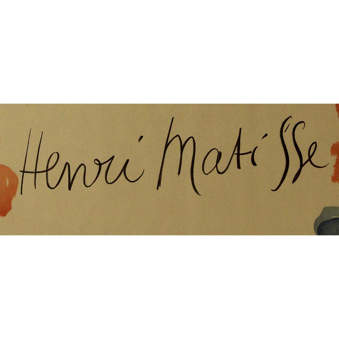 La signature audacieuse et immédiatement reconnaissable de Matisse domine le centre, s'intégrant harmonieusement à l'œuvre et à la typographie. La mise en page minimaliste laisse respirer les éléments, et la teinte beige naturelle du papier rehausse la douceur de la palette et du dessin.