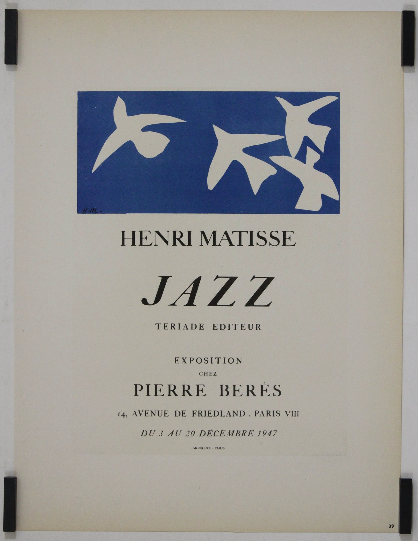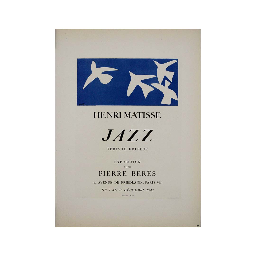 Cette affiche originale de 1947 a été créée pour l'exposition du livre d'art légendaire d'Henri Matisse, « Jazz », publié par Tériade. Présentée à la célèbre galerie Pierre Berès à Paris du 3 au 20 décembre 1947, l'exposition mettait en lumière l'une des œuvres les plus novatrices de Matisse : une collection vibrante de compositions découpées qui ont redéfini l'art moderne.