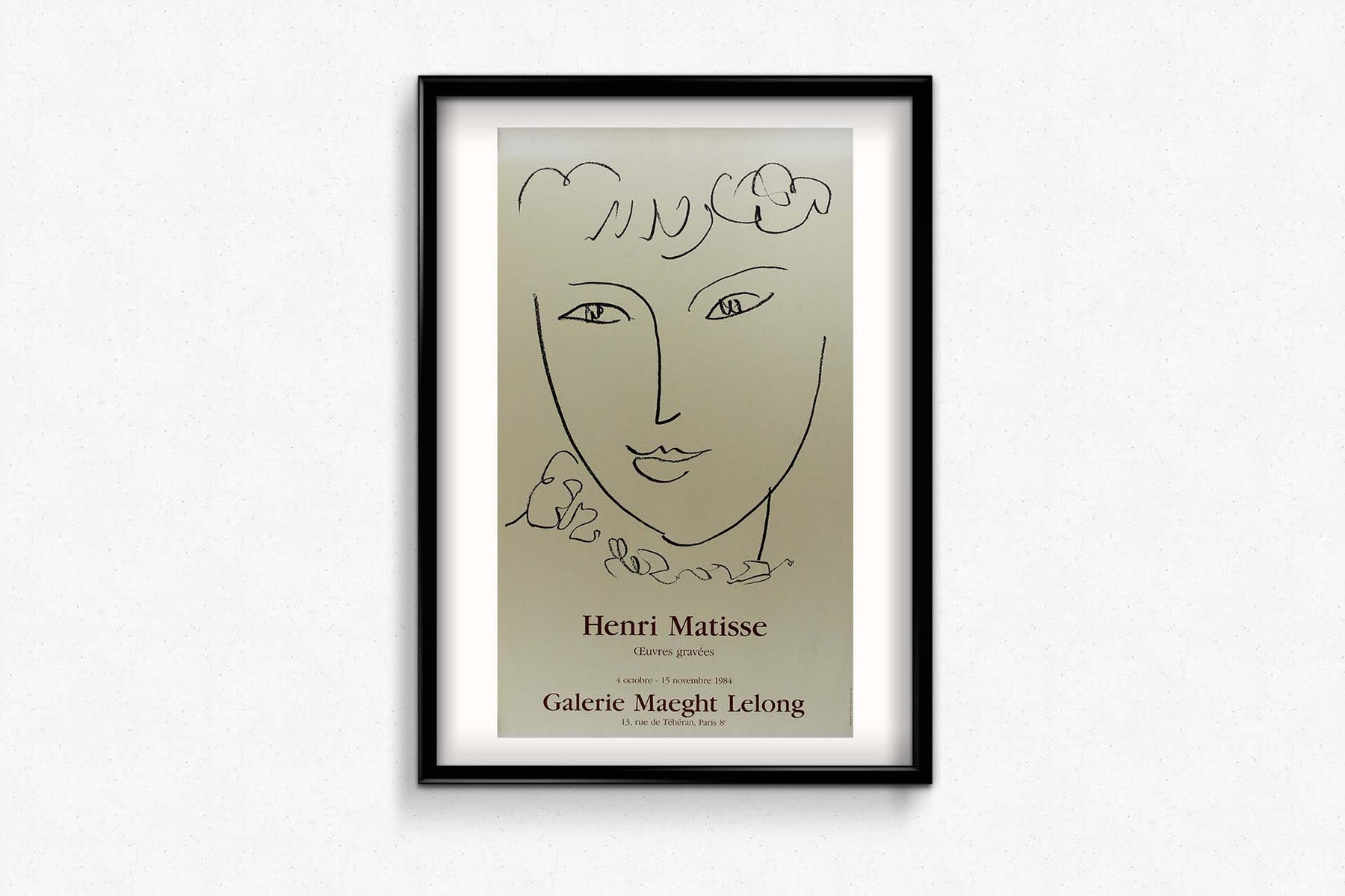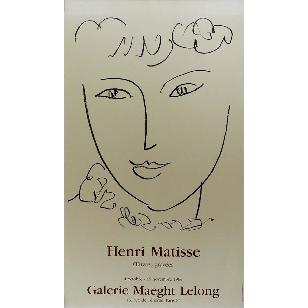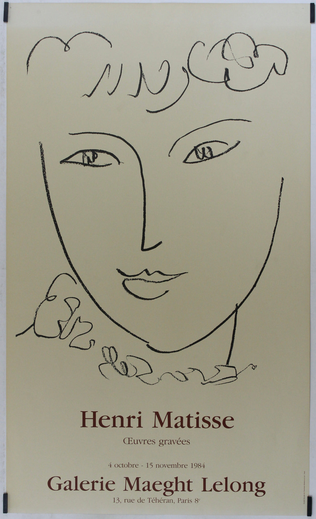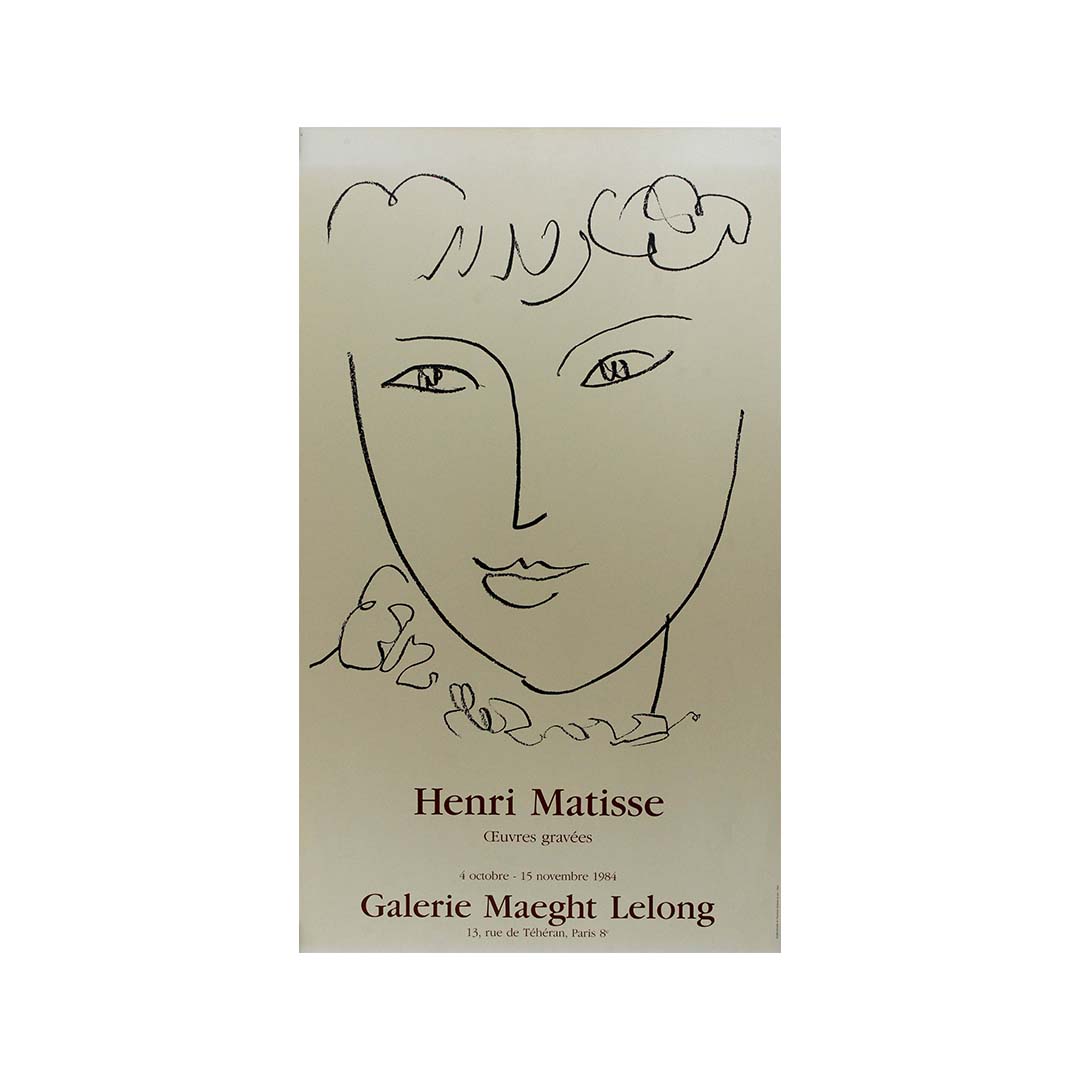 L'affiche d'Henri Matisse de 1984 pour l'exposition « Œuvres gravées » à la Galerie Maeght Lelong est un chef-d'œuvre rayonnant qui rend hommage à l'art de la gravure. Cette affiche emblématique invite à explorer l'univers des gravures complexes et profondément expressives de Matisse.