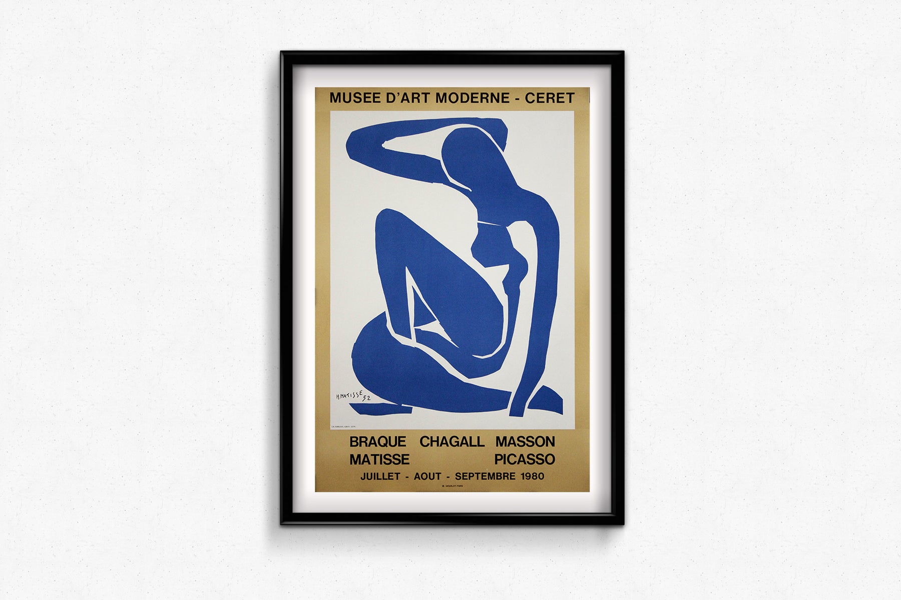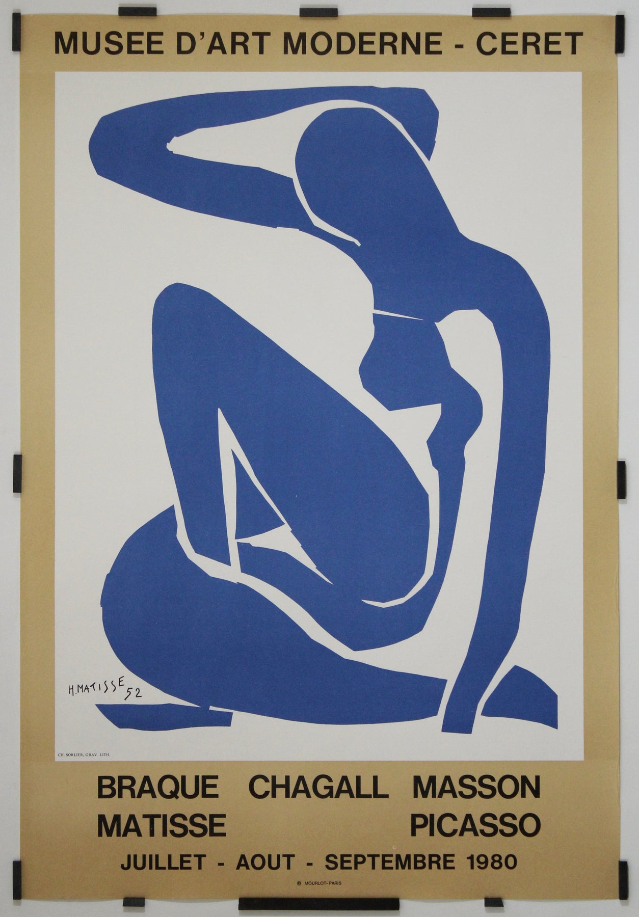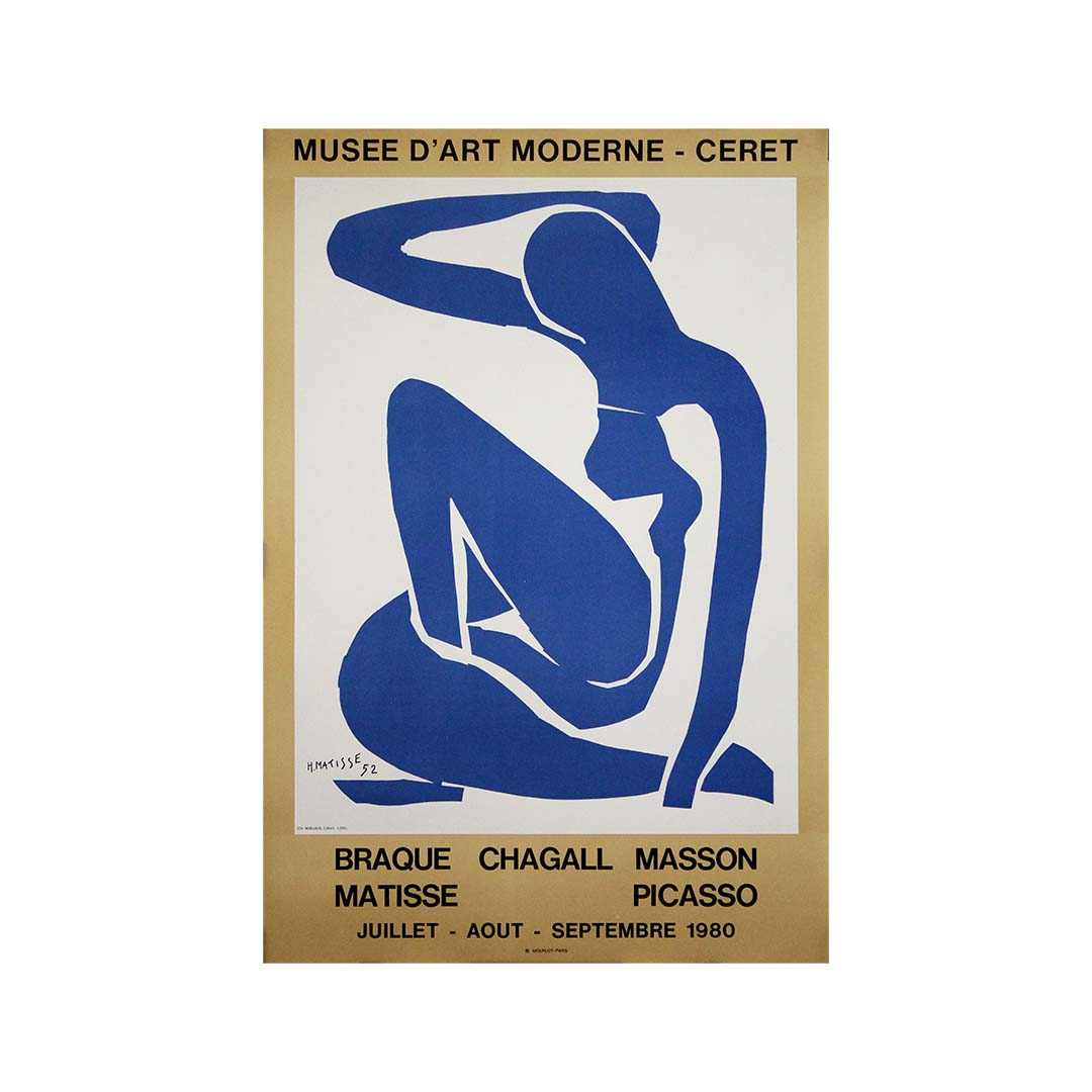 Voici une affiche originale de 1980 présentant Femme en bleue d'Henri Matisse, créée pour une exposition au Musée d'Art Moderne de Céret. Imprimée dans des tons riches et élégants, cette affiche reproduit magnifiquement l'un des portraits de la fin de carrière de Matisse : une figure saisissante, rendue dans les aplats de couleur et les formes simplifiées caractéristiques de l'artiste, faisant écho aux innovations stylistiques du fauvisme et à son exploration sans cesse renouvelée de la forme et de la couleur.