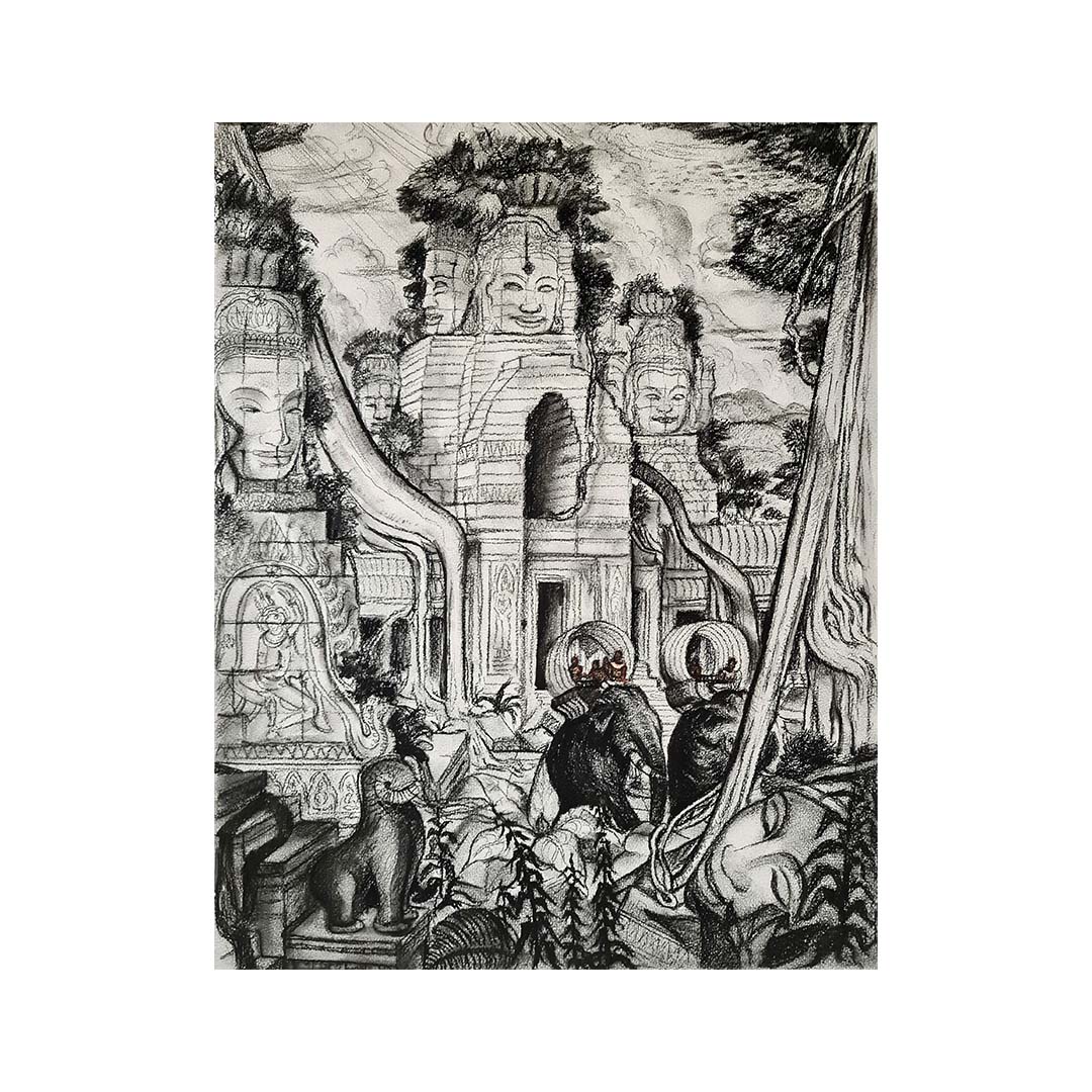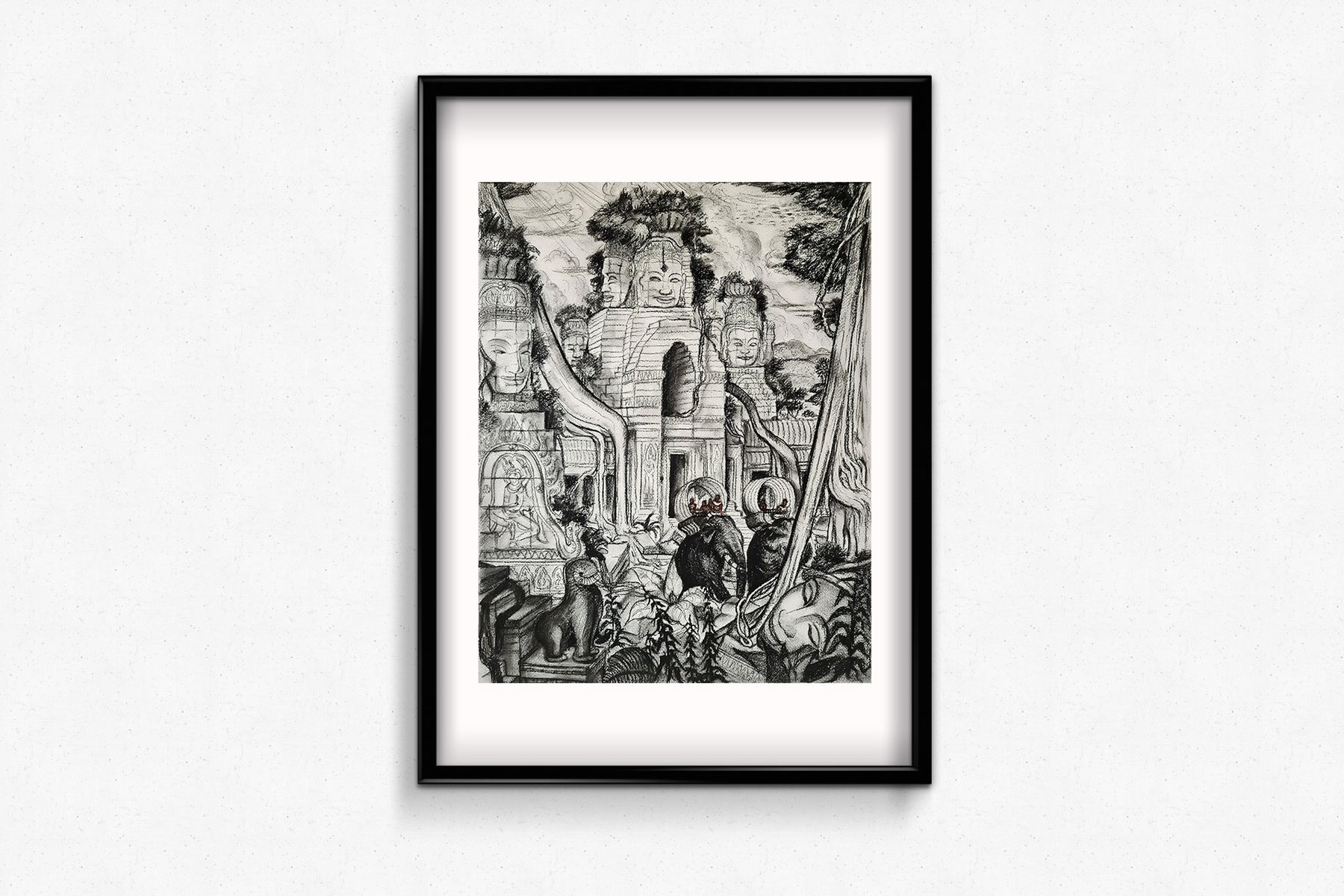 Ce dessin datant d'environ 1950, Vision du monde à Angkor – Temples , réalisé dans le style de Maire André, capture la grandeur intemporelle du complexe de temples antiques du Cambodge. La composition transporte le spectateur au cœur d'Angkor, où l'architecture de pierre finement ciselée dialogue silencieusement avec la jungle environnante. Des structures imposantes, ornées de sculptures élaborées et patinées par le temps, se dressent au milieu d'une végétation dense, évoquant une atmosphère mystique.