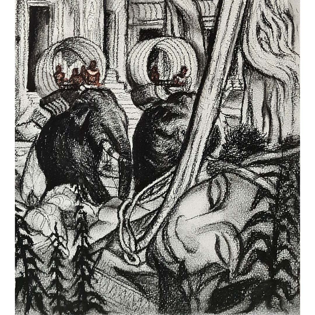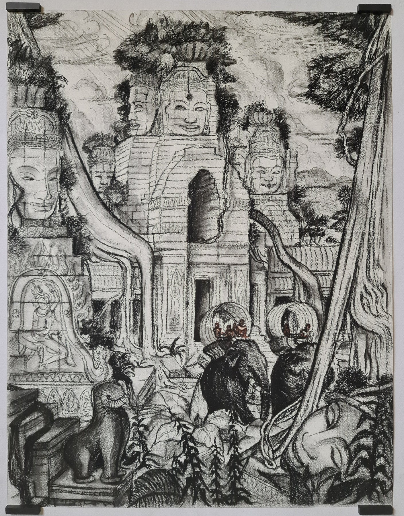 Réalisé au fusain avec une grande expressivité et des nuances subtiles, le dessin traduit l'ampleur et la majesté des ruines sacrées d'Angkor. Le jeu d'ombre et de lumière accentue la profondeur de la composition, donnant vie aux détails minutieux des bas-reliefs et des couloirs des temples. La présence de moines ou de voyageurs au premier plan suggère une scène de recueillement spirituel, soulignant l'importance historique du site comme lieu de dévotion et d'émerveillement.