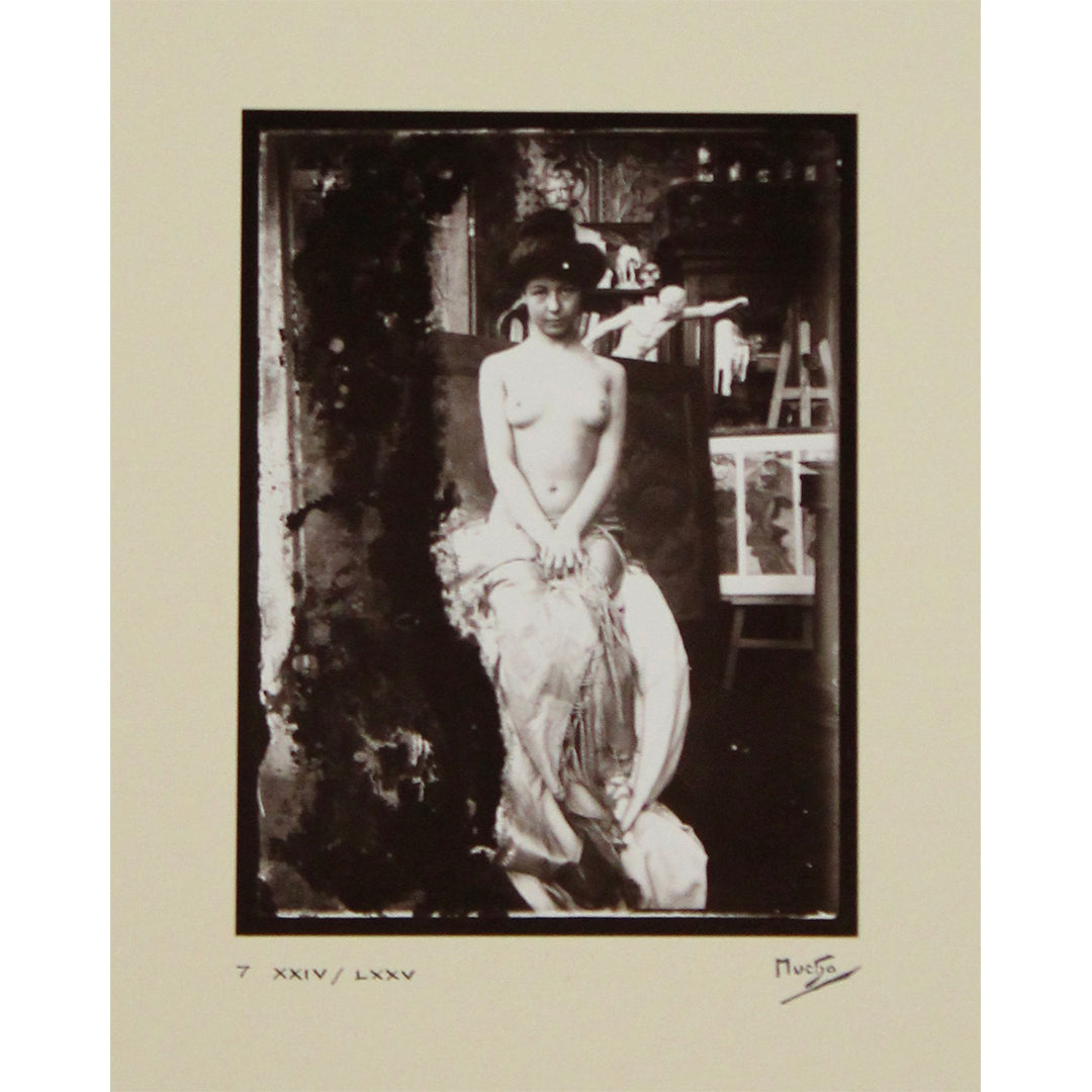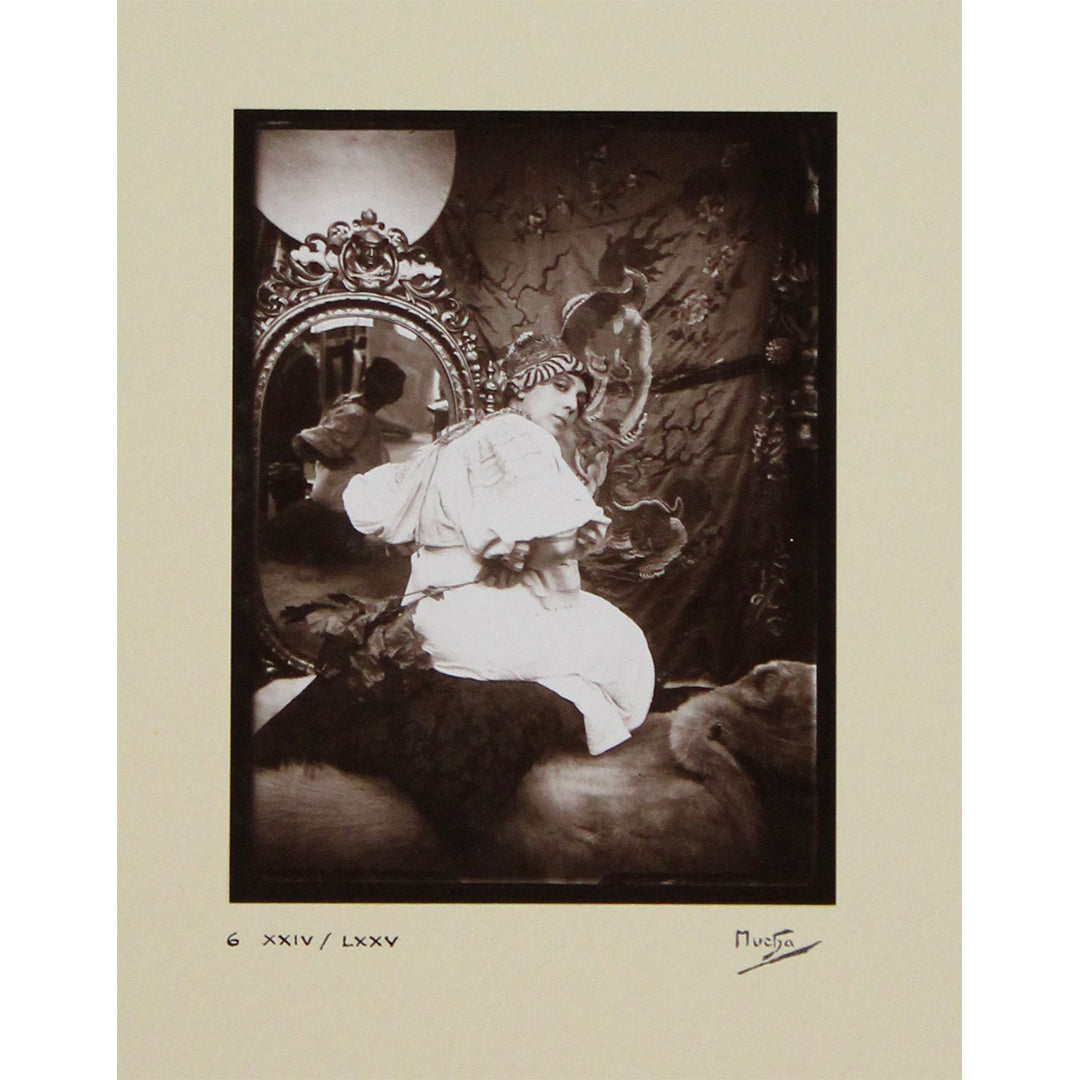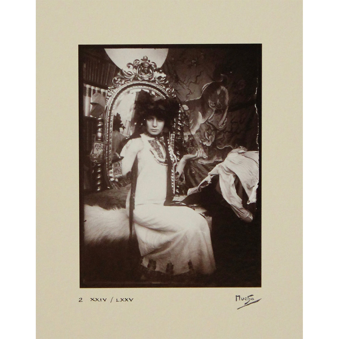 Chaque photographie de ce coffret révèle le souci du détail de Mucha, son goût pour les costumes ornementaux et la mise en scène narrative authentique, capturant à la fois la grandeur et la subtilité de sa vision Art nouveau. Des nus posés aux costumes orientaux, en passant par des vues intérieures évocatrices de son atelier parisien, ces images évoquent l'atmosphère poétique et spirituelle qui imprègne son univers visuel. La série comprend des portraits pris sur le vif de Mucha au travail et de modèles dans des postures profondément expressives, mettant en lumière la source photographique directe de ses lithographies et peintures.