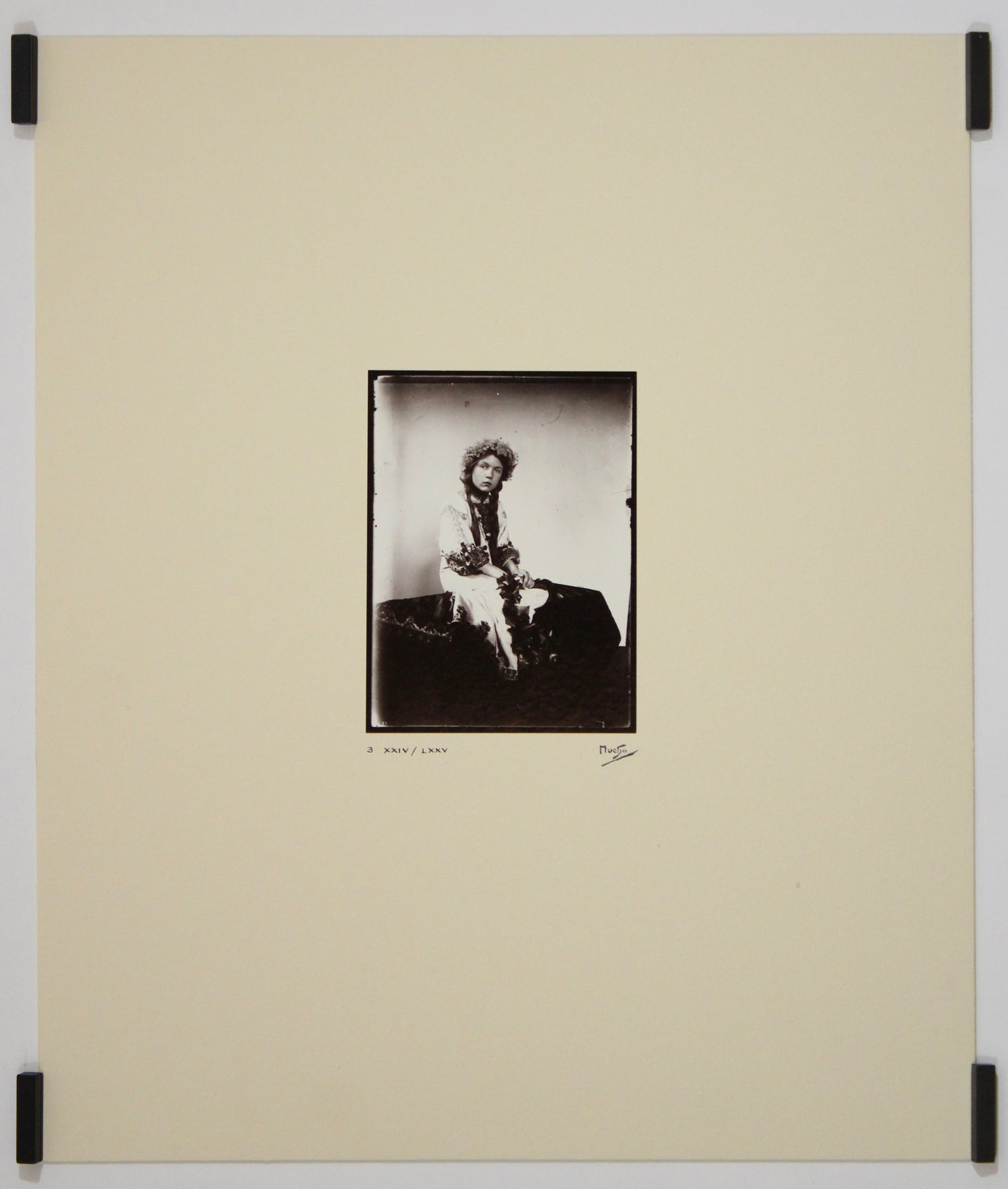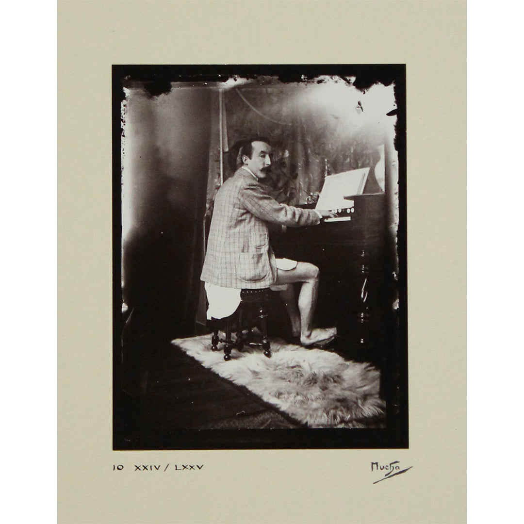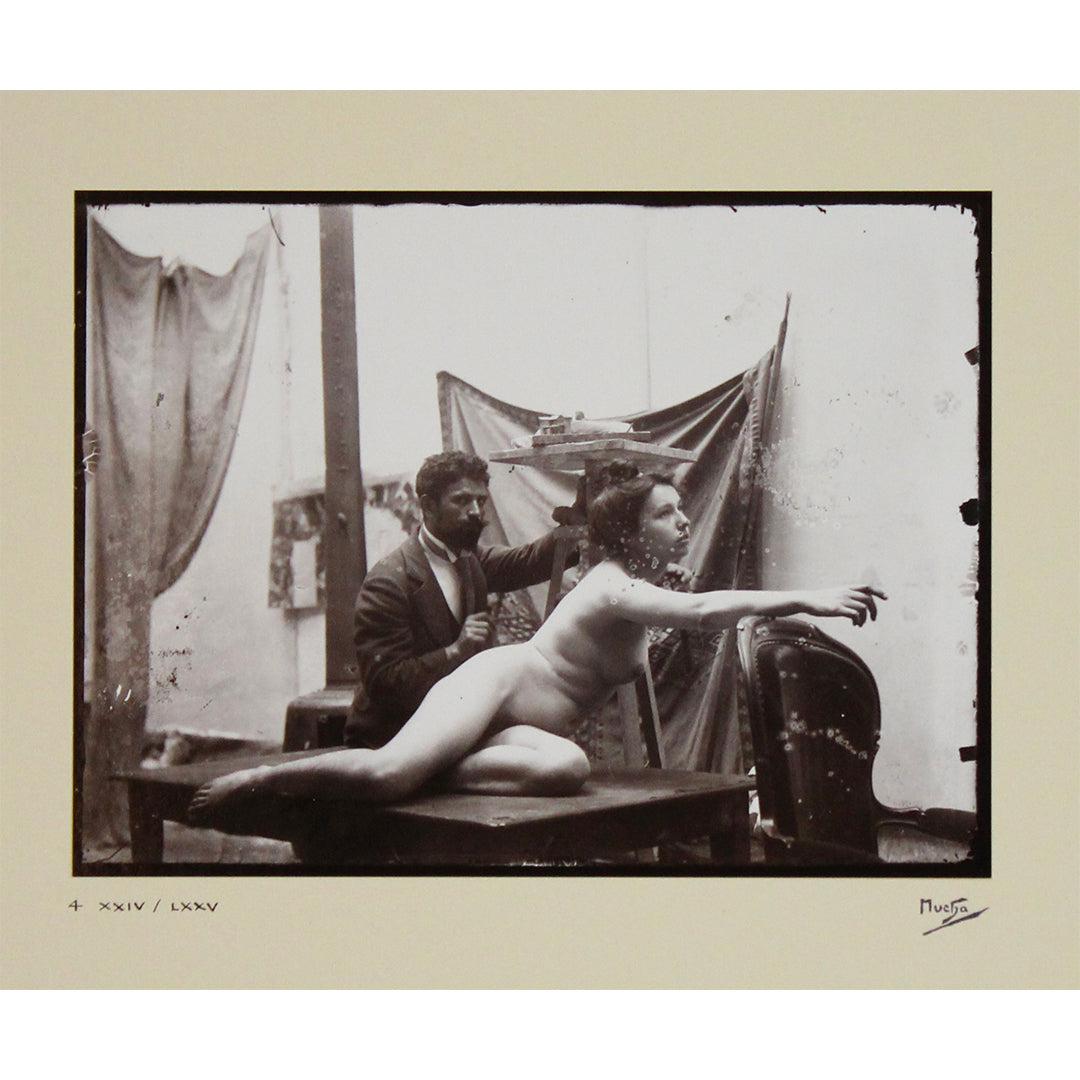 Chaque photographie de ce coffret révèle le souci du détail de Mucha, son goût pour les costumes ornementaux et la mise en scène narrative authentique, capturant à la fois la grandeur et la subtilité de sa vision Art nouveau. Des nus posés aux costumes orientaux, en passant par des vues intérieures évocatrices de son atelier parisien, ces images évoquent l'atmosphère poétique et spirituelle qui imprègne son univers visuel. La série comprend des portraits pris sur le vif de Mucha au travail et de modèles dans des postures profondément expressives, mettant en lumière la source photographique directe de ses lithographies et peintures.