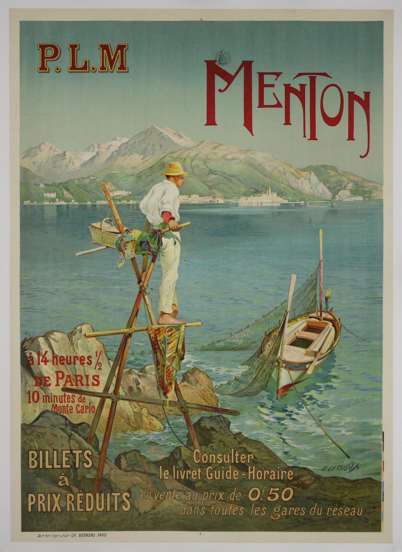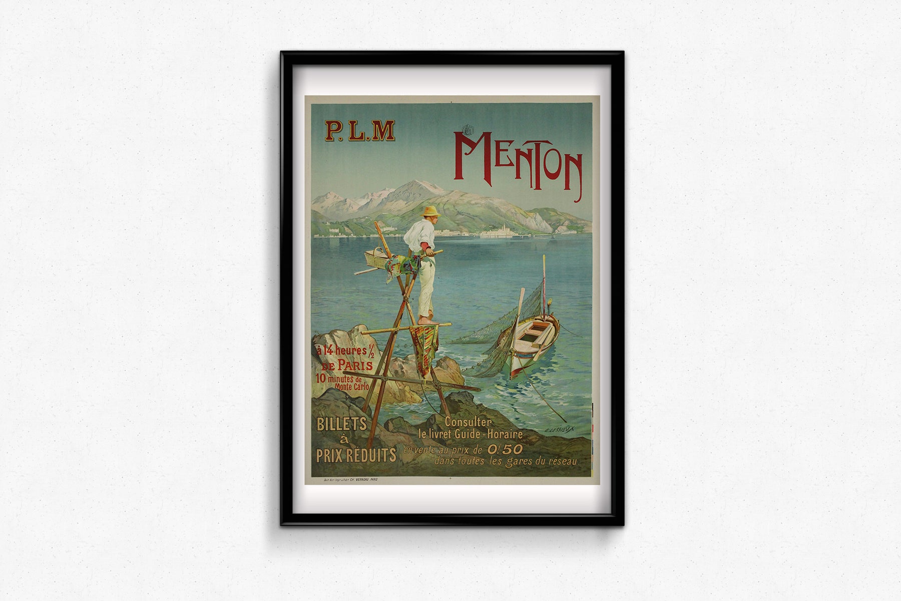 Sur cette composition, un pêcheur coiffé d'un chapeau de paille se dresse sur un promontoire rustique dominant la mer paisible, s'occupant de ses filets tandis qu'une petite barque est amarrée en contrebas. Derrière lui, les Alpes se dressent majestueusement, leurs sommets encore enneigés malgré le soleil du sud. La typographie vante fièrement Menton comme étant « à 14 heures et demie de Paris, 10 minutes de Monte Carlo », soulignant son charme accessible pour les voyageurs français du début du XXe siècle.