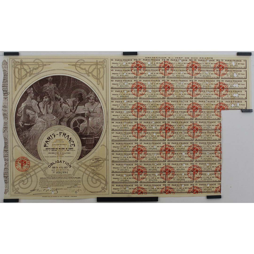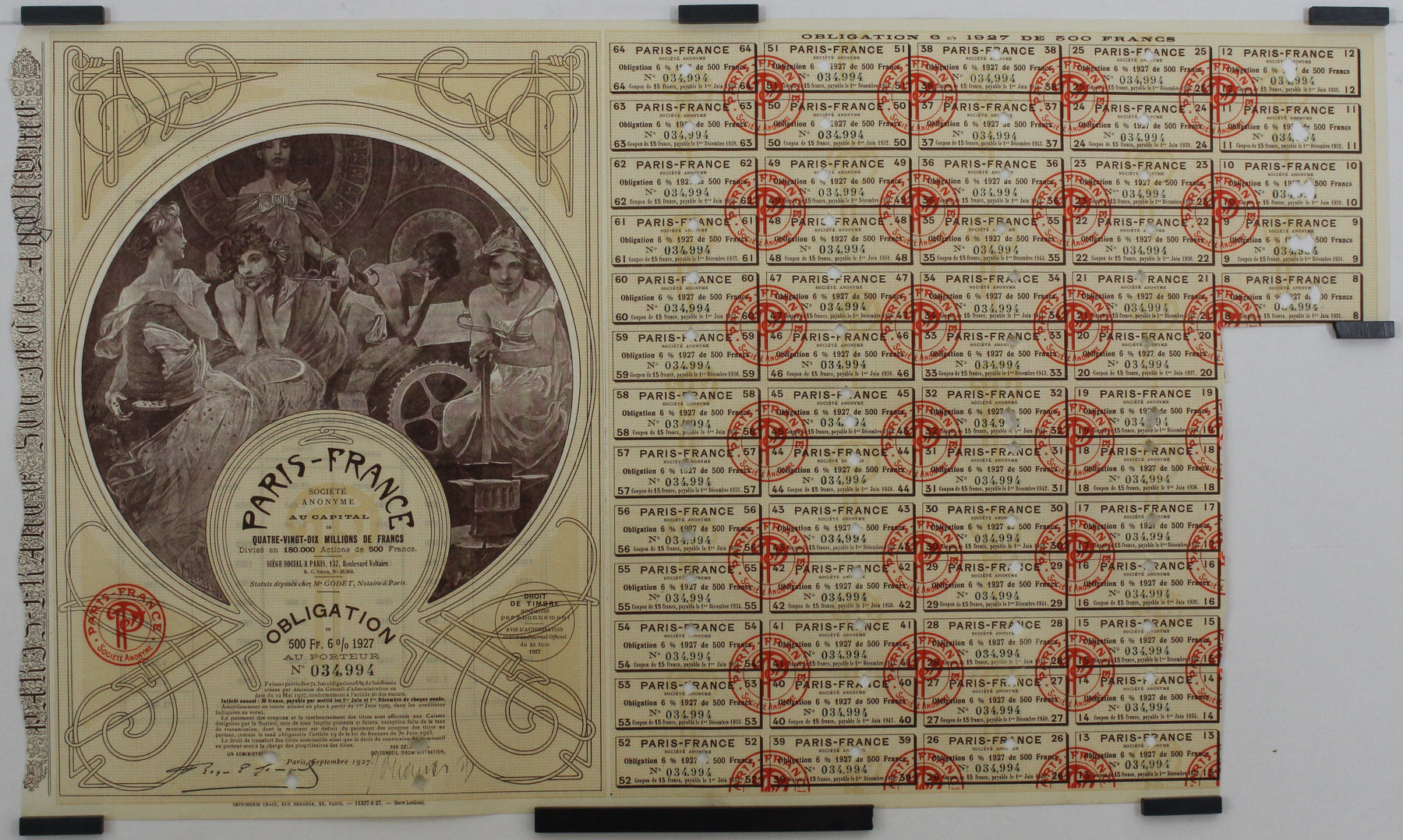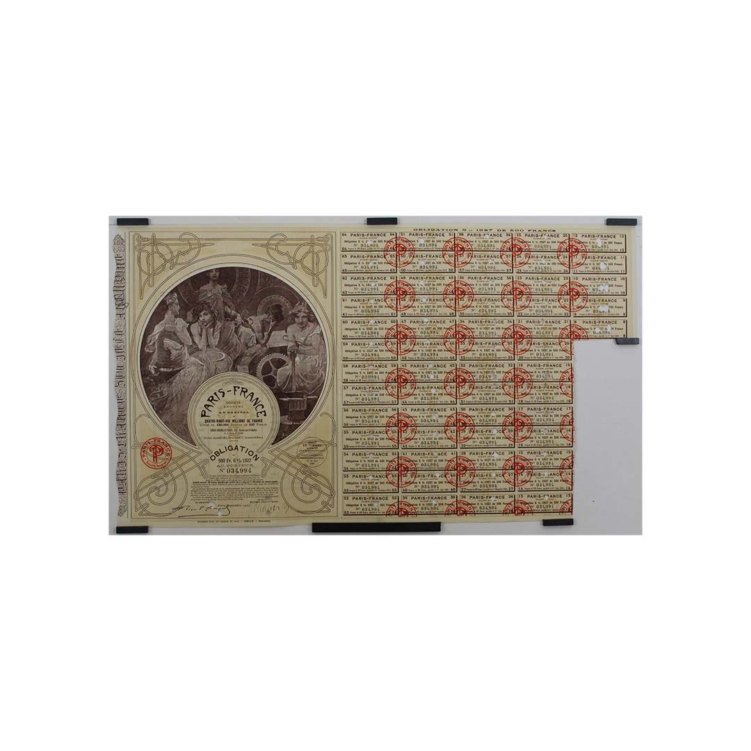 Cette Obligation au Porteur de 1927 est un document financier représentant une obligation au porteur émise par la société de grands magasins Paris-France , une entreprise française florissante du début du XXe siècle. Elle accordait à son détenteur le droit à des intérêts au taux de 6 %, imprimés avec une feuille complète de coupons détachables – un format courant à l'époque. Ces coupons étaient découpés et échangés à intervalles réguliers pour percevoir les intérêts, à l'instar des dividendes actuels.