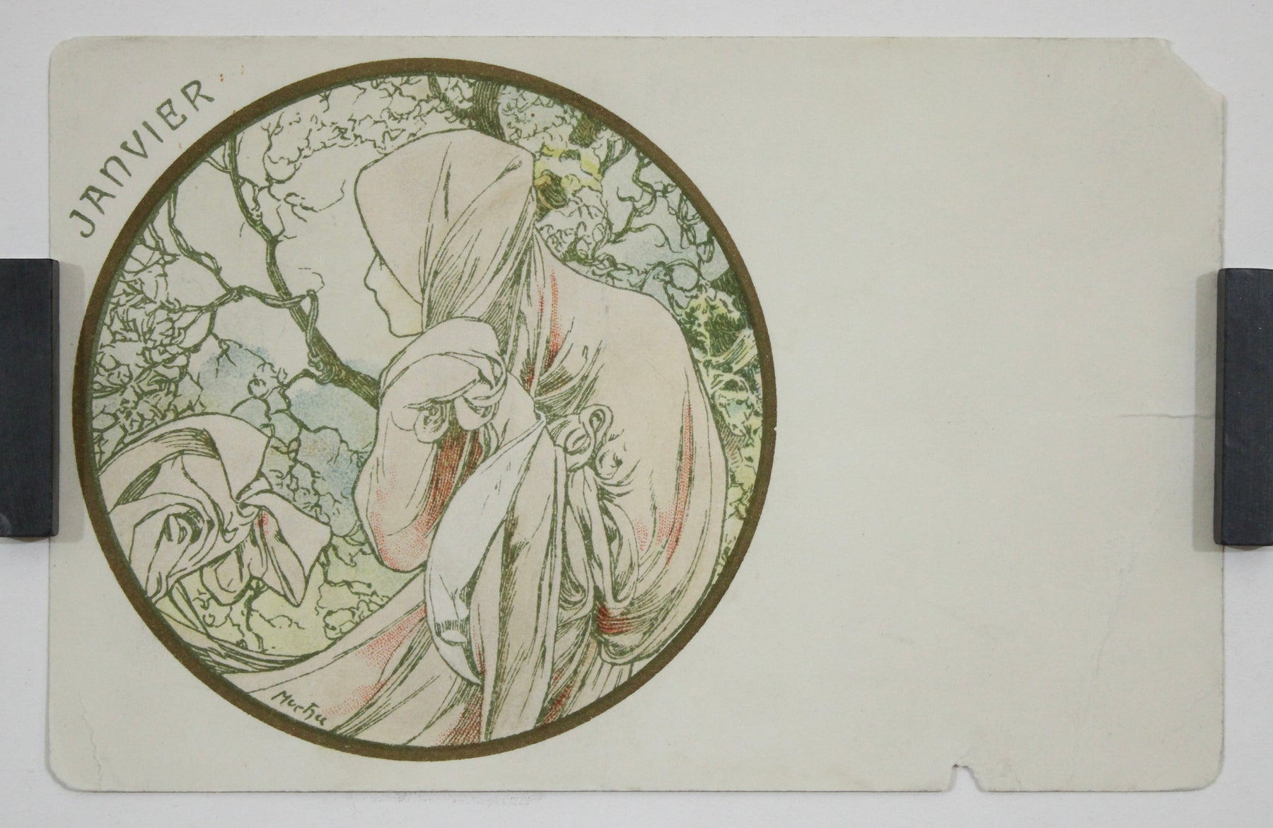 Imprimée dans le cadre d'une série de cartes postales de collection, cette œuvre célèbre les mois de janvier à travers la beauté de l'art allégorique. Avec « Janvier », Mucha invite le spectateur dans un univers serein où le temps, la nature et la féminité sont éternellement liés.