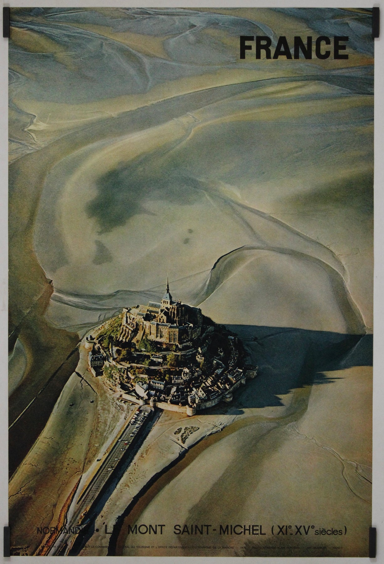 Cette affiche vintage originale de 1972, signée du photographe Perceval, immortalise la beauté époustouflante du Mont-Saint-Michel, l'un des monuments les plus emblématiques de France. Nichée en Normandie, cette abbaye médiévale, construite entre le XIIe et le XVe siècle, se dresse majestueusement au milieu des sables, offrant un spectacle empreint de mystère et de grandeur.