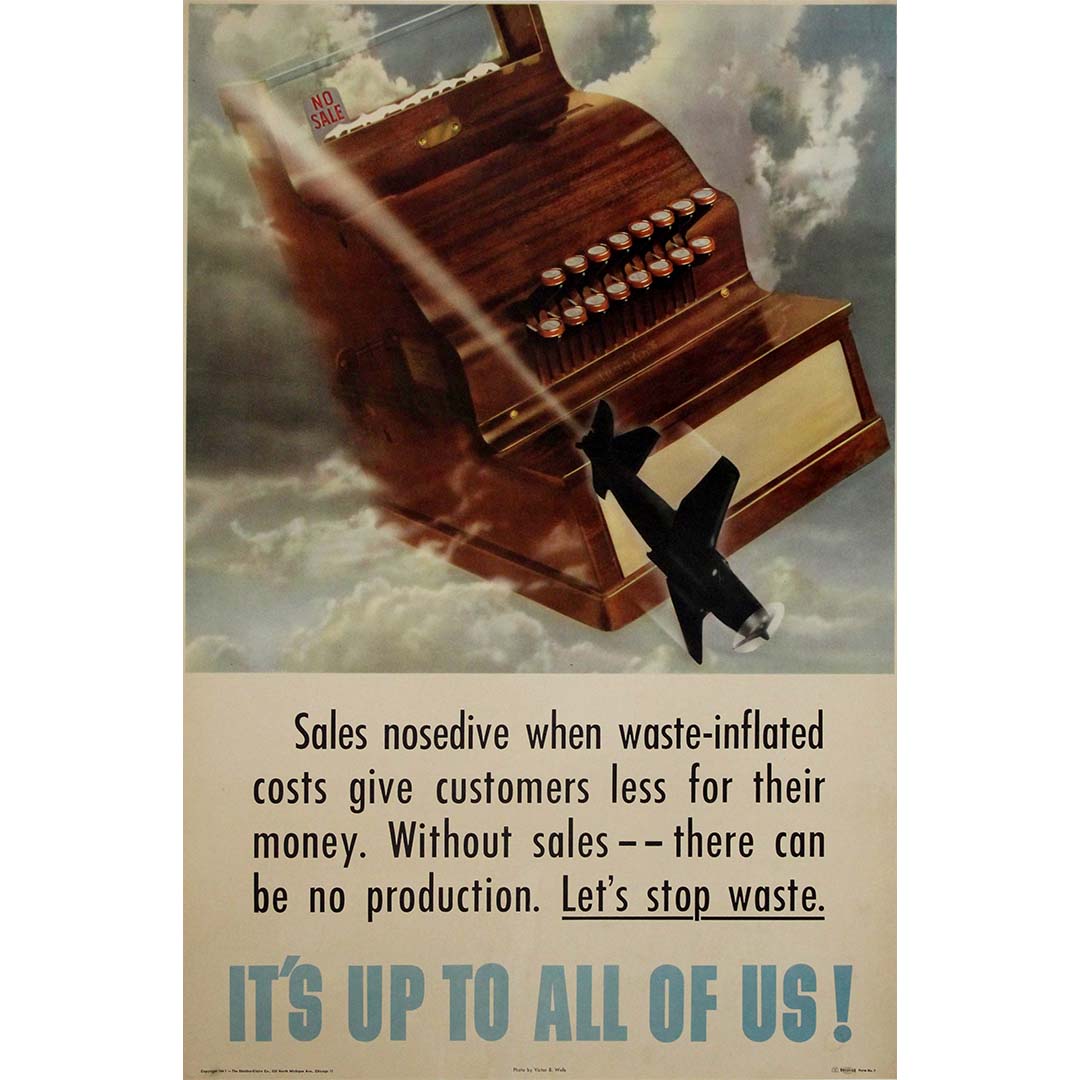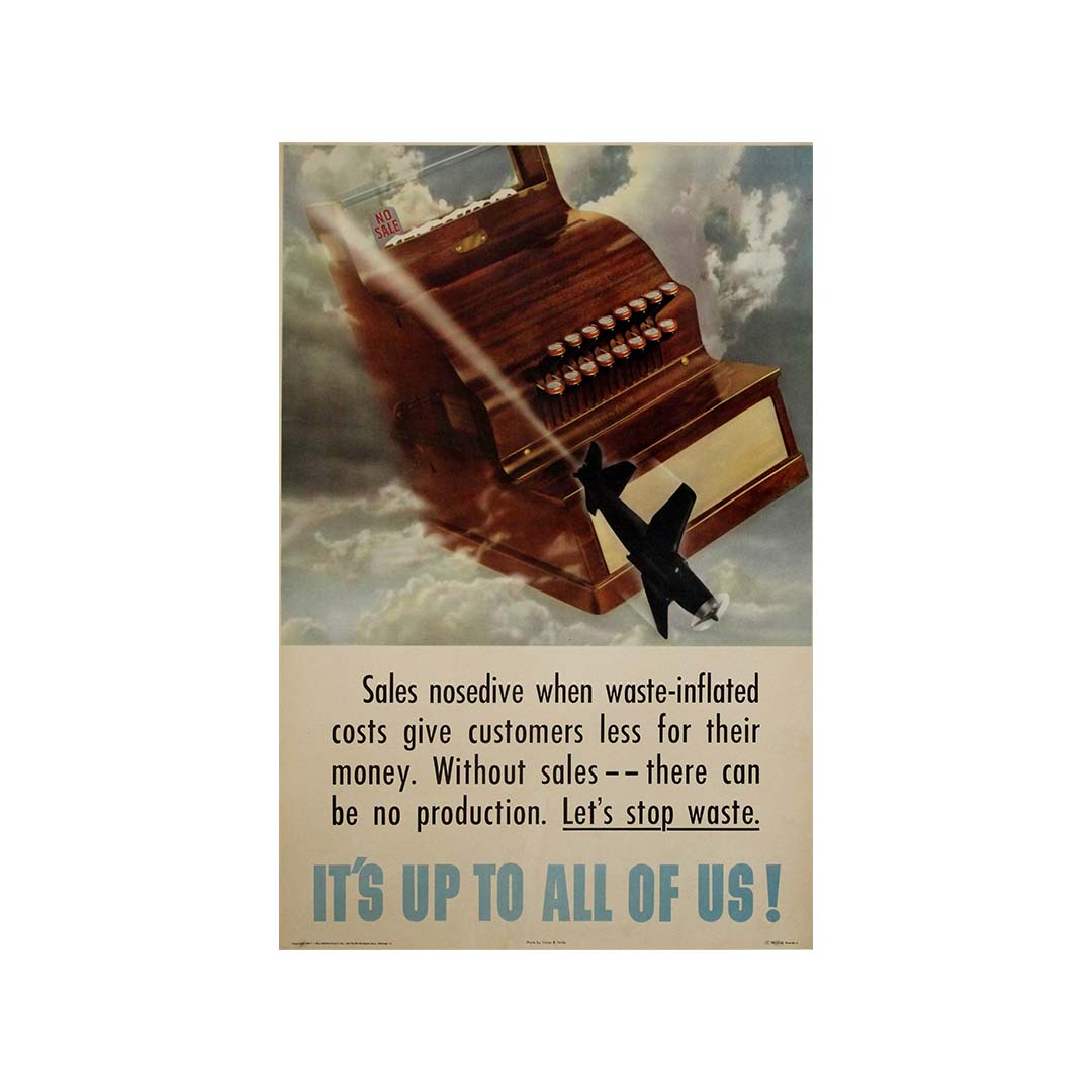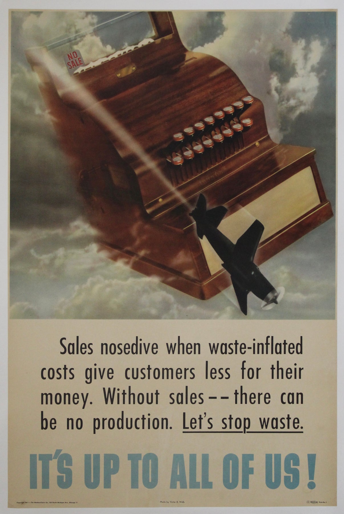 Publiée au lendemain de la Seconde Guerre mondiale et au début de la Guerre froide, cette affiche s'inscrivait dans une campagne nationale contre le gaspillage industriel. Diffusée par le ministère du Commerce américain dans les usines et les entreprises du pays, elle dénonçait un message clair : « Les ventes s'effondrent lorsque les coûts gonflés par le gaspillage réduisent le rapport qualité-prix. » Un avertissement adressé aux ouvriers, aux cadres et aux industriels : l'inefficacité menace la rentabilité et la production.