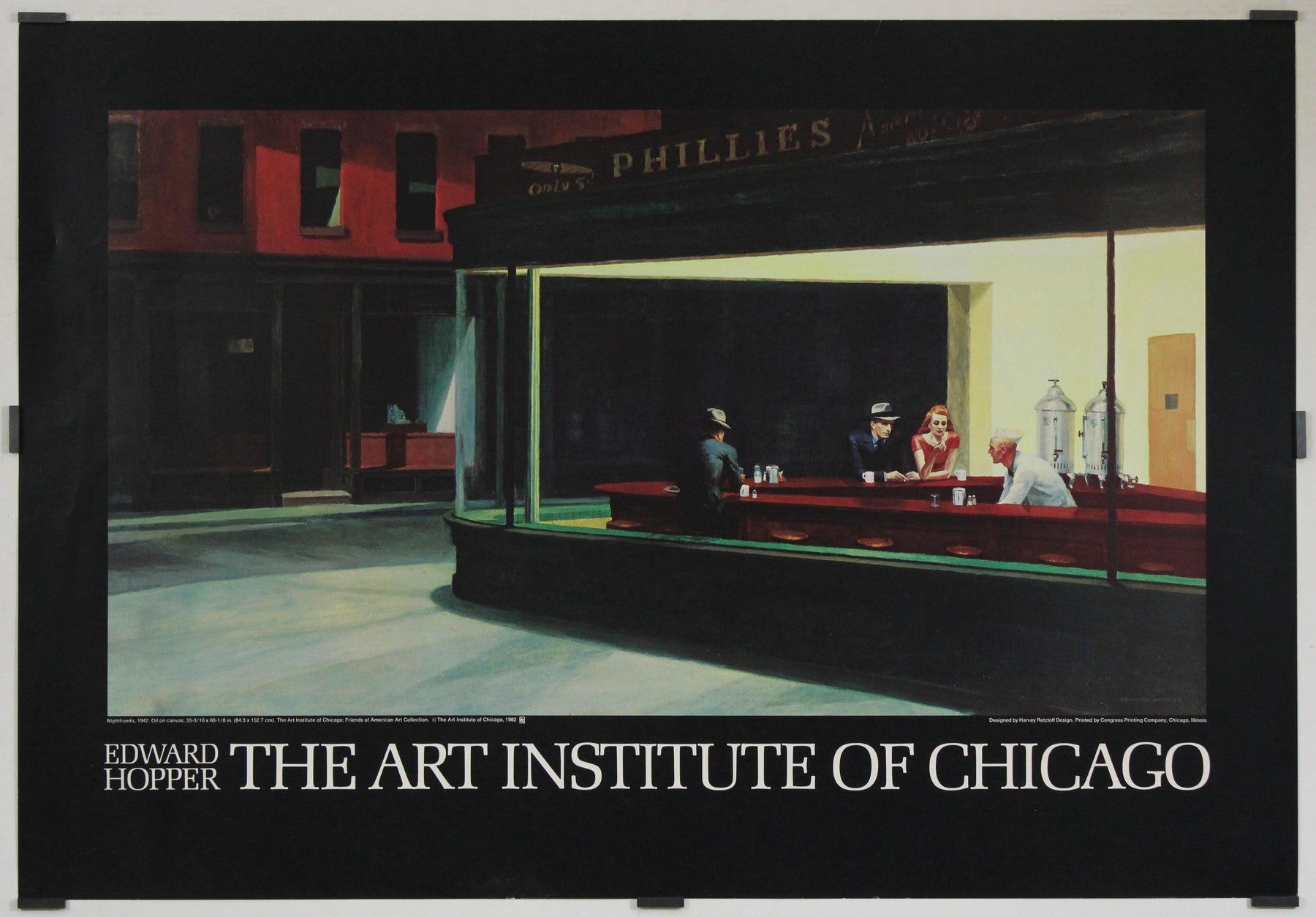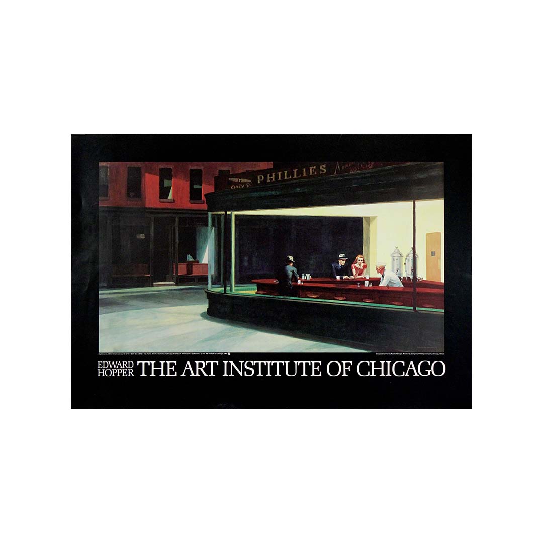 Cette affiche originale a été publiée en 1982 pour une exposition à l'Art Institute de Chicago, présentant l'une des peintures les plus emblématiques d'Edward Hopper : Nighthawks (1942). Ce tableau, qui fait partie de la collection permanente du musée, est devenu l'une des œuvres d'art américaines les plus connues et reproduites du XXe siècle.