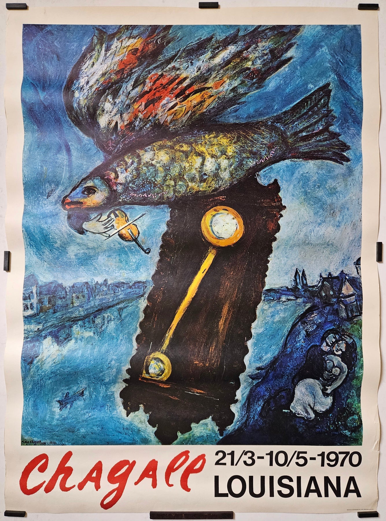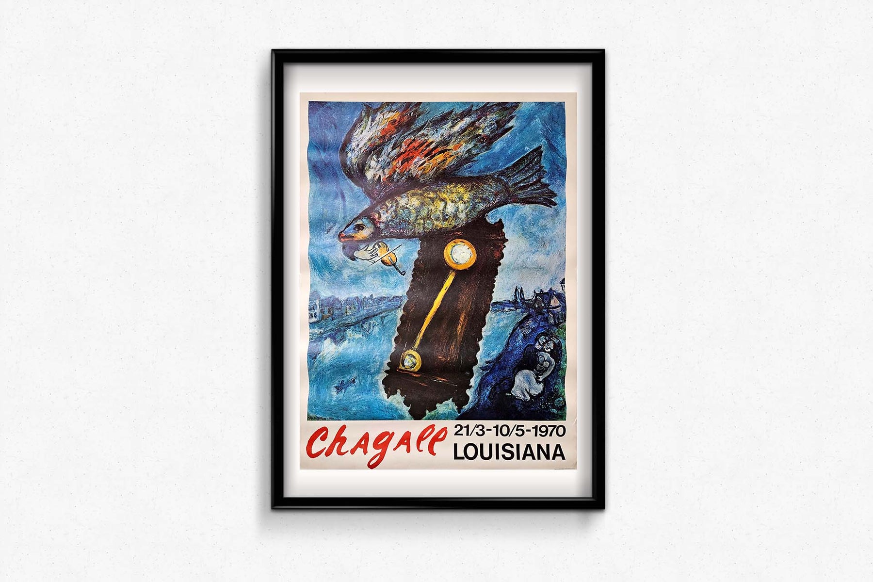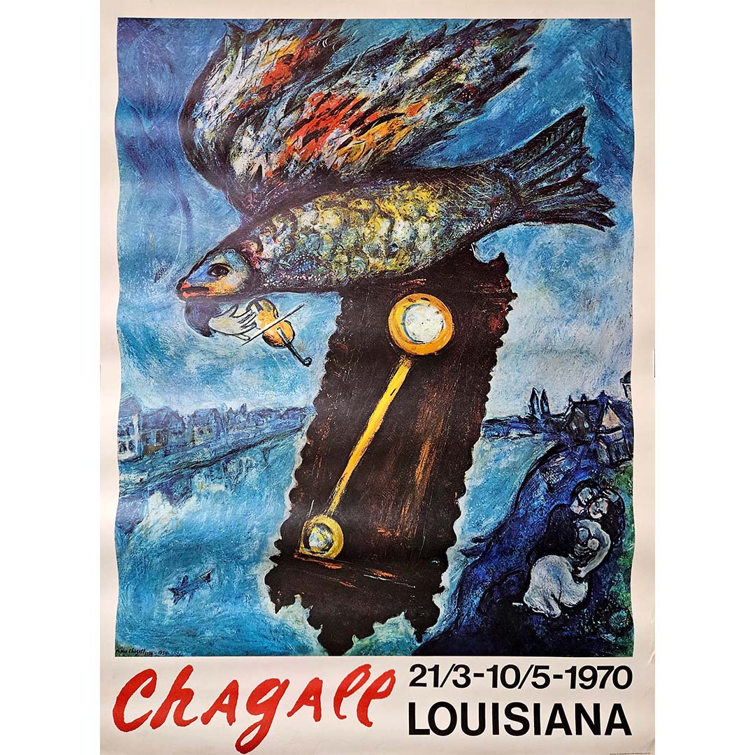 La typographie en bas de l'affiche est simple : « Chagall », écrit en caractères gras rouges, attire immédiatement le regard. Les dates de l'exposition, « 21/3 - 10/5 - 1970 », et le lieu, « LOUISIANA », sont imprimés dans une police sans empattement épurée, garantissant une lisibilité optimale des informations sans nuire à l'impact visuel de l'œuvre.