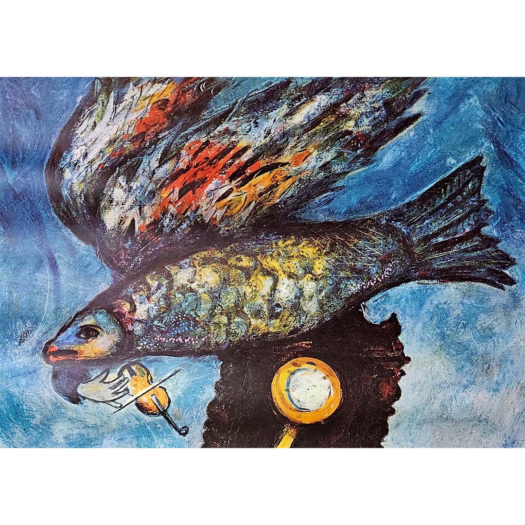 L'affiche présente l'une des images surréalistes caractéristiques de Chagall. Un grand poisson fantastique domine la composition, avec des écailles multicolores et éclatantes qui semblent miroiter et se fondre dans le ciel environnant. Le poisson paraît en plein vol, emportant avec lui un petit oiseau, soulignant ainsi le thème de la liberté et de la transcendance, si cher à l'œuvre de Chagall. En dessous du poisson se dresse une structure sombre et mystérieuse, peut-être une horloge ou une machine abstraite, ornée de sphères lumineuses, conférant à la scène une dimension temporelle et un sentiment d'émerveillement.