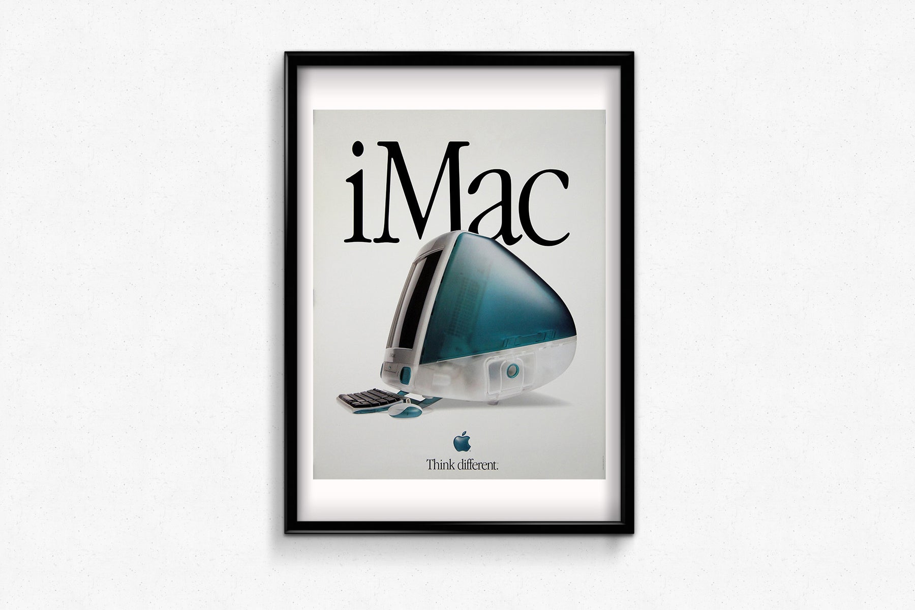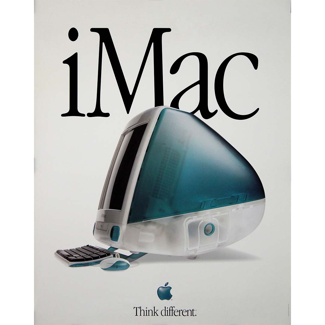 Ci-dessous, le slogan d'Apple, « Think different », structure la composition, affirmant la philosophie de la marque axée sur l'innovation, la créativité et la remise en question des normes industrielles. Lancé en août 1998, année du retour de Steve Jobs chez Apple, l'iMac a marqué une rupture décisive avec les ordinateurs beiges et utilitaires. Son design convivial et ludique, signé Jony Ive, a rendu la technologie accessible et esthétique, faisant de lui une icône culturelle instantanée.