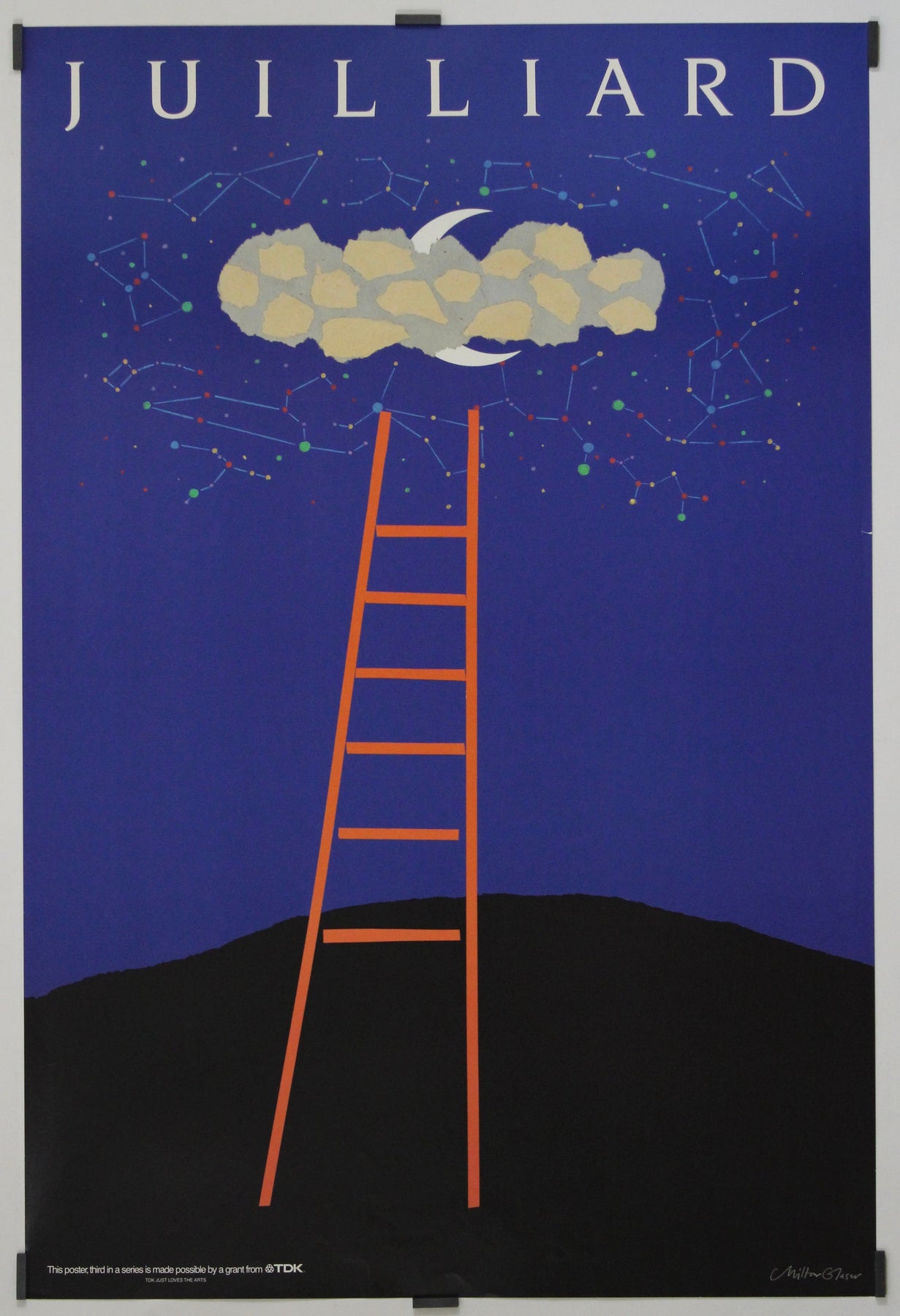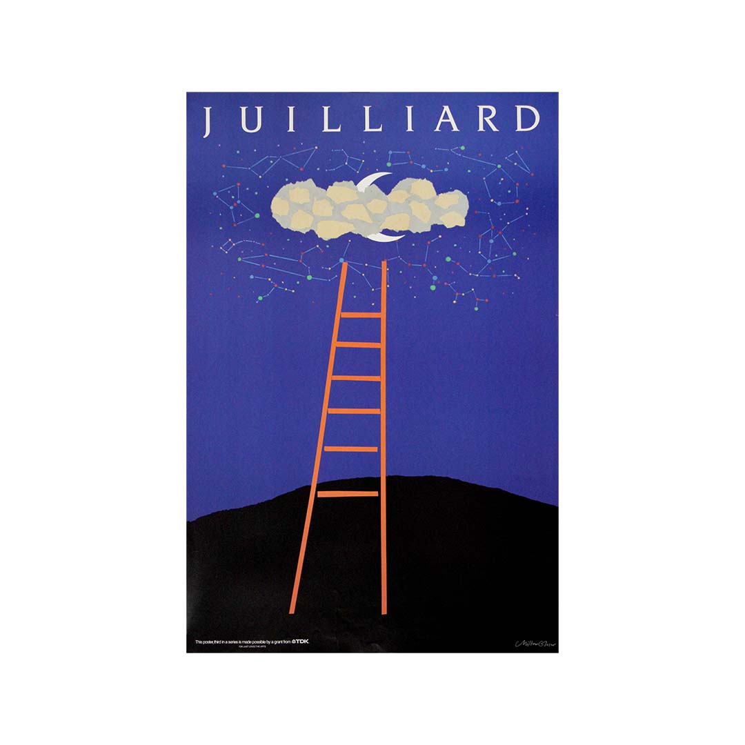 Dans cette affiche de 1989 créée pour la prestigieuse Juilliard School de New York, Milton Glaser — le designer emblématique du logo « I ♥ NY » — propose une métaphore minimaliste et profondément poétique de l'ambition artistique. Avec son style inimitable, alliant humour visuel et clarté conceptuelle, Glaser construit une image à la fois surréaliste et profondément porteuse de sens.