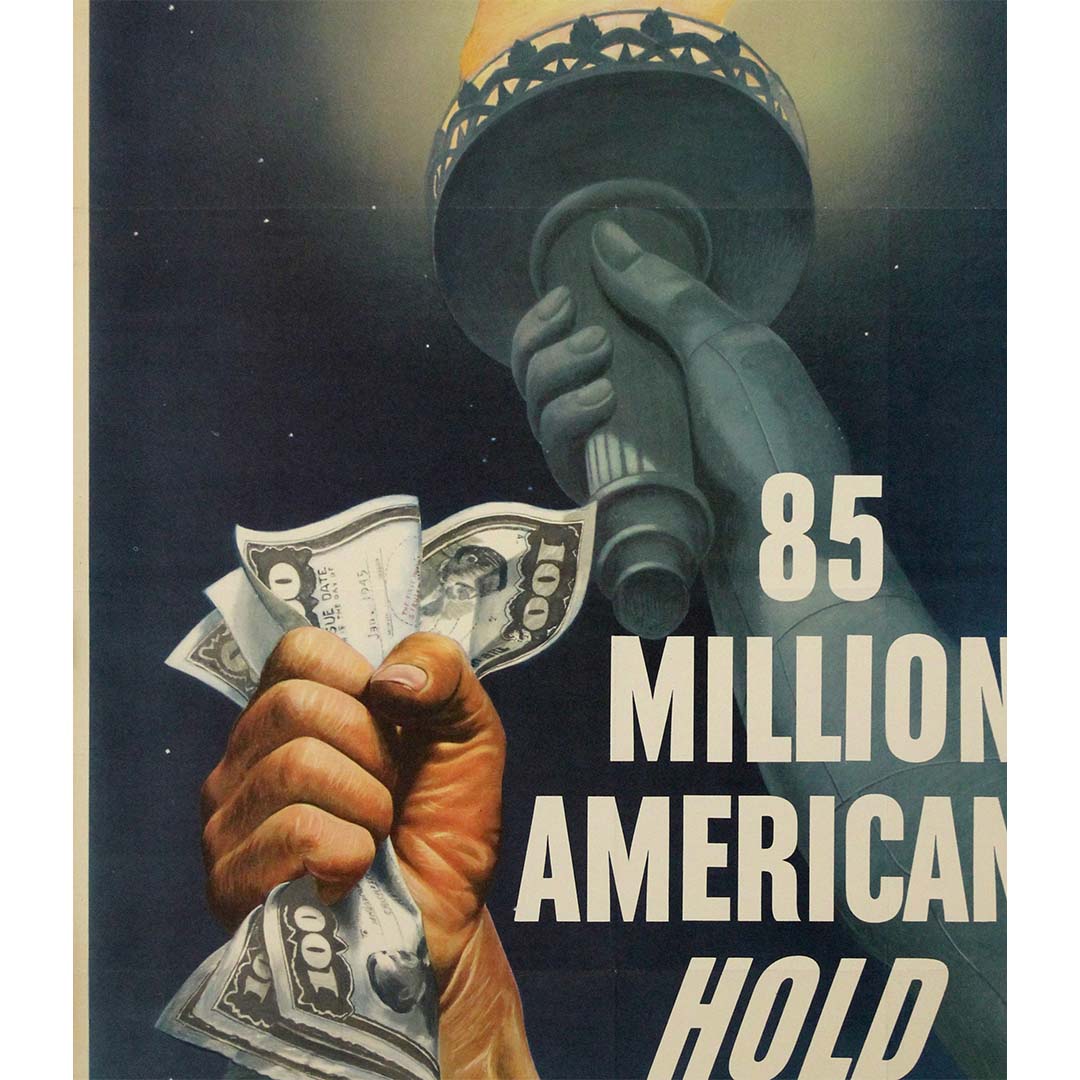 La typographie est monumentale. « 85 MILLIONS D'AMÉRICAINS DÉTENENT DES OBLIGATIONS DE GUERRE » relève moins du slogan que de la statistique, une affirmation péremptoire, écrite en caractères sans empattement massifs et imposants. L'emploi du mot « DÉTENIR » en italique lui confère une dynamique subtile, comme si le simple fait de détenir ces obligations constituait en soi une forme de défense active et permanente. Cela ne se limite pas à une action passée, mais témoigne d'un engagement présent.