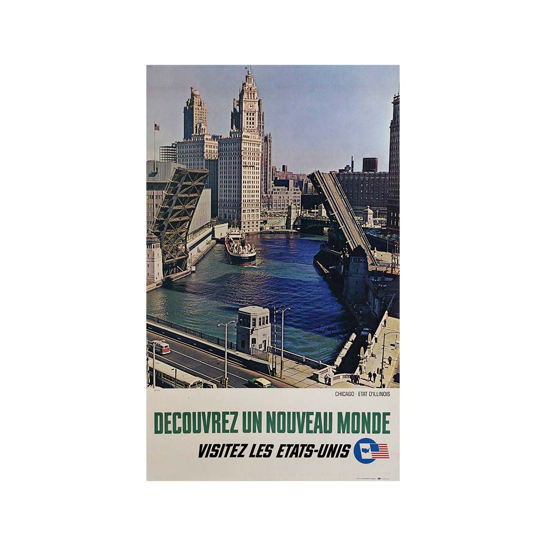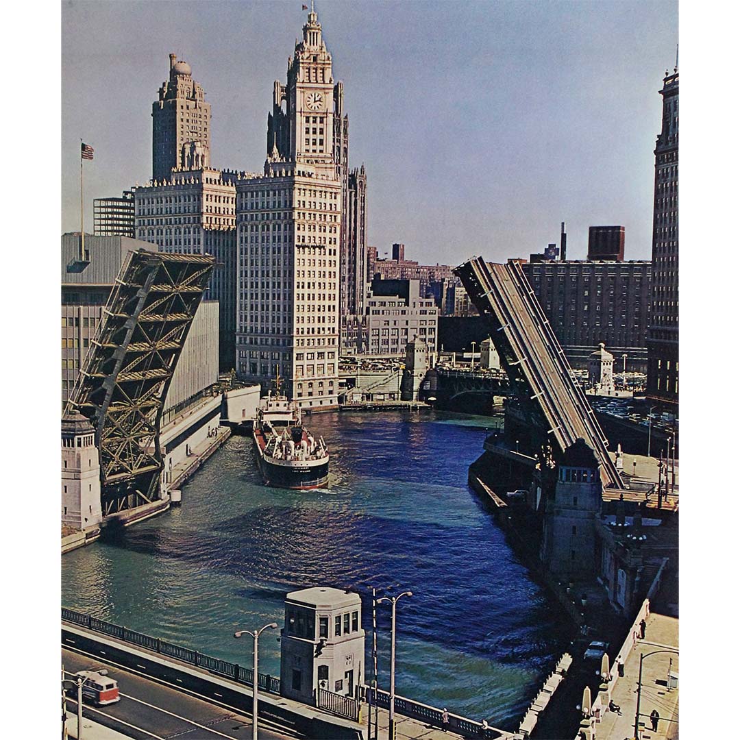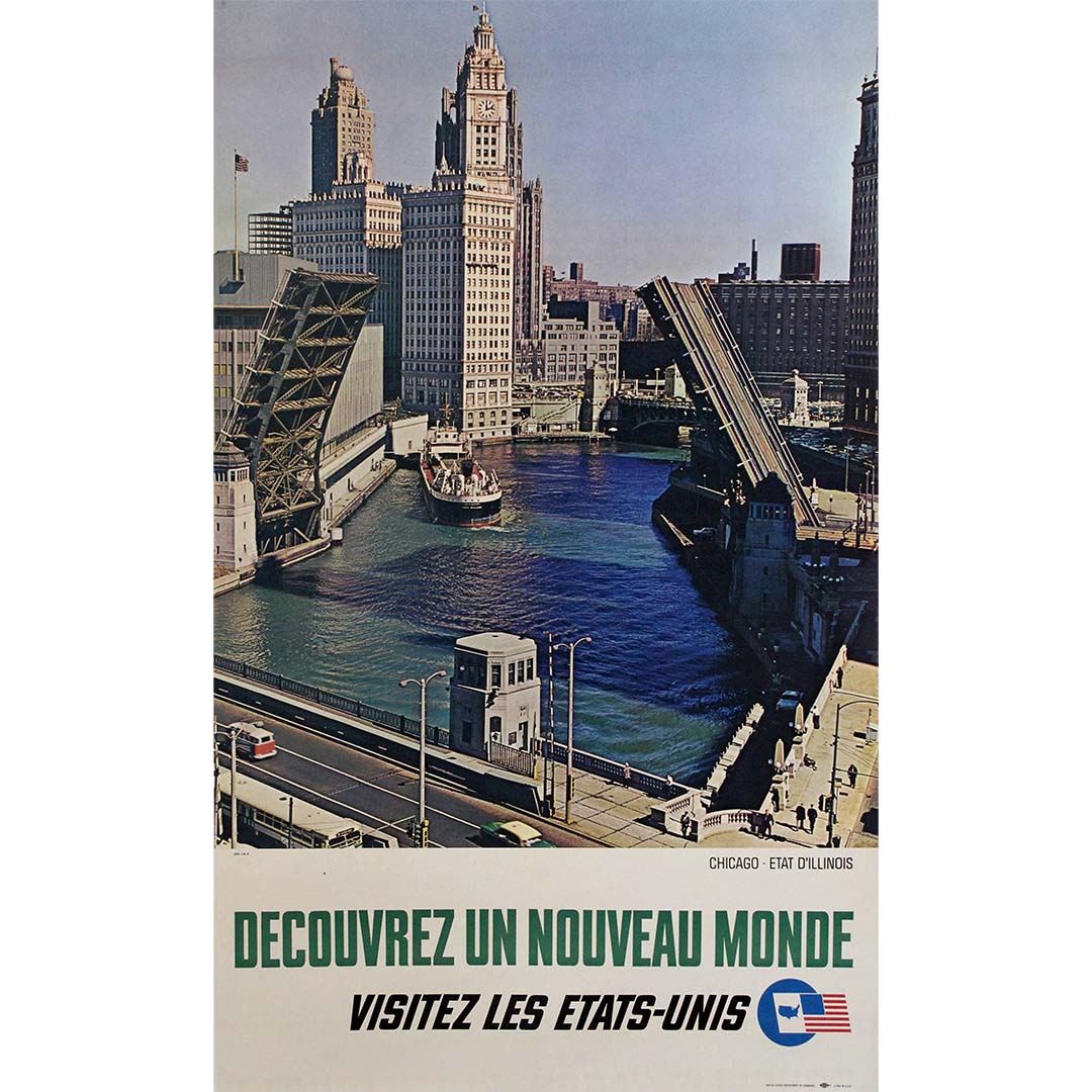 L'affiche offre une vue dynamique du centre-ville de Chicago, mettant en valeur le Wrigley Building et la Tribune Tower, avec un pont-levis classique se levant pour laisser passer un bateau sur la rivière Chicago. Ce cliché reflète la grandeur architecturale et le dynamisme industriel de la ville, symboles de l'optimisme et du progrès de l'Amérique de l'après-guerre.
