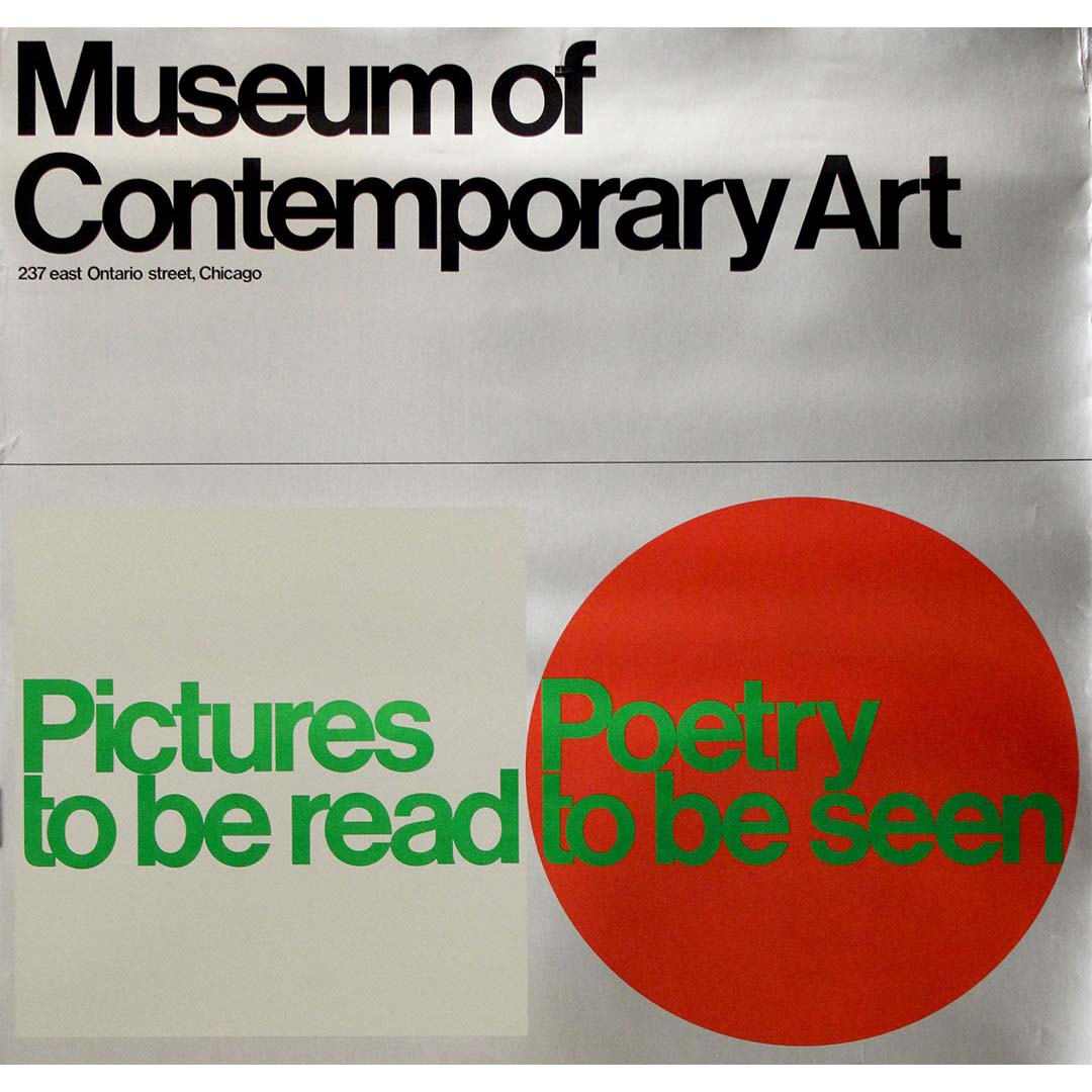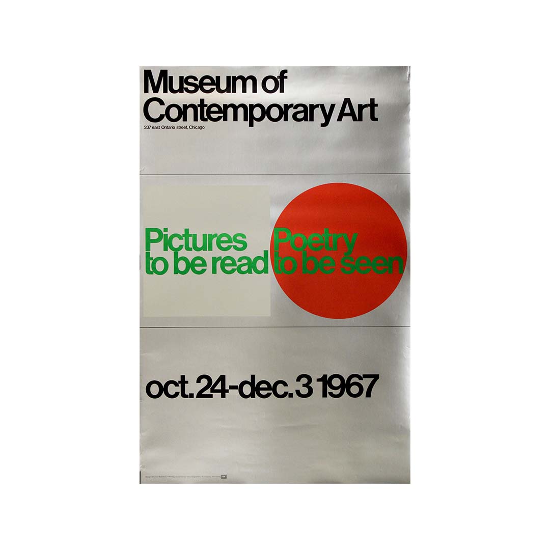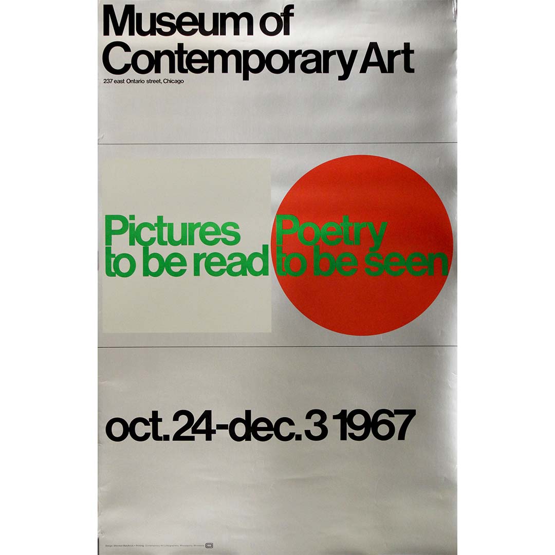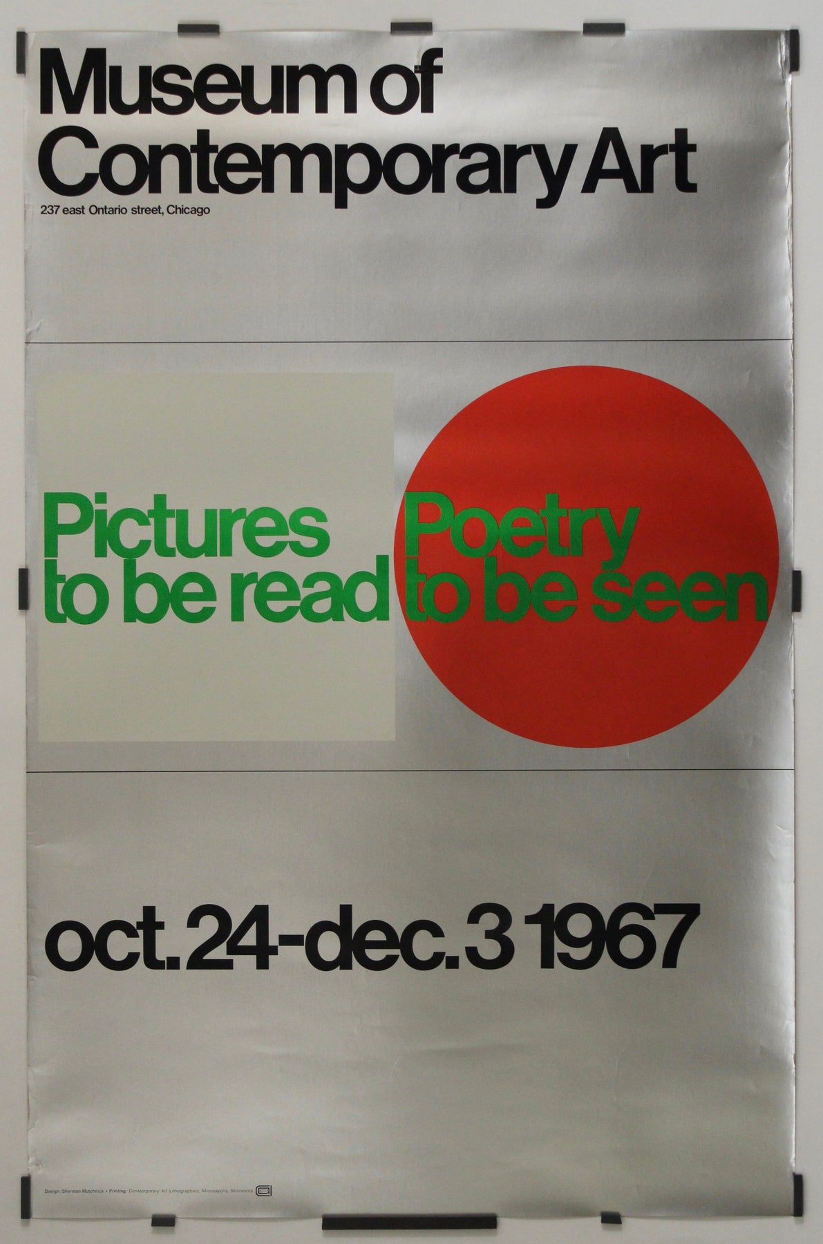 Il s'agit d'une affiche originale de l'exposition « Pictures to be Read / Poetry to be Seen », conçue par Sherman Mutchnick en 1967 pour le Musée d'art contemporain de Chicago. Présentée du 24 octobre au 3 décembre 1967, cette exposition explorait l'intersection du langage visuel et verbal, réunissant des artistes dont le travail brouillait les frontières entre image et texte – des concepts qui allaient définir une grande partie de l'art de la fin du XXe siècle.