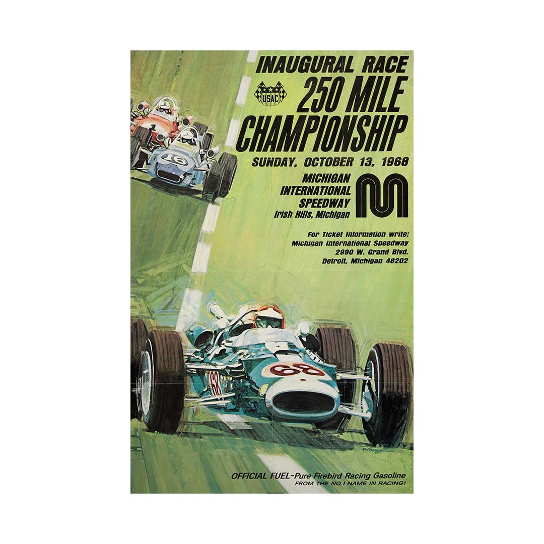 Le visuel de Van Voorhis reflète la popularité croissante des championnats automobiles américains à cette époque, où des circuits spécialement conçus à cet effet, comme le Michigan International Speedway, devenaient des lieux incontournables pour les grandes compétitions. Les références aux sponsors, la typographie audacieuse et les détails promotionnels soulignent la vocation première de l'affiche : à la fois publicité et célébration visuelle du sport automobile moderne.