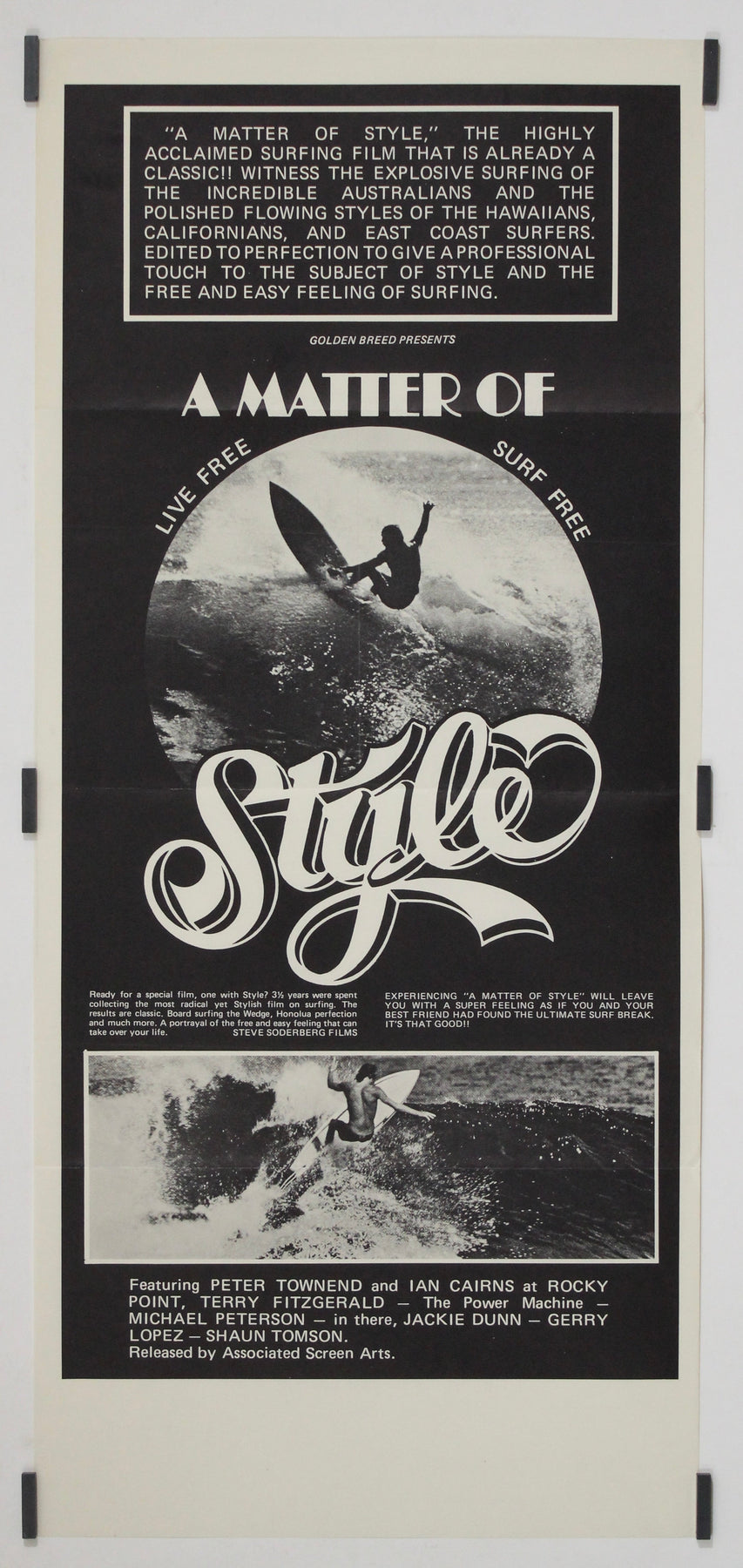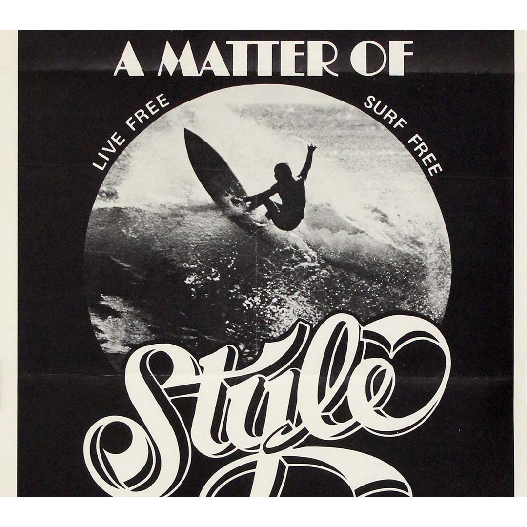Cette affiche originale de 1976 pour le film « A Matter of Style » capture l'essence même de la culture surf des années 1970 : audacieuse, expressive et d'une liberté assumée. Distribué par Associated Screen Arts et produit par Golden Breed, le film est rapidement devenu culte dans le monde du surf, salué pour son approche unique qui met en valeur la fluidité, la forme et la finesse du surf.