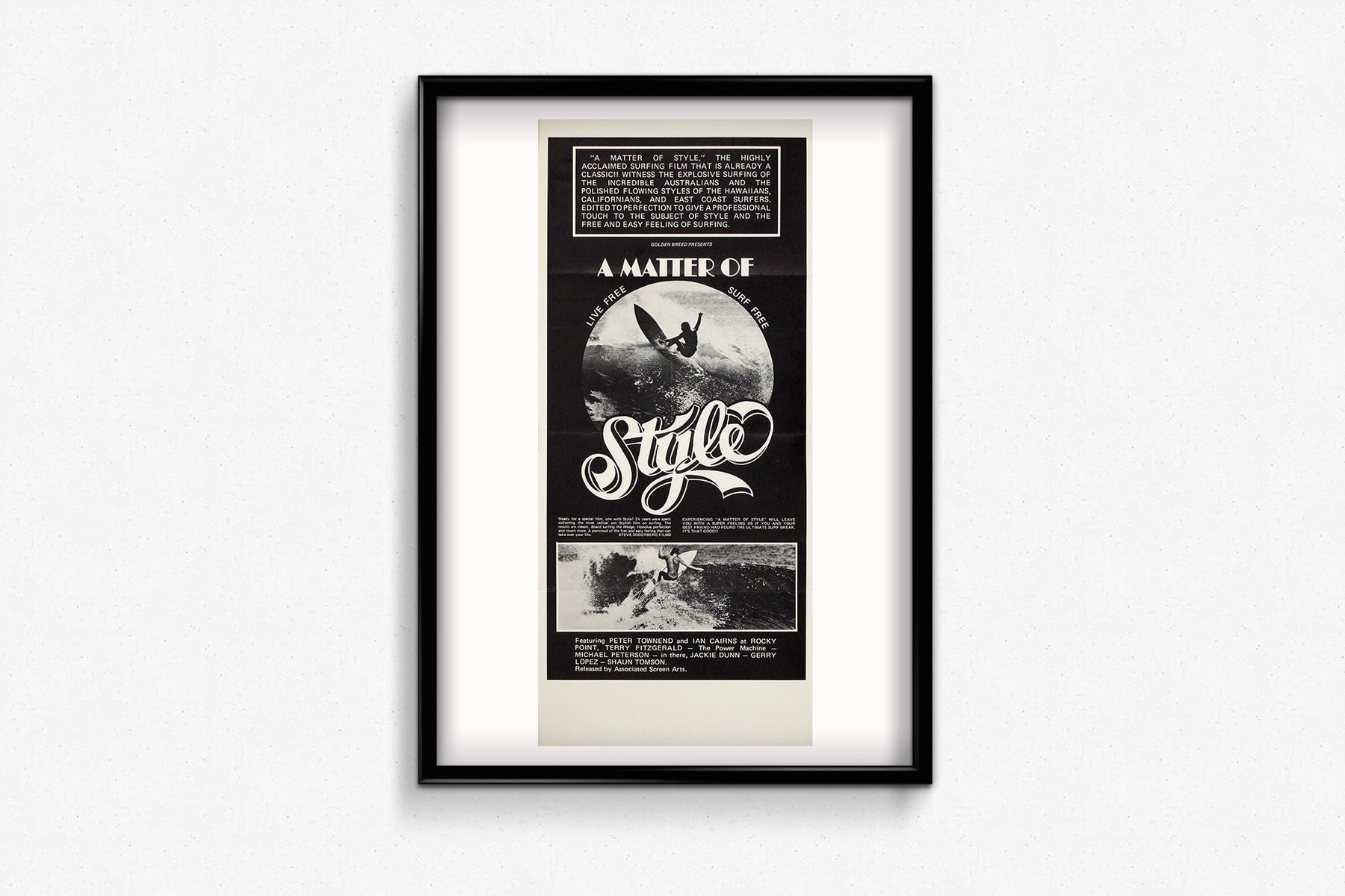 « A Matter of Style » met en lumière quelques-uns des noms les plus emblématiques du surf des années 1970, parmi lesquels Peter Townend, Ian Cairns, Terry Fitzgerald (« The Power Machine »), Michael Peterson, Gerry Lopez et Shaun Tomson. Tourné sur des spots mythiques comme Rocky Point, le film souligne l'énergie explosive des surfeurs australiens et la technique élégante des Hawaïens et des Californiens. Le montage, d'une qualité professionnelle, en fait bien plus qu'un simple film de surf : une véritable ode visuelle à l'art de vivre surf.