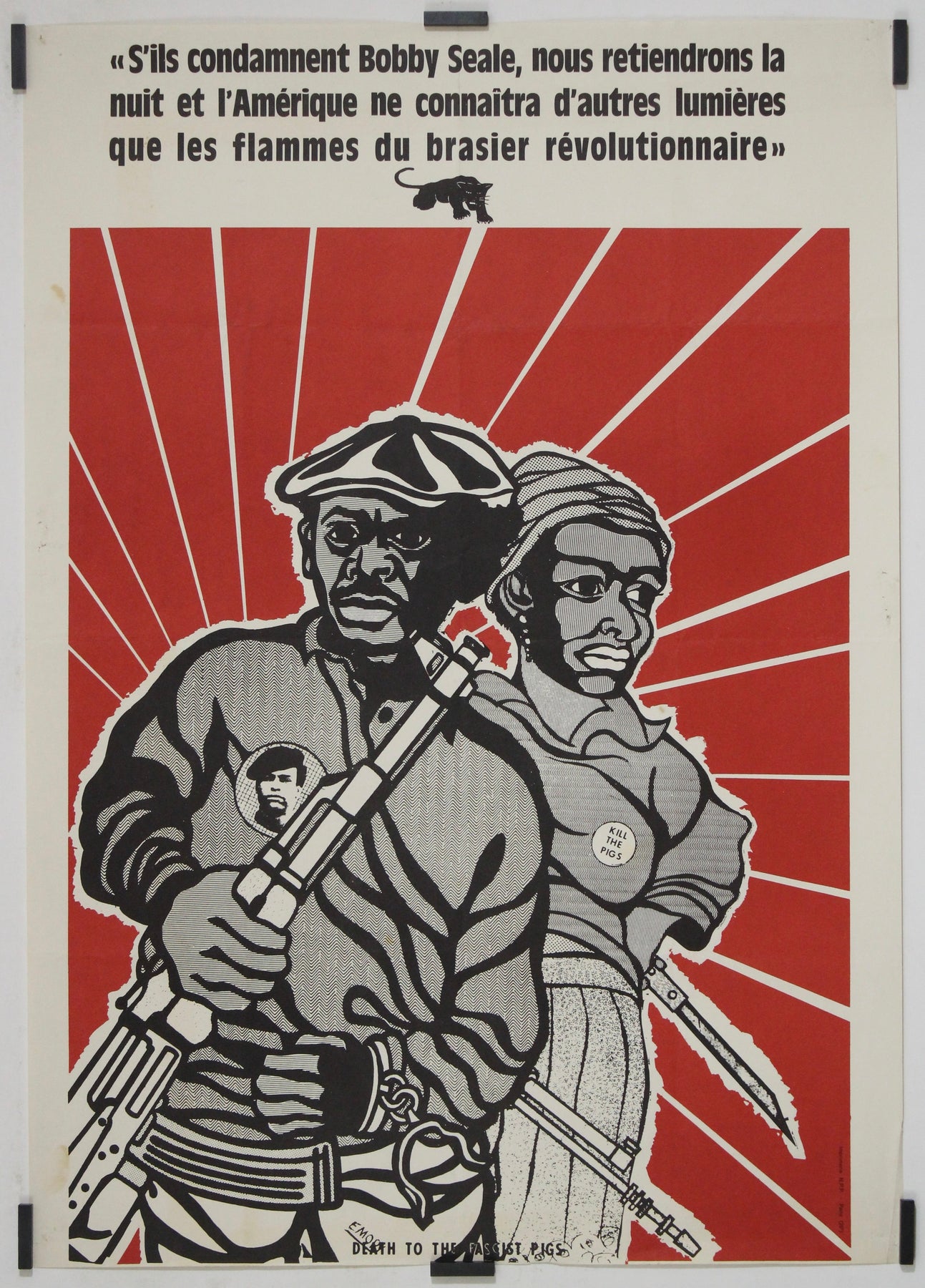 L'affiche représente deux hommes noirs armés, dessinés dans le style graphique et audacieux caractéristique de Douglas, se dressant avec défi sur un fond rouge traversé de rayons blancs – une composition qui évoque l'énergie et l'urgence révolutionnaires. L'un porte un badge à l'effigie de Bobby Seale, cofondateur du Black Panther Party. Le second porte un badge où l'on peut lire : « À mort les flics ! »