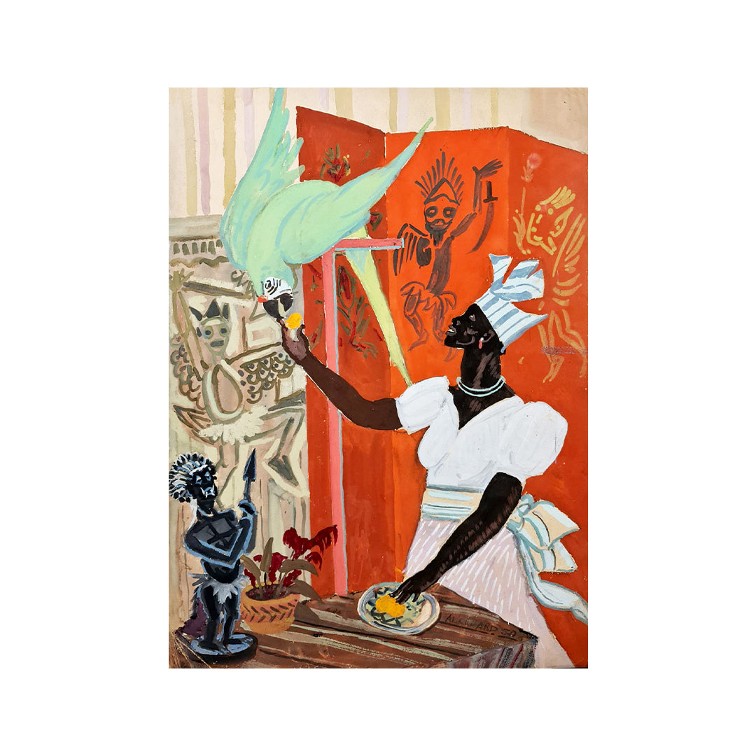 Gouache aux couleurs magnifiques, réalisée en 1950. On apprécie les détails des vêtements traditionnels de cette femme qui nourrit son perroquet.
