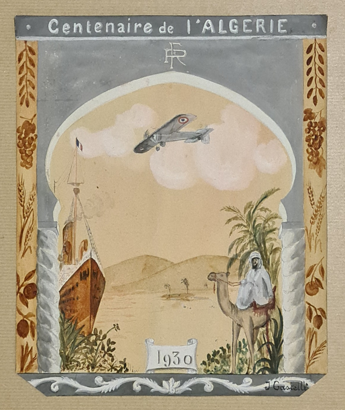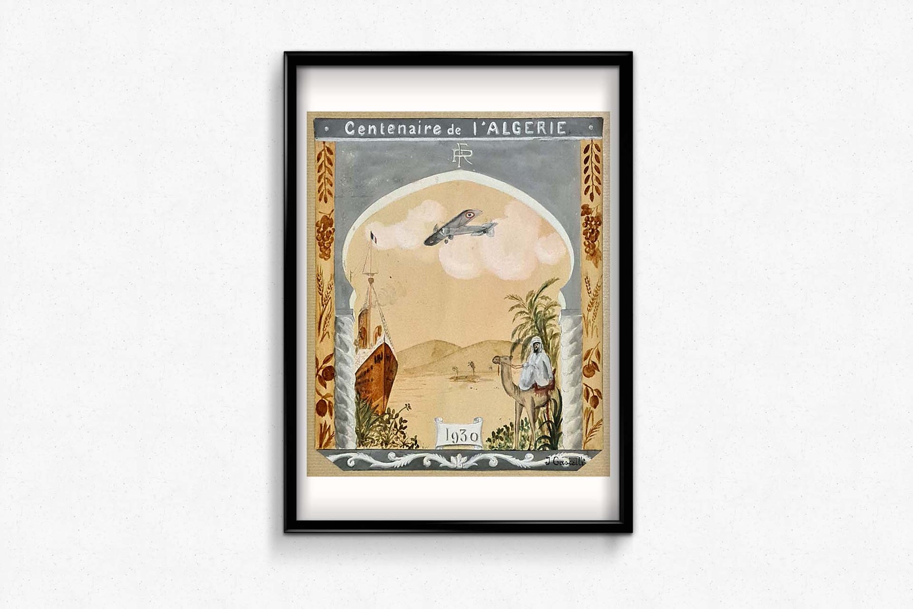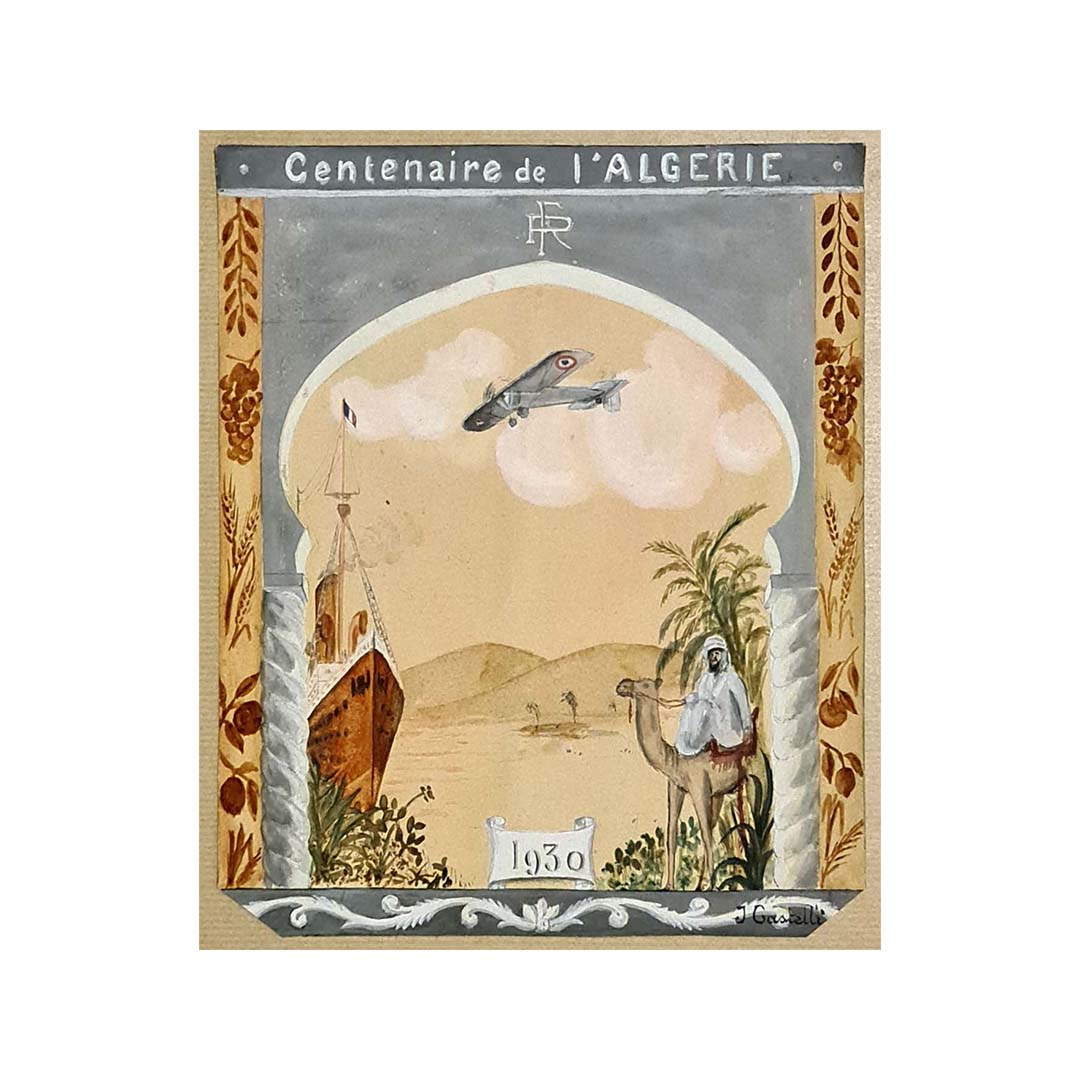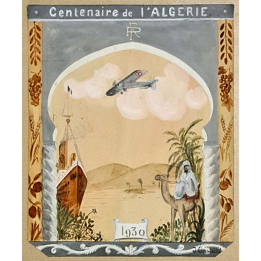 En 1930, le talentueux artiste J. Castelli réalisa une aquarelle remarquable pour commémorer le Centenaire de l'Algérie, marquant un siècle d'importance historique et culturelle pour le pays. Cette œuvre témoigne du génie artistique de Castelli et de son talent à saisir l'esprit d'un événement marquant.