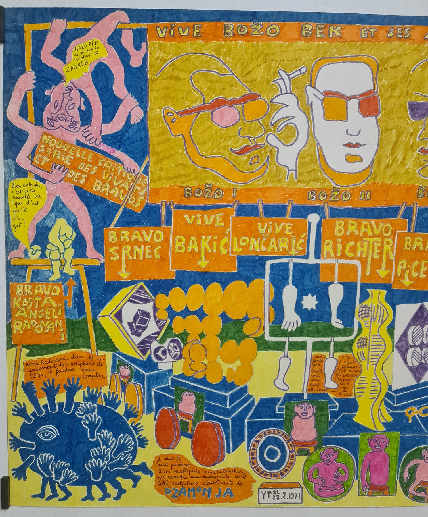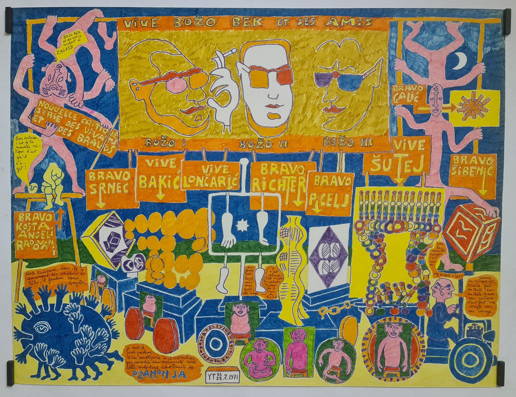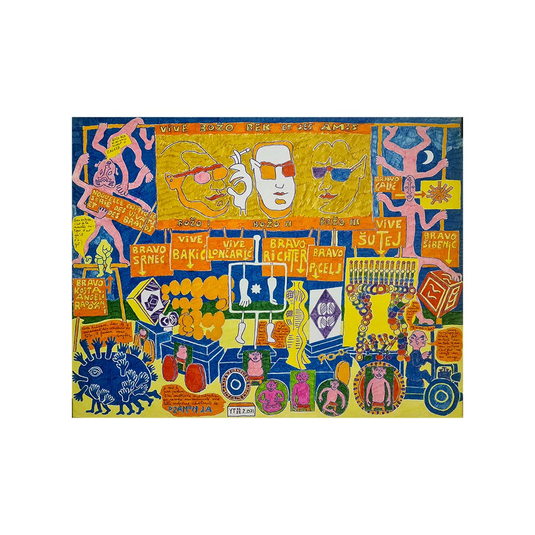 Plongez dans l'univers fantastique d'Yvon Taillandier avec Vive Bozo Bek et ses amis , une ode jubilatoire à l'imagination et à la camaraderie. Figure centrale de l'avant-garde française d'après-guerre et collaborateur de longue date du Salon de Mai, Taillandier a développé un langage visuel unique, le « Système Taillandier » : un univers peuplé de personnages récurrents, de mots inventés et de récits symboliques.
