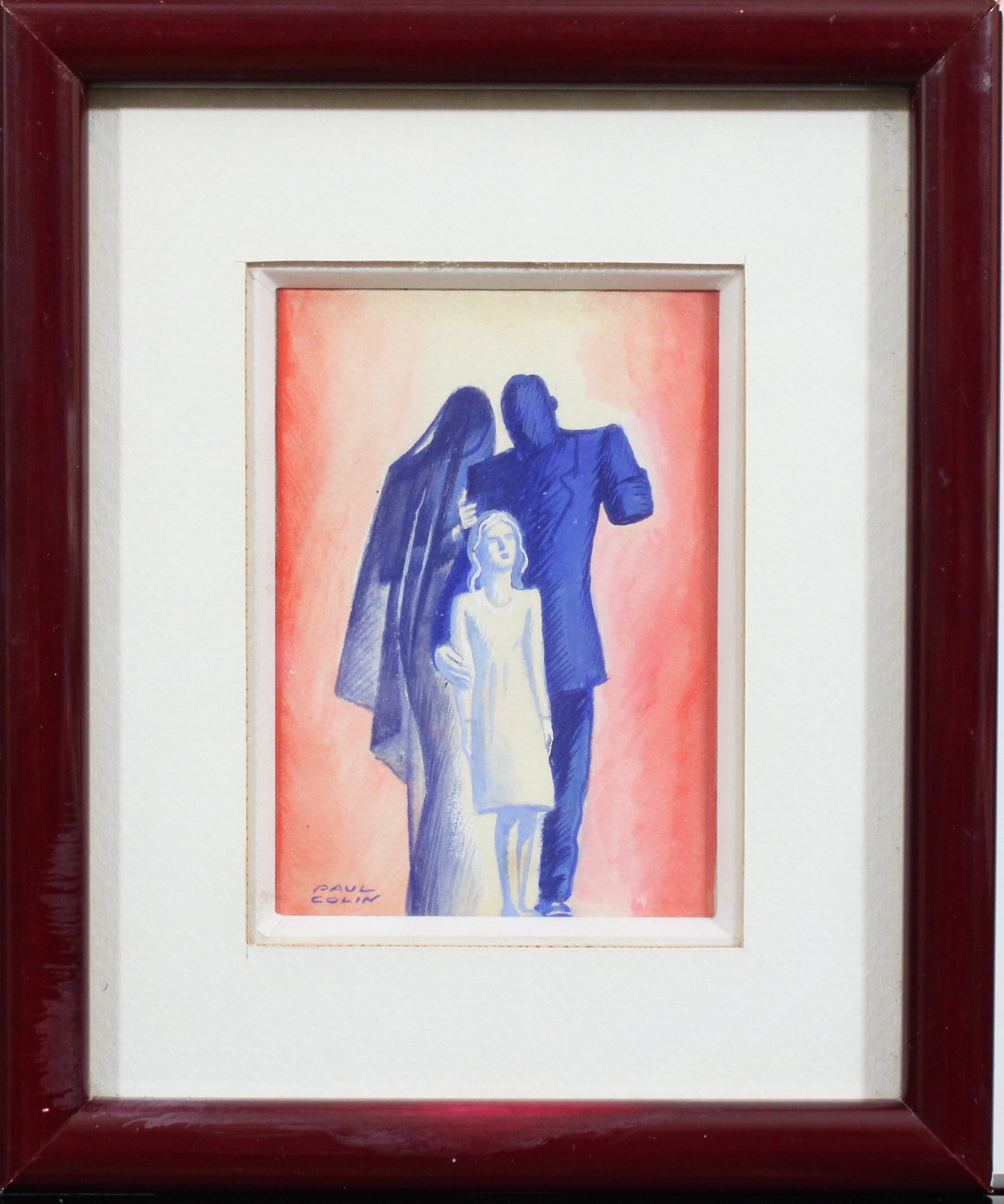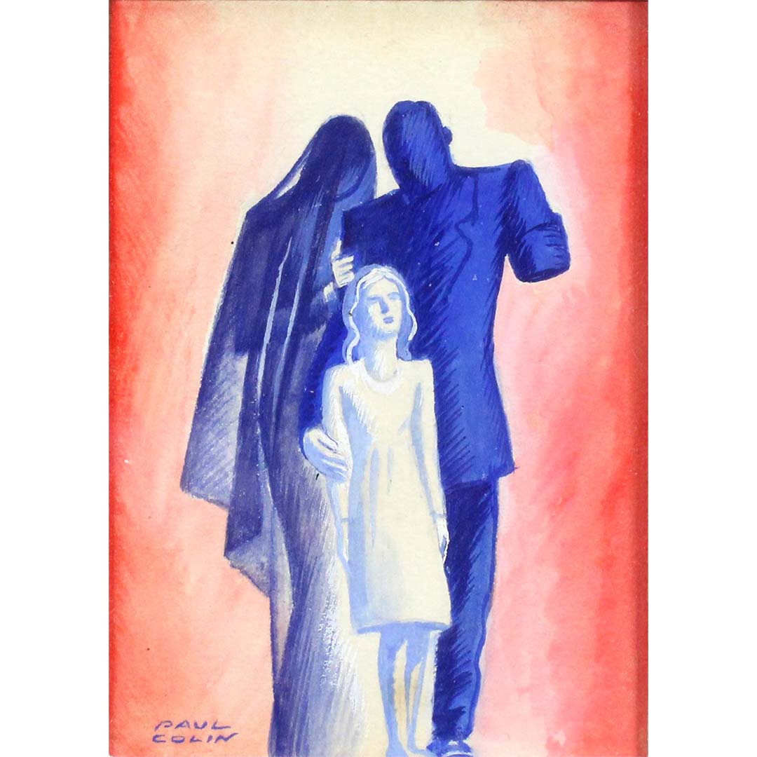 Dans cette gouache et aquarelle originale, poignante et rare, le célèbre artiste français Paul Colin aborde un sujet profondément humain et sombre : les mutilations de guerre et leurs conséquences. Créée vers 1940, pendant ou juste après le début de la Seconde Guerre mondiale, l’œuvre semble être une étude préparatoire pour une illustration centrée sur le traumatisme psychologique et physique de la guerre sur les soldats et leurs familles.