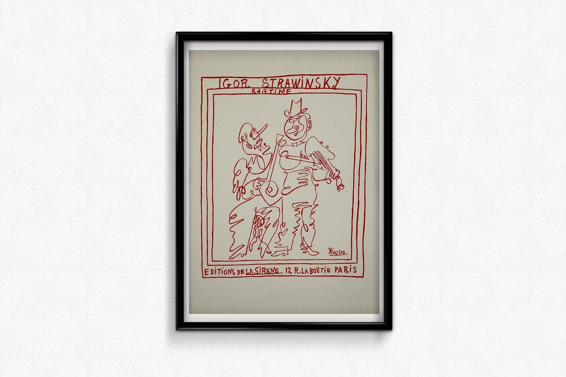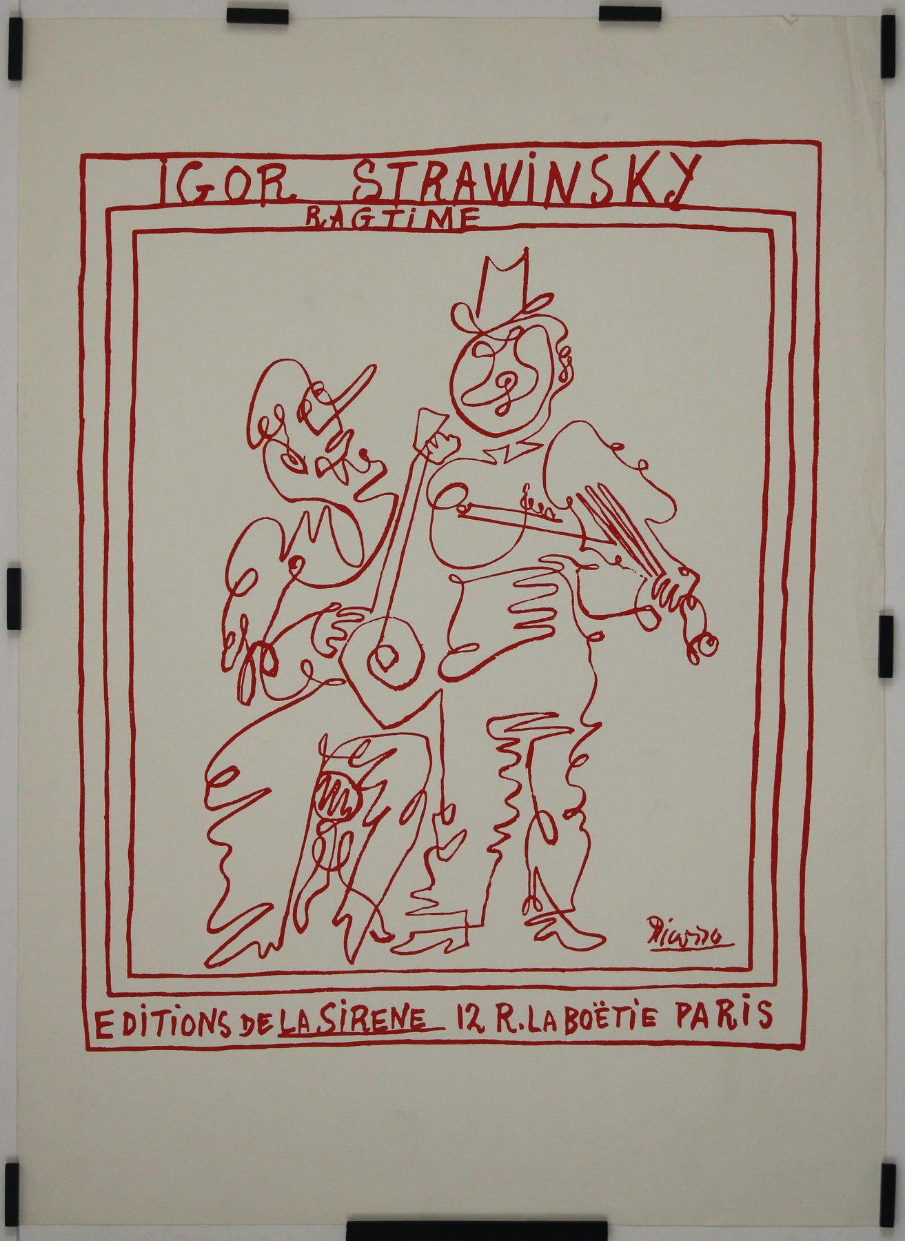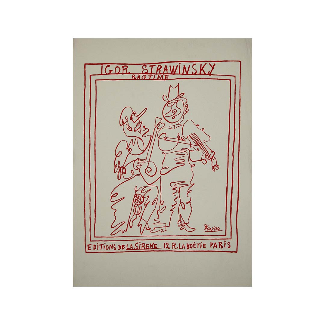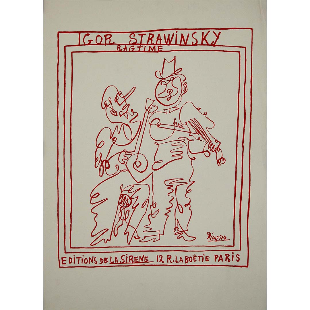 La couverture originale de Pablo Picasso pour « Ragtime » d'Igor Stravinsky est une fusion remarquable entre deux géants de l'art du XXe siècle, illustrant le style d'avant-garde de Picasso et son approche novatrice des arts visuels. Créée durant une période d'expérimentation et de collaboration artistiques intenses entre Picasso et Stravinsky, cette couverture témoigne de leur intérêt commun pour le dépassement des limites des formes traditionnelles et l'exploration de nouvelles possibilités artistiques.