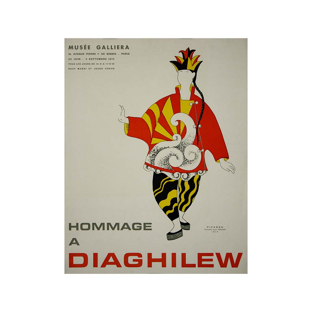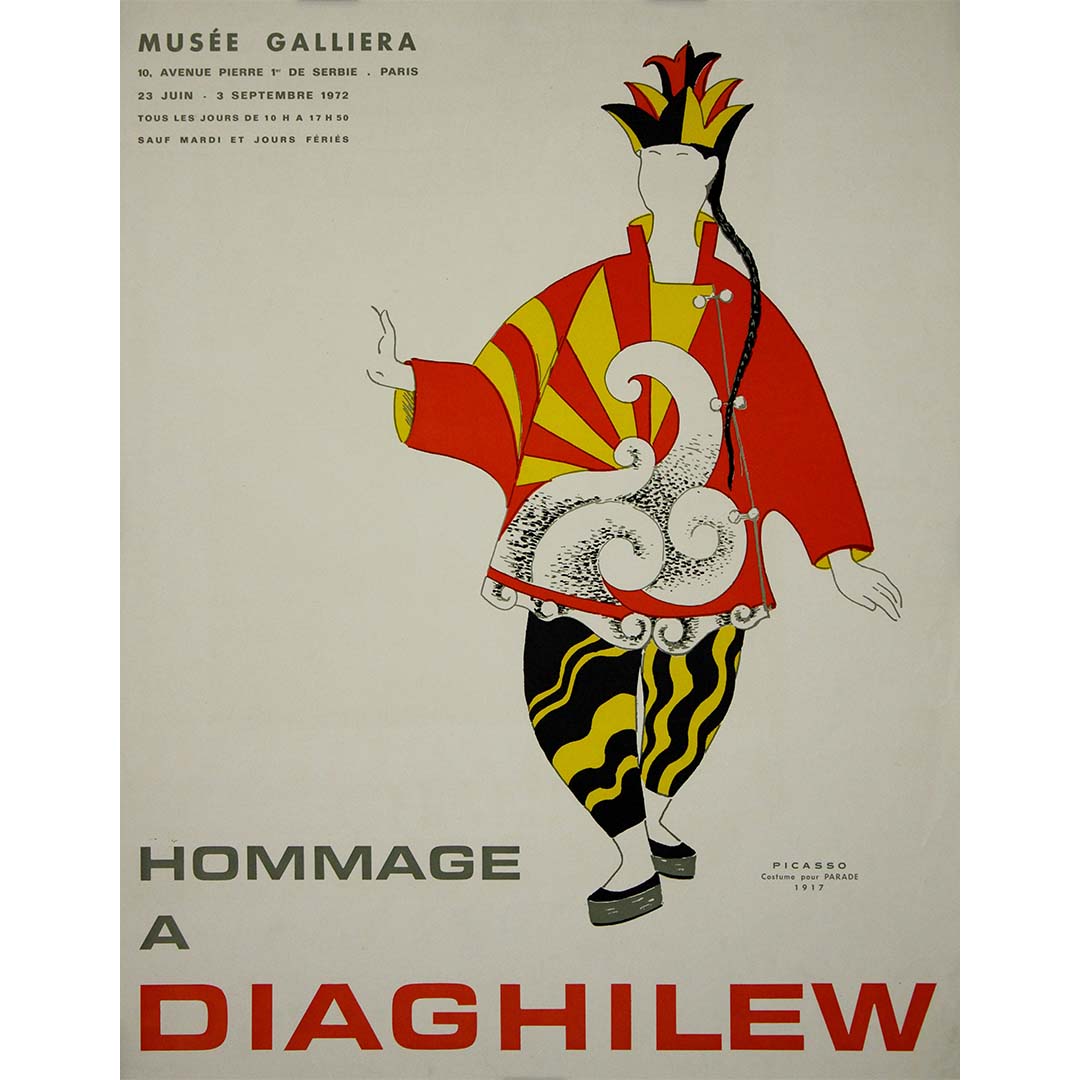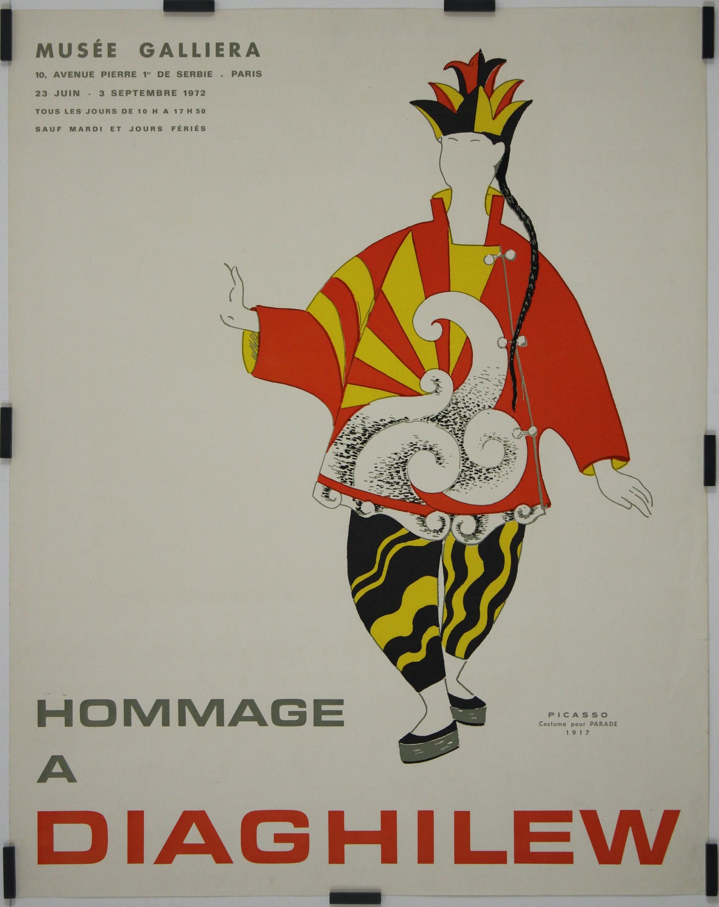 Cette affiche d'exposition originale, saisissante, date de 1972 et a été créée pour l' hommage à Diaghilew présenté au musée Galliera à Paris, en hommage au légendaire impresario russe Sergueï Diaghilev, fondateur des Ballets russes. Elle reprend un costume iconique dessiné par Pablo Picasso pour le ballet d'avant-garde Parade (1917), l'une des collaborations les plus révolutionnaires de l'art performatif du XXe siècle.