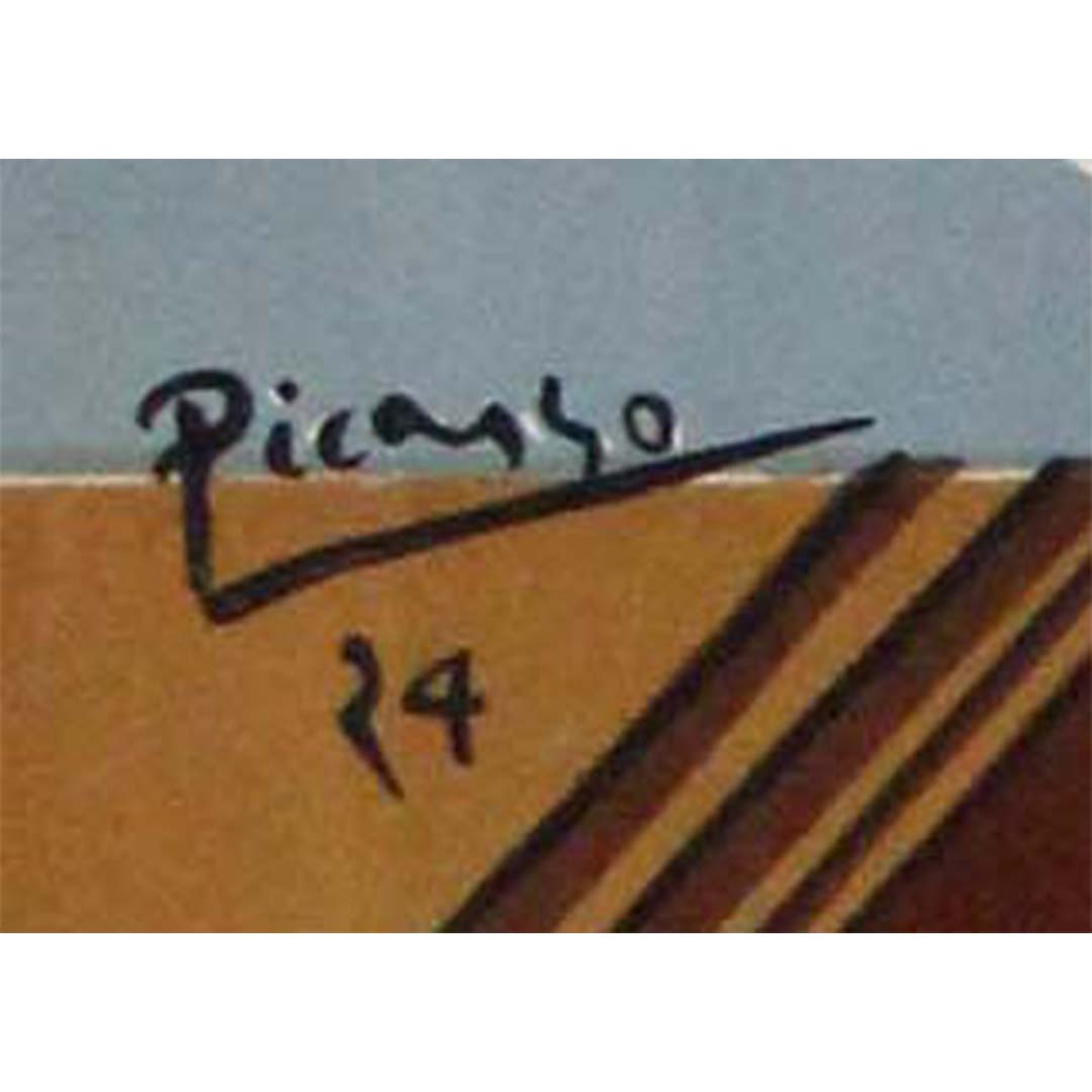 Dans le style caractéristique de Picasso, l'affiche présente un jeu dynamique de formes, de couleurs et de volumes qui captive le regard et intrigue. Le style cubiste si particulier de l'artiste est manifeste dans les figures fragmentées et les motifs abstraits qui peuplent la composition, invitant le spectateur à explorer les profondeurs de son imagination créatrice.
