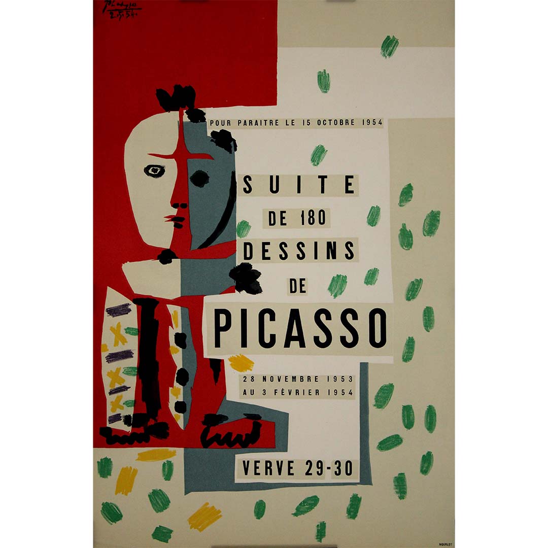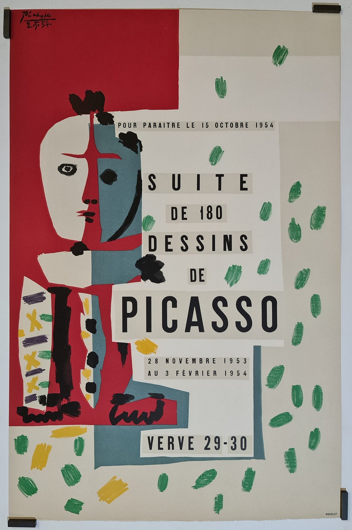 Cette affiche originale de 1954, créée par Pablo Picasso lui-même, annonce la parution de la Suite de 180 Dessins de Picasso , un numéro double spécial de la célèbre revue d'art Verve (n° 29-30). Ce recueil présente 180 œuvres dessinées par Picasso entre le 28 novembre 1953 et le 3 février 1954, offrant un aperçu de l'imagination fertile de l'artiste durant cette période prolifique.