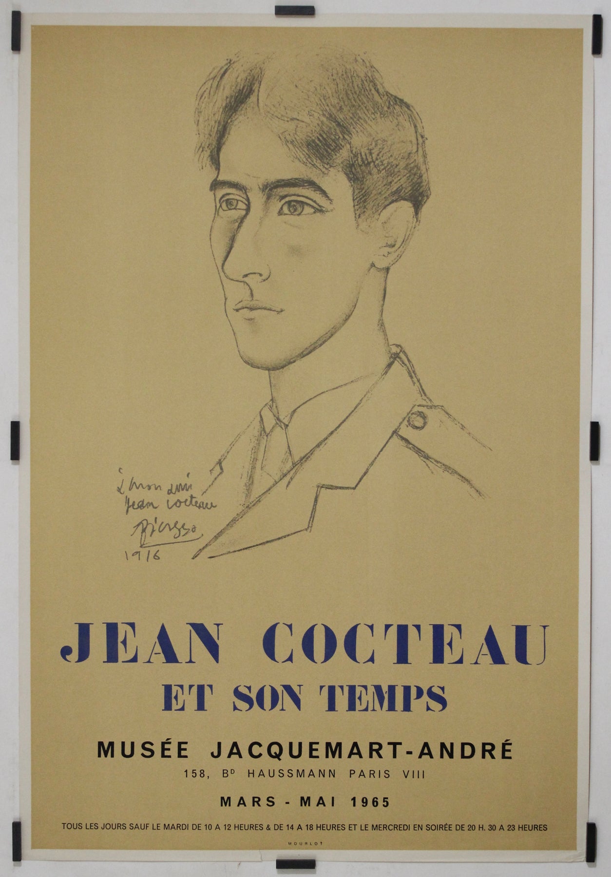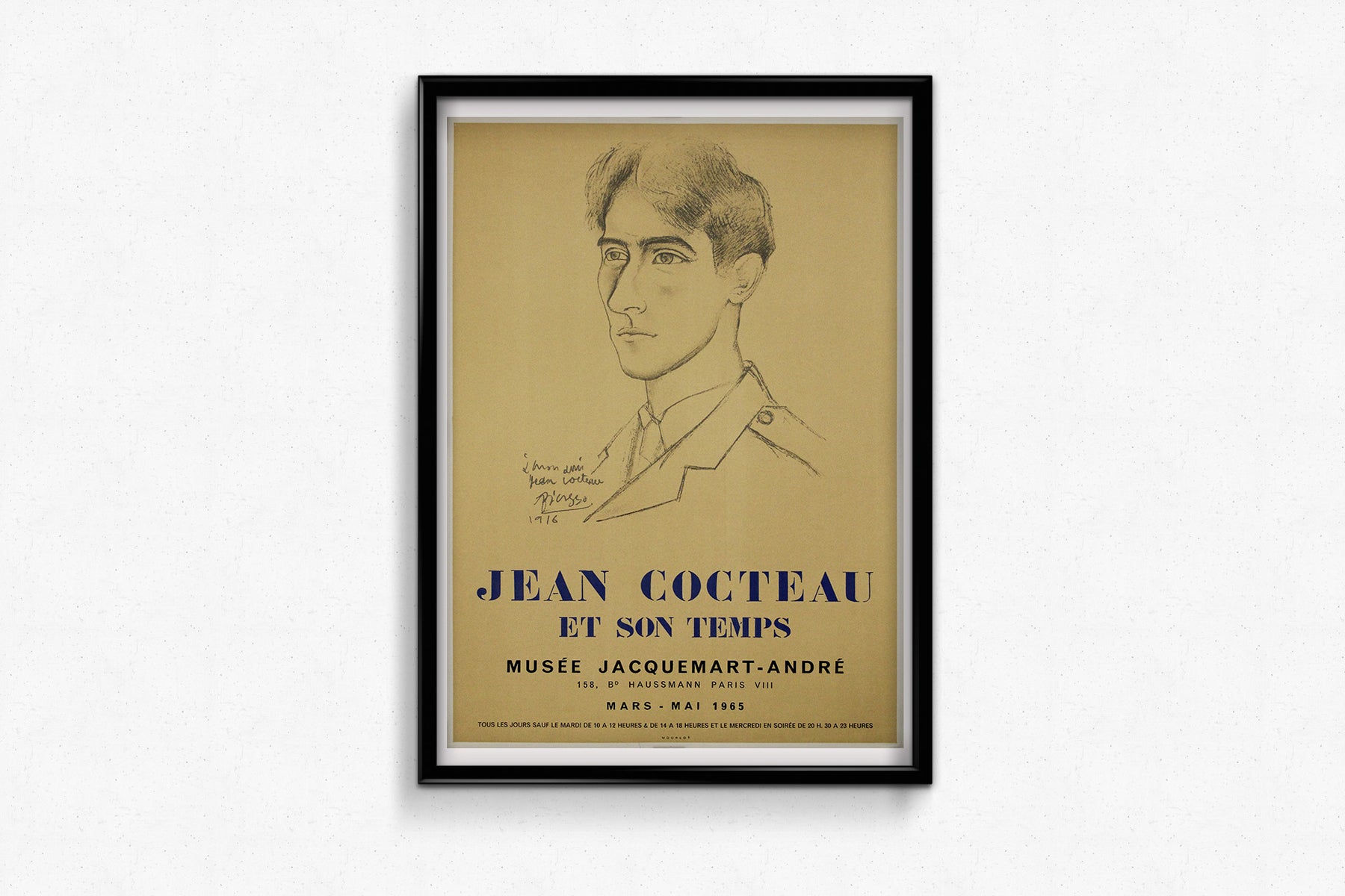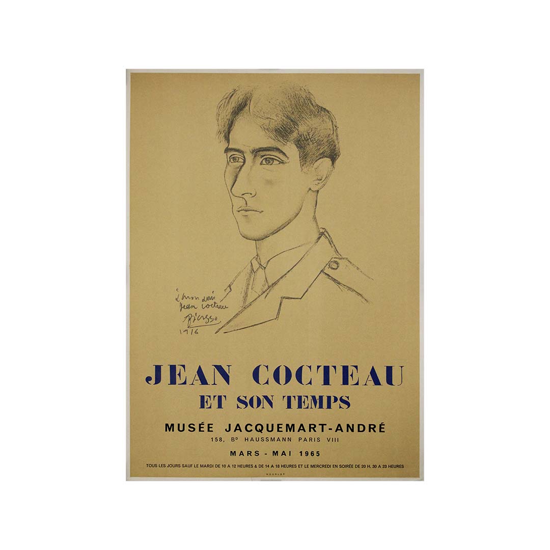 L'affiche présente un portrait de Jean Cocteau réalisé en 1916 par Pablo Picasso, un de ses proches amis et collaborateurs artistiques. Tracé au fusain avec une délicatesse expressive remarquable, le portrait capture l'intensité juvénile de Cocteau, son regard profond et son air de curiosité intellectuelle. L'inscription, écrite de la main de Picasso, « À mon ami Jean Cocteau » , souligne leur profonde affinité artistique.